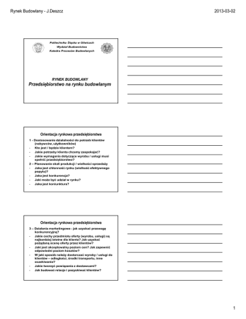 Rynek Budowlany - J.Deszcz 2013-03-02 Politechnika Śląska w Gliwicach Wydział Budownictwa Katedra Procesów Budowlanych RYNEK BUDOWLANY Przedsiębiorstwo na rynku budowlanym Orientacja rynkowa przedsiębiorstwa 1 - Dostosowanie działalności do potrzeb klientów (nabywców, użytkowników) - Kto jest / będzie klientem? - Jakie potrzeby klienta chcemy zaspokajać? - Jakie wymagania dotyczące wyrobu / usługi musi spełnić przedsiębiorstwo? 2 – Planowanie skali produkcji / wielkości sprzedaży - Jaka jest chłonność rynku (wielkość efektywnego popytu)? - Jaka jest konkurencja? - Jaki może być udział w rynku? - Jaka jest koniunktura? Orientacja rynkowa przedsiębiorstwa 3 – Działania marketingowe - jak uzyskać przewagę konkurencyjną? - Jakie cechy przedmiotu oferty (wyrobu, usługi) są najbardziej istotne dla klienta? Jak uzyskać pożądaną ocenę oferty przez klientów? - Jaki jest akceptowalny poziom cen? Jak zapewnić odpowiedni poziom kosztów? - W jaki sposób należy dostarczać wyroby / usługi do klientów – odległości, środki transportu, inne oczekiwania? - Jakie tworzyć powiązania z dostawcami? - Jak budować relacje i pozyskiwać klientów? 1 Rynek Budowlany - J.Deszcz 2013-03-02 Orientacja rynkowa = marketing Zespół zintegrowanych środków i działań mających na celu rozpoznanie i zaspokajanie potrzeb klientów dla obustronnej satysfakcji w sposób bardziej skuteczny i efektywny od konkurencji. Segmentacja rynku Podział (koncepcyjny) na grupy nabywców, do których są skierowane oferowane wyroby lub usługi, w dostosowaniu do specyficznych ich cech i potrzeb. Grupy składają się z podmiotów (osób lub jednostek gospodarczych) o bardzo podobnych potrzebach i możliwościach ich zaspokajania oraz np: -dążeniach, aspiracjach, -wieku, -zawodzie, -zainteresowaniach Instrumenty marketingowe Wyrób Cena Dystrybucja Promocja 2 Rynek Budowlany - J.Deszcz 2013-03-02 Wyrób Wyrób podstawowy – zasadnicza część wyrobu w której „zainstalowane” są wszystkie cechy użytkowe, istotne dla zaspokojenia potrzeb klienta Wyrób jako przedmiot sprzedaży –marka, opakowanie, styl, oznakowania wyrobu, certyfikaty itp. Dodatkowe cechy wpływające na decyzje zakupu – instalacja, gwarancje, dostawa, warunki i dostępność serwisu – wyrób globalny Cykl życia wyrobu Lansowanie Wzrost Dojrzałość Spadek L W D S Cena jako instrument marketingowy Ograniczenia poziomu ceny Górne – popyt Dolne – koszt wytwarzania Nawiązanie do średniego rynkowego poziomu cen 3 Rynek Budowlany - J.Deszcz 2013-03-02 Struktura ceny Jednostkowe koszty zmienne produkcji Koszty stałe przypadające na jednostkę wyrobu Koszty promocji Koszty dystrybucji (transport, magazynowanie, utrzymanie systemu itp.) Zysk Próg rentowności S K (S) Kz BEP kjz Kc cj x(P) n(P) Kalkulacja cen ofertowych w budownictwie Koszty bezpośrednie R+M+S Koszty pośrednie Kp Zysk i ryzyko 4 Rynek Budowlany - J.Deszcz 2013-03-02 Dystrybucja (logistyka marketingowa) Działania których celem jest zapewnienie, że wyrób zamówiony przez klienta zostanie dostarczony we właściwe miejsce w wymaganym (uzgodnionym) czasie za pomocą najbardziej właściwego środka transportu, najkrótszą drogą po możliwie najniższych kosztach oraz, że zachowane będą wszystkie jego właściwości jakościowe. Dystrybucja Kanały dystrybucji – długość i szerokość kanału dystrybucji Koszty dystrybucji KD = KS + KT + KMs +KMz + KU KD – całkowity koszt fizycznej dystrybucji KS – koszty sterowania dystrybucją KT – koszty transportu (włącznie z kosztami opakowania, ubezpieczeń itd.) KMs – stałe koszty utrzymania magazynów KMz – zmienne koszty przechowywania zapasów KU – utracone korzyści Promocja System komunikowania się przedsiębiorstwa z rynkiem docelowym i pozostałymi podmiotami mogącymi mieć wpływ na działalności firmy Adresaci – klienci i użytkownicy, pośrednicy handlowi, akcjonariusze, opinia publiczna, dostawcy, itd. 5 Rynek Budowlany - J.Deszcz 2013-03-02 Funkcje promocji Informowanie o ofercie, warunkach zakupu Kształtowanie wizerunku firmy Motywowanie nabywców (stymulowanie decyzji zakupu) Promocja Reklama Public relation Sprzedaż (promocja) osobista Inne formy aktywizacji sprzedaży Reklama Płatna , nieosobista forma prezentowania wyrobów, informowania o korzyściach wynikających z ich nabycia, zachęcania (motywowania) do zakupu 6 Rynek Budowlany - J.Deszcz 2013-03-02 Mechanizm reklamy Zwrócenie uwagi Doprowadzenie do poznania/akceptacji produktu Wytworzenie preferencji Wywołanie decyzji zakupu Cele reklamy Zapewnienie ciągłości sprzedaży Powiększenie udziału w rynku, pozyskanie nowych klientów Obrona przed konkurencją Zapoznanie z nowym wyrobem, wylansowanie Powiadomienie np. o obniżce cen inne Rodzaje reklamy Informacyjna Przypominająca Konkurencyjna Defensywna Agresywna Prestiżowa inne 7 Rynek Budowlany - J.Deszcz 2013-03-02 Reklama – formy i metody Strony www , ogłoszenia w portalach Filmy reklamowe Widowiska i imprezy reklamowe Reklama foniczna Reklama prasowa Druki reklamowe (firmowe i ofertowe informatory, katalogi, ulotki, prospekty) Reklama pocztowa (direct mail) Tablice, plakaty, plansze – reklama zewnętrzna („outdoor”) Inne (opakowania, upominki, wystawy) Reklama wyrobów konsumpcyjnych i produkcyjnych - różnic Konsumpcyjne Oddziaływanie na emocje, kształtowanie chęci naśladownictwa stylu, bezpieczeństwa, luksusu lub oszczędności, tradycji lub nowoczesności, zaspokojenia dążeń Produkcyjne Racjonalne argumenty dotyczące użyteczności, wydajności, obniżenia kosztów eksploatacji, trwałości, przewagi technologicznej nad konkurencją, Public relation (PR) Cel PR to kształtowanie i podtrzymywanie pozytywnego wizerunku firmy w otoczeniu, doskonalenie relacji z otoczeniem i podmiotami w nim funkcjonującymi. . 8 Rynek Budowlany - J.Deszcz 2013-03-02 Formy public relation (PR) Publicity – wpływanie n