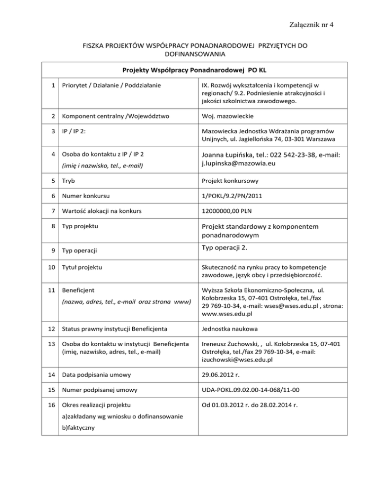 Załącznik nr 4 FISZKA PROJEKTÓW WSPÓŁPRACY PONADNARODOWEJ PRZYJĘTYCH DO DOFINANSOWANIA Projekty Współpracy Ponadnarodowej PO KL 1 Priorytet / Działanie / Poddziałanie IX. Rozwój wykształcenia i kompetencji w regionach/ 9.2. Podniesienie atrakcyjności i jakości szkolnictwa zawodowego. 2 Komponent centralny /Województwo Woj. mazowieckie 3 IP / IP 2: Mazowiecka Jednostka Wdrażania programów Unijnych, ul. Jagiellooska 74, 03-301 Warszawa 4 Osoba do kontaktu z IP / IP 2 Joanna Łupioska, tel.: 022 542-23-38, e-mail: [email protected] (imię i nazwisko, tel., e-mail) 5 Tryb Projekt konkursowy 6 Numer konkursu 1/POKL/9.2/PN/2011 7 Wartośd alokacji na konkurs 12000000,00 PLN 8 Typ projektu Projekt standardowy z komponentem ponadnarodowym 9 Typ operacji Typ operacji 2. 10 Tytuł projektu Skutecznośd na rynku pracy to kompetencje zawodowe, język obcy i przedsiębiorczośd. 11 Beneficjent Wyższa Szkoła Ekonomiczno-Społeczna, ul. Kołobrzeska 15, 07-401 Ostrołęka, tel./fax 29 769-10-34, e-mail: [email protected] , strona: www.wses.edu.pl (nazwa, adres, tel., e-mail oraz strona www) 12 Status prawny instytucji Beneficjenta Jednostka naukowa 13 Osoba do kontaktu w instytucji Beneficjenta (imię, nazwisko, adres, tel., e-mail) Ireneusz Żuchowski, , ul. Kołobrzeska 15, 07-401 Ostrołęka, tel./fax 29 769-10-34, e-mail: [email protected] 14 Data podpisania umowy 29.06.2012 r. 15 Numer podpisanej umowy UDA-POKL.09.02.00-14-068/11-00 16 Okres realizacji projektu Od 01.03.2012 r. do 28.02.2014 r. a)zakładany wg wniosku o dofinansowanie b)faktyczny Załącznik nr 4 17 Zakontraktowany budżet projektu 18 Partnerzy ponadnarodowi 700667,00 PLN EU-Consult Südthüringen gGmbH, Pfütschbergstraße 10, 98527 Suhl, Niemcy jest spółką z o.o non-profit – prowadzi biura współpracy europejskiej, również prowadzi projekty finansowane z Europejskiego Funduszu Społecznego. Obecnie Eu- Consult realizuje z pomocą paostw z całej Europy pilotażowy projekt “Transnational-Dual” . Celem tego projektu jest otwarcie Niemiec na dwustronną edukacje. Młodzi absolwenci ze szkół znajdujących się w partnerskich regionach oraz paostwach maja możliwośd podjęcia praktyki zgodnej z prawem niemieckim. Dla potrzeb realizacji projektu współpracujemy ściśle z jednym z ich biur w Turyngii - European Career Center Efrurt Europa Service Büro für Mittelthüringen Westliches Wachhaus, Regierungsstraβe 6, 99084 Erfurt. Biuro zaczęło swoją pracę w 2003 r. jako projekt europejski, który pomagał absolwentom w szukaniu pracy w Europie. Od roku 2008 są członkiem sieci „Europa Service” w Turyngii, która promuje transgraniczną i międzyregionalną współpracę. Proponują własne projekty w Turyngii poprzez program „Uczymy się na całe życie” (Leonardo da Vinci, Comenius, Grundtvig) i programy n.p. Band (NiemcyHolandia), GJOR DET (Niemcy-Norwegia) itd. Szukają miejsc praktyk i staży w Europie, pomagają przedsiębiorstwom i szkołom z Europy w odnajdywaniu w Turyngii partnerów do współpracy. Zajmują się doradztwem i pośrednictwem w zakresie podjęcia pracy, kontynuacji edukacji, wizyt studyjnych i staży w Europie. Wdrażają własne projekty, a także pomagają instytucjom edukacyjnym i firmom w realizacji ich wniosków projektowych. Współpracują z partnerami w Europie i Turyngii m.in. der Landesentwicklungsgesellschaft Thüringen (LEG), Gesellschaft für Arbeits- und Wirtschaftsförderung (GfAW), Thüringer Załącznik nr 4 19 Partnerzy krajowi (jeśli dotyczy) Ministerium für Wirtschaft, Technologie und Arbeit (TMWTA), Thüringer Ministerium für Soziales, Familie und Gesundheit (TMSFG), Thüringer Ministerium für Bildung Wissenschaft und Kultur (TMBWK), Europäisches Informations-Zentrum Thüringen (EIZ), Handwerkskammer Erfurt (HWK), Leonardo-Büro Thüringen, Zentrale Auslands- und Fachvermittlung Erfurt, Arbeit und Leben Thüringen e.V., Career Service Netzwerk Thüringen, Bundesverband mittelständische Wirtschaft e.V (BVMW), HOGA-Ausbildungsverbund e.V., Kultusministerium Thüringen. 1. Agencja Rozwoju Regionalnego Spółka z o.o. , ul. Kilioskiego 10, 07-410 Ostrołęka głównymi celami statutowymi Agencji są: - wspieranie istniejących i inicjowanie nowych działao ze szczególnym ich ukierunkowaniem na tworzenie nowych miejsc pracy, prowadzenie działao na rynku pracy, rozwój przedsiębiorczości, działania na rzecz integracji społecznej i zawodowej osób i grup wymagających wsparcia, wprowadzanie menedżerskiego modelu zarządzania, osiąganie dużej efektywności i rentowności przedsięwzięd, realizację produkcji nowoczesnych wyrobów i technologii, wspieranie rozwoju lokalnego i regionalnego. - inspirowanie związków pomiędzy podmiotami krajowymi i zagranicznymi w zakresie działalności gospodarczej i innych celów. Przedmiotem działalności Spółki jest świadczenie usług informacyjnych, doradczych, szkoleniowych i finansowych wspierających przemiany gospodarcze oraz rozwój przedsiębiorczości, opracowanie i wdrażanie projektów wymagających wsparcia finansowego, doradztwa i oceny przedsięwzięd. 2. Miasto Ostrołęka, ul. Plac Bema 1, 07-410 Ostrołęka – wspólnota samorządowa – gmina. Wybór tego partnera podyktowany został jego kompleksową wiedzą na temat potrzeb grupy docelowej, posiadaniem analiz ilościowych. Załącznik nr 4 20 Zwięzły opis charakteru i zakresu współpracy ponadnarodowej ( maks. 10 zdao) Współpraca ponadnarodowa ma na celu poznanie systemu kształcenia zawodowego w landzie Turyngia. Informacja ta zostanie wykorzystana w celu opracowania analizy mocnych i słabych stron polskiego systemu kształcenia zawodowego. Pozwoli to na opracowanie i wdrożenie w szkołach zawodowych programów rozwojowych uwzględniających przeprowadzenie praktyk zawodowych w firmach niemieckich. Partner ponadnarodowy uczestniczy w organizacji wizyty studyjnej w Niemczech oraz zapewnia organizację praktyk zawodowych