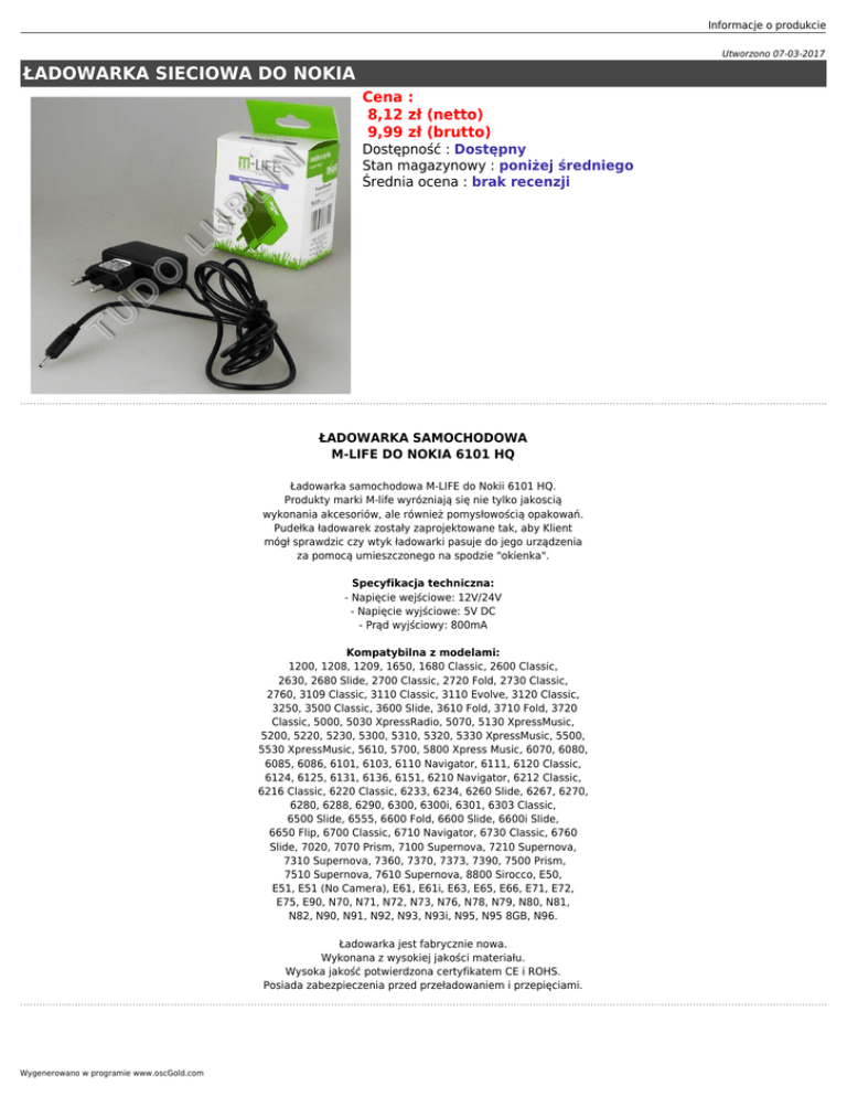 Informacje o produkcie Utworzono 07-03-2017 ŁADOWARKA SIECIOWA DO NOKIA Cena : 8,12 zł (netto) 9,99 zł (brutto) Dostępność : Dostępny Stan magazynowy : poniżej średniego Średnia ocena : brak recenzji ŁADOWARKA SAMOCHODOWA M-LIFE DO NOKIA 6101 HQ Ładowarka samochodowa M-LIFE do Nokii 6101 HQ. Produkty marki M-life wyrózniają się nie tylko jakoscią wykonania akcesoriów, ale również pomysłowością opakowań. Pudełka ładowarek zostały zaprojektowane tak, aby Klient mógł sprawdzic czy wtyk ładowarki pasuje do jego urządzenia za pomocą umieszczonego na spodzie "okienka". Specyfikacja techniczna: - Napięcie wejściowe: 12V/24V - Napięcie wyjściowe: 5V DC - Prąd wyjściowy: 800mA Kompatybilna z modelami: 1200, 1208, 1209, 1650, 1680 Classic, 2600 Classic, 2630, 2680 Slide, 2700 Classic, 2720 Fold, 2730 Classic, 2760, 3109 Classic, 3110 Classic, 3110 Evolve, 3120 Classic, 3250, 3500 Classic, 3600 Slide, 3610 Fold, 3710 Fold, 3720 Classic, 5000, 5030 XpressRadio, 5070, 5130 XpressMusic, 5200, 5220, 5230, 5300, 5310, 5320, 5330 XpressMusic, 5500, 5530 XpressMusic, 5610, 5700, 5800 Xpress Music, 6070, 6080, 6085, 6086, 6101, 6103, 6110 Navigator, 6111, 6120 Classic, 6124, 6125, 6131, 6136, 6151, 6210 Navigator, 6212 Classic, 6216 Classic, 6220 Classic, 6233, 6234, 6260 Slide, 6267, 6270, 6280, 6288, 6290, 6300, 6300i, 6301, 6303 Classic, 6500 Slide, 6555, 6600 Fold, 6600 Slide, 6600i Slide, 6650 Flip, 6700 Classic, 6710 Navigator, 6730 Classic, 6760 Slide, 7020, 7070 Prism, 7100 Supernova, 7210 Supernova, 7310 Supernova, 7360, 7370, 7373, 7390, 7500 Prism, 7510 Supernova, 7610 Supernova, 8800 Sirocco, E50, E51, E51 (No Camera), E61, E61i, E63, E65, E66, E71, E72, E75, E90, N70, N71, N72, N73, N76, N78, N79, N80, N81, N82, N90, N91, N92, N93, N93i, N95, N95 8GB, N96. Ładowarka jest fabrycznie nowa. Wykonana z wysokiej jakości materiału. Wysoka jakość potwierdzona certyfikatem CE i ROHS. Posiada zabezpieczenia przed przeładowaniem i przepięciami. Wygenerowano w programie www.oscGold.com