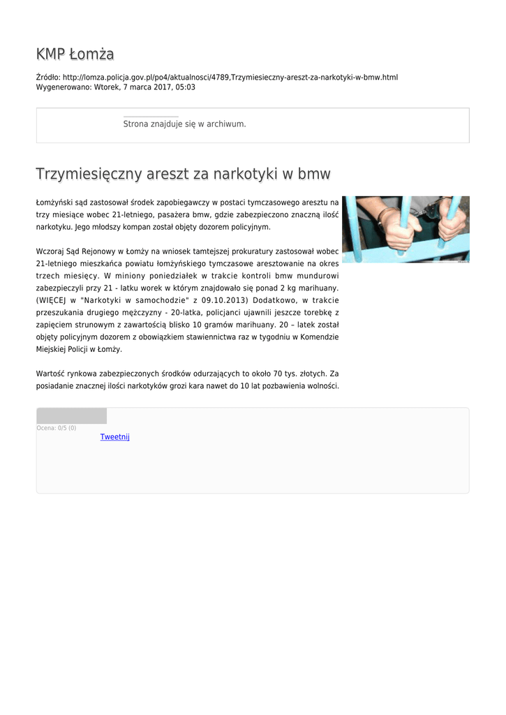 KMP Łomża Źródło: http://lomza.policja.gov.pl/po4/aktualnosci/4789,Trzymiesieczny-areszt-za-narkotyki-w-bmw.html Wygenerowano: Wtorek, 7 marca 2017, 05:03 Strona znajduje się w archiwum. Trzymiesięczny areszt za narkotyki w bmw Łomżyński sąd zastosował środek zapobiegawczy w postaci tymczasowego aresztu na trzy miesiące wobec 21-letniego, pasażera bmw, gdzie zabezpieczono znaczną ilość narkotyku. Jego młodszy kompan został objęty dozorem policyjnym. Wczoraj Sąd Rejonowy w Łomży na wniosek tamtejszej prokuratury zastosował wobec 21-letniego mieszkańca powiatu łomżyńskiego tymczasowe aresztowanie na okres trzech miesięcy. W miniony poniedziałek w trakcie kontroli bmw mundurowi zabezpieczyli przy 21 - latku worek w którym znajdowało się ponad 2 kg marihuany. (WIĘCEJ w "Narkotyki w samochodzie" z 09.10.2013) Dodatkowo, w trakcie przeszukania drugiego mężczyzny - 20-latka, policjanci ujawnili jeszcze torebkę z zapięciem strunowym z zawartością blisko 10 gramów marihuany. 20 – latek został objęty policyjnym dozorem z obowiązkiem stawiennictwa raz w tygodniu w Komendzie Miejskiej Policji w Łomży. Wartość rynkowa zabezpieczonych środków odurzających to około 70 tys. złotych. Za posiadanie znacznej ilości narkotyków grozi kara nawet do 10 lat pozbawienia wolności. Ocena: 0/5 (0) Tweetnij