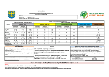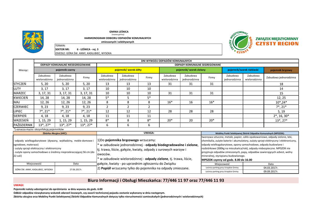 GMINA LEŚNICA (nazwa gminy) HARMONOGRAM ODBIORU ODPADÓW KOMUNALNYCH zmieszanych i selektywnych TERMIN: SEKTOR NR: 6 - LEŚNICA - rej. 3 OSIEDLE: GÓRA ŚW. ANNY, KADŁUBIEC, WYSOKA DNI WYWOZU ODPADÓW KOMUNALNYCH ODPADY KOMUNALNE SEGREGOWANE ODPADY KOMUNALNE NIESEGREGOWANE pojemnik czarny Miesiąc: STYCZEO LUTY MARZEC KWIECIEO MAJ CZERWIEC LIPIEC SIERPIEO WRZESIEO PAŹDZIERNIK pojemnik/ worek żółty pojemnik/ worek zielony Zabudowa wielorodzinna Zabudowa jednorodzinna Firmy Zabudowa wielorodzinna Zabudowa jednorodzinna Firmy 5, 20 3, 17 3, 17, 31 14, 28 12, 26 9, 23 7*, 21* 4, 18 1, 15, 29 13*, 27* 5, 20 3, 17 3, 17, 31 14, 28 12, 26 9, 23 7*, 21* 4, 18 1, 15, 29 13*, 27* 5, 20 3, 17 3, 17, 31 14, 28 12, 26 9, 23 7*, 21* 4, 18 1, 15, 29 13*, 27* 13 10 10 5* 8 2 12 11 8* 6 13 10 10 5 8 2 12 11 8 6 13 10 10 5* 8 2 12 11 8* 6 pojemnik/worek niebieski Zabudowa wielorodzinna Zabudowa jednorodzinna Firmy 31 31 31 31 31 31 16* 16 16* 28 28 28 20* 20 20* Zabudowa jednorodzinna Zabudowa wielorodzinna pojemnik brązowy Zabudowa jednorodzinna 18 14 15 12, 25 10*,24* 7*, 21* 5, 19 2*, 16, 30* 13*, 27* *) oznacza mycie i dezynfekcję pojemników UWAGA: Zbiórka Akcyjna (AKC): - odpady wielkogabarytowe (dywany, wykładziny, meble domowe i ogrodowe, materace) - zużyty sprzęt elektryczny i elektroniczny - zużyte opony samochodowe o średnicy nieprzekraczającej 56 cm (do 22 cali) Miejscowośd Data GÓRA ŚW. ANNY, KADŁUBIEC, WYSOKA 27.06.2017r. Mobilny Punkt Selektywnej Zbiórki Odpadów Komunalnych (MPSZOK): tworzywa sztuczne, metale, papier, szkło opakowaniowe, odpady zielone, leki, chemikalia, zużyte baterie i akumulatory, zużyty sprzęt elektryczny i elektroniczny, odpady wielkogabarytowe, opony samochodowe, odpady budowlane i rozbiórkowe (300kg na mieszkaoca/rok), odpady niebezpieczne. MPSZOK nie przyjmuje odpadów zmieszanych, papy, odpadów zawierających azbest, wełny mineralnej, styropianu budowlanego. 1)Do pojemnika brązowego wrzucamy: * w zabudowie jednorodzinnej - odpady biodegradowalne i zielone, tj. trawa, liście, gałęzie, kwiaty, odpady z surowych warzyw i owoców. * w zabudowie wielorodzinnej - odpady zielone, tj. trawa, liście, MPSZOK czynny od godz. 8.00 do 16.00 gałęzie, kwiaty - po uprzednim zgłoszeniu do Związku Miejscowośd Leśnica parking przy Urzędzie Gminy 2) Popiół wrzucamy tylko do pojemnika na odpady zmieszane. Leśnica parking przy Urzędzie Gminy Biuro Informacji i Obsługi Mieszkaoca: 77/446 11 97 oraz 77/446 11 93 UWAGI: Pojemniki należy udostępniad do opróżniania w dniu wywozu do godz. 6:00 Odbiór odpadów niewykonany wskutek zdarzeo losowych, czy awarii technicznej pojazdu zostanie wykonany w dniu następnym. Zbiórka akcyjna oraz Mobilny Punkt Selektywnej Zbiórki Odpadów Komunalnych dotyczy tylko nieruchomości zamieszkałych (jednorodzinnych i wielorodzinnych) Data 04.03.2017r. 09.09.2017r.