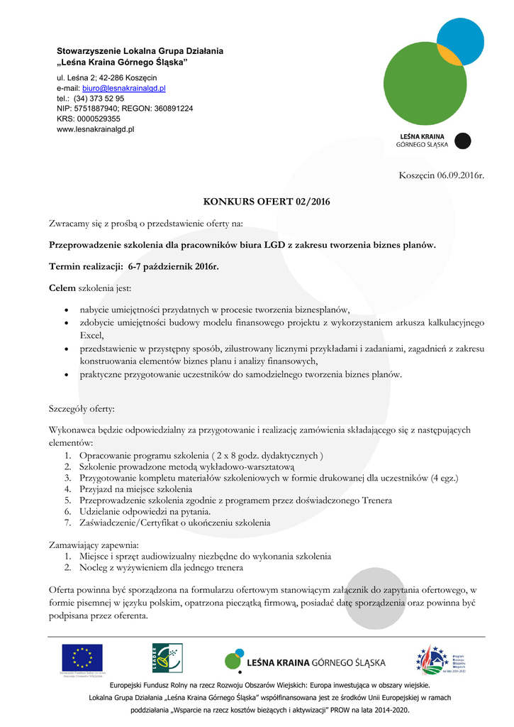 Stowarzyszenie Lokalna Grupa Działania „Leśna Kraina Górnego Śląska” ul. Leśna 2; 42-286 Koszęcin e-mail: [email protected] tel.: (34) 373 52 95 NIP: 5751887940; REGON: 360891224 KRS: 0000529355 www.lesnakrainalgd.pl Koszęcin 06.09.2016r. KONKURS OFERT 02/2016 Zwracamy się z prośbą o przedstawienie oferty na: Przeprowadzenie szkolenia dla pracowników biura LGD z zakresu tworzenia biznes planów. Termin realizacji: 6-7 październik 2016r. Celem szkolenia jest: nabycie umiejętności przydatnych w procesie tworzenia biznesplanów, zdobycie umiejętności budowy modelu finansowego projektu z wykorzystaniem arkusza kalkulacyjnego Excel, przedstawienie w przystępny sposób, zilustrowany licznymi przykładami i zadaniami, zagadnień z zakresu konstruowania elementów biznes planu i analizy finansowych, praktyczne przygotowanie uczestników do samodzielnego tworzenia biznes planów. Szczegóły oferty: Wykonawca będzie odpowiedzialny za przygotowanie i realizację zamówienia składającego się z następujących elementów: 1. Opracowanie programu szkolenia ( 2 x 8 godz. dydaktycznych ) 2. Szkolenie prowadzone metodą wykładowo-warsztatową 3. Przygotowanie kompletu materiałów szkoleniowych w formie drukowanej dla uczestników (4 egz.) 4. Przyjazd na miejsce szkolenia 5. Przeprowadzenie szkolenia zgodnie z programem przez doświadczonego Trenera 6. Udzielanie odpowiedzi na pytania. 7. Zaświadczenie/Certyfikat o ukończeniu szkolenia Zamawiający zapewnia: 1. Miejsce i sprzęt audiowizualny niezbędne do wykonania szkolenia 2. Nocleg z wyżywieniem dla jednego trenera Oferta powinna być sporządzona na formularzu ofertowym stanowiącym załącznik do zapytania ofertowego, w formie pisemnej w języku polskim, opatrzona pieczątką firmową, posiadać datę sporządzenia oraz powinna być podpisana przez oferenta. Europejski Fundusz Rolny na rzecz Rozwoju Obszarów Wiejskich: Europa inwestująca w obszary wiejskie. Lokalna Grupa Działania „Leśna Kraina Górnego Śląska” współfinansowana jest ze środków Unii Europejskiej w ramach poddziałania „Wsparcie na rzecz kosztów bieżących i aktywizacji” PROW na lata 2014-2020. Stowarzyszenie Lokalna Grupa Działania „Leśna Kraina Górnego Śląska” ul. Leśna 2; 42-286 Koszęcin e-mail: [email protected] tel.: (34) 373 52 95 NIP: 5751887940; REGON: 360891224 KRS: 0000529355 www.lesnakrainalgd.pl Do oferty powinien być dołączony proponowany program szkolenia, opis doświadczenia oferenta oraz referencje. Oferta powinna być przesłana za pośrednictwem poczty elektronicznej na maila : [email protected] Termin składania ofert upływa w dniu: 16-09-2016r. , do godz. 10.00 (ostateczna data wpływu do biura Stowarzyszenia) Niniejszy konkurs ofert nie jest zamówieniem i otrzymanie od Państwa oferty nie powoduje powstania żadnych zobowiązań wobec stron. Zamawiający zastrzega sobie prawo do zaproszenia wytypowanych przez siebie 3 oferentów do przeprowadzenia rozmów na temat oferty i ustalenia ostatecznej ceny. O ewentualnym wybraniu Państwa oferty zostaniecie Państwo poinformowani telefonicznie. Europejski Fundusz Rolny na rzecz Rozwoju Obszarów Wiejskich: Europa inwestująca w obszary wiejskie. Lokalna Grupa Działania „Leśna Kraina Górnego Śląska” współfinansowana jest ze środków Unii Europejskiej w ramach poddziałania „Wsparcie na rzecz kosztów bieżących i aktywizacji” PROW na lata 2014-2020.
