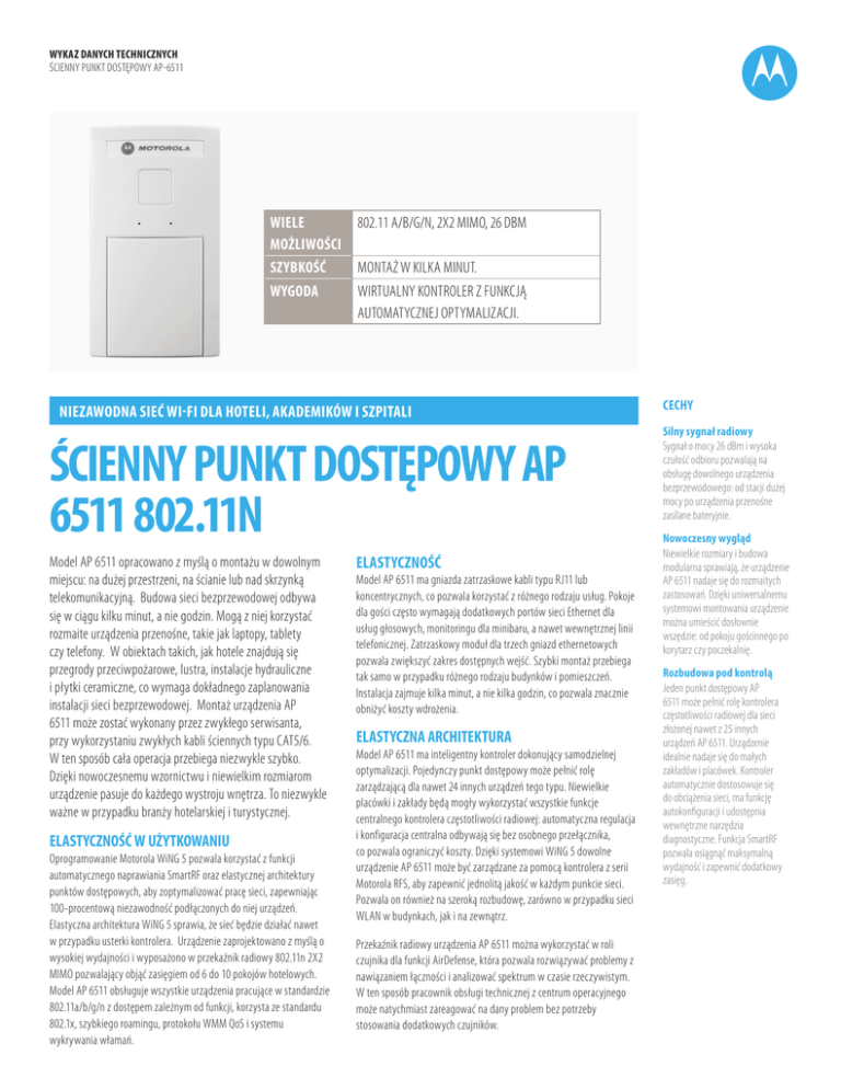 WYKAZ DANYCH TECHNICZNYCH ŚCIENNY PUNKT DOSTĘPOWY AP-6511 WIELE MOŻLIWOŚCI SZYBKOŚĆ WYGODA 802.11 A/B/G/N, 2X2 MIMO, 26 DBM MONTAŻ W KILKA MINUT. WIRTUALNY KONTROLER Z FUNKCJĄ AUTOMATYCZNEJ OPTYMALIZACJI. NIEZAWODNA SIEĆ WI-FI DLA HOTELI, AKADEMIKÓW I SZPITALI ŚCIENNY PUNKT DOSTĘPOWY AP 6511 802.11N Model AP 6511 opracowano z myślą o montażu w dowolnym miejscu: na dużej przestrzeni, na ścianie lub nad skrzynką telekomunikacyjną. Budowa sieci bezprzewodowej odbywa się w ciągu kilku minut, a nie godzin. Mogą z niej korzystać rozmaite urządzenia przenośne, takie jak laptopy, tablety czy telefony. W obiektach takich, jak hotele znajdują się przegrody przeciwpożarowe, lustra, instalacje hydrauliczne i płytki ceramiczne, co wymaga dokładnego zaplanowania instalacji sieci bezprzewodowej. Montaż urządzenia AP 6511 może zostać wykonany przez zwykłego serwisanta, przy wykorzystaniu zwykłych kabli ściennych typu CAT5/6. W ten sposób cała operacja przebiega niezwykle szybko. Dzięki nowoczesnemu wzornictwu i niewielkim rozmiarom urządzenie pasuje do każdego wystroju wnętrza. To niezwykle ważne w przypadku branży hotelarskiej i turystycznej. ELASTYCZNOŚĆ W UŻYTKOWANIU Oprogramowanie Motorola WiNG 5 pozwala korzystać z funkcji automatycznego naprawiania SmartRF oraz elastycznej architektury punktów dostępowych, aby zoptymalizować pracę sieci, zapewniając 100-procentową niezawodność podłączonych do niej urządzeń. Elastyczna architektura WiNG 5 sprawia, że sieć będzie działać nawet w przypadku usterki kontrolera. Urządzenie zaprojektowano z myślą o wysokiej wydajności i wyposażono w przekaźnik radiowy 802.11n 2X2 MIMO pozwalający objąć zasięgiem od 6 do 10 pokojów hotelowych. Model AP 6511 obsługuje wszystkie urządzenia pracujące w standardzie 802.11a/b/g/n z dostępem zależnym od funkcji, korzysta ze standardu 802.1x, szybkiego roamingu, protokołu WMM QoS i systemu wykrywania włamań. ELASTYCZNOŚĆ Model AP 6511 ma gniazda zatrzaskowe kabli typu RJ11 lub koncentrycznych, co pozwala korzystać z różnego rodzaju usług. Pokoje dla gości często wymagają dodatkowych portów sieci Ethernet dla usług głosowych, monitoringu dla minibaru, a nawet wewnętrznej linii telefonicznej. Zatrzaskowy moduł dla trzech gniazd ethernetowych pozwala zwiększyć zakres dostępnych wejść. Szybki montaż przebiega tak samo w przypadku różnego rodzaju budynków i pomieszczeń. Instalacja zajmuje kilka minut, a nie kilka godzin, co pozwala znacznie obniżyć koszty wdrożenia. ELASTYCZNA ARCHITEKTURA Model AP 6511 ma inteligentny kontroler dokonujący samodzielnej optymalizacji. Pojedynczy punkt dostępowy może pełnić rolę zarządzającą dla nawet 24 innych urządzeń tego typu. Niewielkie placówki i zakłady będą mogły wykorzystać wszystkie funkcje centralnego kontrolera częstotliwości radiowej: automatyczna regulacja i konfiguracja centralna odbywają się bez osobnego przełącznika, co pozwala ograniczyć koszty. Dzięki systemowi WiNG 5 dowolne urządzenie AP 6511 może być zarządzane za pomocą kontrolera z serii Motorola RFS, aby zapewnić jednolitą jakość w każdym punkcie sieci. Pozwala on również na szeroką rozbudowę, zarówno w przypadku sieci WLAN w budynkach, jak i na zewnątrz. Przekaźnik radiowy urządzenia AP 6511 można wykorzystać w roli czujnika dla funkcji AirDefense, która pozwala rozwiązywać problemy z nawiązaniem łączności i analizować spektrum w czasie rzeczywistym. W ten sposób pracownik obsługi technicznej z centrum operacyjnego może natychmiast zareagować na dany problem bez potrzeby stosowania dodatkowych czujników. CECHY Silny sygnał radiowy Sygnał o mocy 26 dBm i wysoka czułość odbioru pozwalają na obsługę dowolnego urządzenia bezprzewodowego: od stacji dużej mocy po urządzenia przenośne zasilane bateryjnie. Nowoczesny wygląd Niewielkie rozmiary i budowa modularna sprawiają, że urządzenie AP 6511 nadaje się do rozmaitych zastosowań. Dzięki uniwersalnemu systemowi montowania urządzenie można umieścić dosłownie wszędzie: od pokoju gościnnego po korytarz czy poczekalnię. Rozbudowa pod kontrolą Jeden punkt dostępowy AP 6511 może pełnić rolę kontrolera częstotliwości radiowej dla sieci złożonej nawet z 25 innych urządzeń AP 6511. Urządzenie idealnie nadaje się do małych zakładów i placówek. Kontroler automatycznie dostosowuje się do obciążenia sieci, ma funkcję autokonfiguracji i udostępnia wewnętrzne narzędzia diagnostyczne. Funkcja SmartRF pozwala osiągnąć maksymalną wydajność i zapewnić dodatkowy zasięg. STRONA 1 WYKAZ DANYCH TECHNICZNYCH ŚCIENNY PUNKT DOSTĘPOWY AP-6511 DANE TECHNICZNE URZĄDZENIA AP 6511 DOSTĘPNE RODZAJE INTERFEJSU Interfejs bezprzewodowy Pojedynczy przekaźnik radiowy: 802.11a/b/g/n; 2,4 GHz lub 5,2 GHz Port sieci LAN Ethernet Standard IEEE 802.3 10/100 Mb, automatyczne wykrywanie z użyciem złącza 8-stykowego Port LAN Ethernet łączący z siecią Standard IEEE 802.3 10/100 Mb, automatyczne wykrywanie Gniazdo z zatrzaskiem Obsługa dowolnych złączy typu Keystone lub QuickPort®* AP-6511-60010-WR Pojedynczy radiowy, ścienny punkt dostępowy 802.11a/b/g/n. Niewielkie rozmiary. Jeden port Ethernet łączący z siecią, jeden port FE LAN. Dodatkowy moduł gniazd typu Ethernet. Funkcja kontrolera częstotliwości radiowej w zestawie. Wersja WR obsługuje zestawy kanałów dla poszczególnych krajów. KT-6511-0000D-WR Moduł z trzema gniazdami szybkiej sieci Ethernet dla modelu AP-6511 PARAMETRY ŁĄCZNOŚCI BEZPRZEWODOWEJ 8 numerów BSSID, 16 nazw SSID Wirtualny punkt dostępowy Na każdy przekaźnik sieci WLAN, odcięcie klienta, nazwa SSID uwierzytelnianie, szyfrowanie, prędkość przesyłania, identyfikator VLAN ID, WMM 4000 sieci VLAN; identyfikatory od 1 do 4095 Metoda transmisji DSSS, OFDM, MIMO Standardy 802.11a, 802.11b, 802.11g, 802.11n wersja wstępna 2.0 Sieci VLAN Prędkości t
