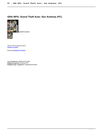 PC : GRA NPG: Grand Theft Auto: San Andreas (PC) GRA NPG: Grand Theft Auto: San Andreas (PC) GMCBPCAG3200 Ocena: Nie ma jeszcze oceny Zapytaj o produkt ProducentCENEGA POLSKA Opis Producent: CENEGA POLSKA Platforma (sprz?t): Komputer PC Kategoria gry / programu: AkcjaSamochodowa 1 / 1 Powered by TCPDF (www.tcpdf.org)