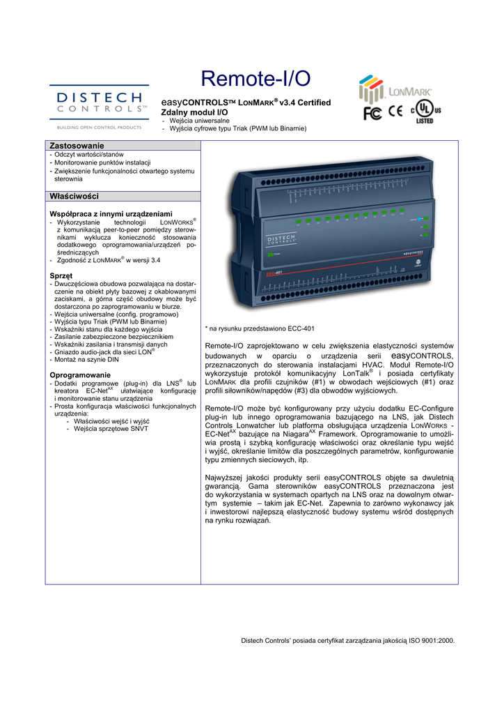 Remote-I/O easyCONTROLS™ LONMARK® v3.4 Certified Zdalny moduł I/O - Wejścia uniwersalne - Wyjścia cyfrowe typu Triak (PWM lub Binarnie) Zastosowanie - Odczyt wartości/stanów - Monitorowanie punktów instalacji - Zwiększenie funkcjonalności otwartego systemu sterownia Właściwości Współpraca z innymi urządzeniami ® - Wykorzystanie technologii LONW ORKS z komunikacją peer-to-peer pomiędzy sterownikami wyklucza konieczność stosowania dodatkowego oprogramowania/urządzeń pośredniczących ® - Zgodność z LONMARK w wersji 3.4 Sprzęt - Dwuczęściowa obudowa pozwalająca na dostarczenie na obiekt płyty bazowej z okablowanymi zaciskami, a górna część obudowy może być dostarczona po zaprogramowaniu w biurze. - Wejścia uniwersalne (config. programowo) - Wyjścia typu Triak (PWM lub Binarnie) - Wskaźniki stanu dla każdego wyjścia - Zasilanie zabezpieczone bezpiecznikiem - Wskaźniki zasilania i transmisji danych ® - Gniazdo audio-jack dla sieci LON - Montaż na szynie DIN Oprogramowanie ® - Dodatki programowe (plug-in) dla LNS lub AX kreatora EC-Net ułatwiające konfigurację i monitorowanie stanu urządzenia - Prosta konfiguracja właściwości funkcjonalnych urządzenia: - Właściwości wejść i wyjść - Wejścia sprzętowe SNVT * na rysunku przedstawiono ECC-401 Remote-I/O zaprojektowano w celu zwiększenia elastyczności systemów budowanych w oparciu o urządzenia serii easyCONTROLS, przeznaczonych do sterowania instalacjami HVAC. Moduł Remote-I/O ® wykorzystuje protokół komunikacyjny LonTalk i posiada certyfikaty LONMARK dla profili czujników (#1) w obwodach wejściowych (#1) oraz profili siłowników/napędów (#3) dla obwodów wyjściowych. Remote-I/O może być konfigurowany przy użyciu dodatku EC-Configure plug-in lub innego oprogramowania bazującego na LNS, jak Distech Controls Lonwatcher lub platforma obsługująca urządzenia LONWORKS AX AX EC-Net bazujące na Niagara Framework. Oprogramowanie to umożliwia prostą i szybką konfigurację właściwości oraz określanie typu wejść i wyjść, określanie limitów dla poszczególnych parametrów, konfigurowanie typu zmiennych sieciowych, itp. Najwyższej jakości produkty serii easyCONTROLS objęte sa dwuletnią gwarancją. Gama sterowników easyCONTROLS przeznaczona jest do wykorzystania w systemach opartych na LNS oraz na dowolnym otwartym systemie – takim jak EC-Net. Zapewnia to zarówno wykonawcy jak i inwestorowi najlepszą elastyczność budowy systemu wśród dostępnych na rynku rozwiązań. Distech Controls’ posiada certyfikat zarządzania jakością ISO 9001:2000. Specyfikacja Rys. 1: Remote-I/O – wymiary dla ECC-301 Zasilanie Napięcie zasilania Zabezpieczenie Pobór mocy (typowy) Pobór mocy (max) Warunki otoczenia Temperatura pracy Temperatura składow. Wilgotność względna Parametry ogólne Procesor Pamięć Komunikacja Nadajnik/Odbiornik kanał komunikacyjny Wskaźniki stanu Złącze komunikacyjne Wejścia 24VAC; ±15%, 50/60HZ, klasa 2 Bezpiecznik 1.35A z autoresetem 6VA 15VA 1. Typy wejść: -Napięciowe -Prądowe -Binarne -Rezystancyjne: Termistor 0oC do 70oC (32oF do 158oF) -20oC do 70oC (-4oF do 158oF) 0 do 90%, bez kondensacji Neuron® 3150®; 8 bits; 10MHZ Nielotna pamięć Flash 64K (konfiguracja i właściwości parametrów) Protokół LonTalk FT-X1 TP/FT-10; 78Kbps LED zielony: zasilanie, LON TX LED pomarańczowy: serwis, LON RX Audio-jack 3.5mm - sieć LON® Obudowa Materiał Kolor Wymiary -ECC-301 -ECC-401 & ECC-520 Waga -ECC-301 -ECC-401 & ECC-520 Montaż Rys. 2: Remote-I/O – wymiary dla ECC-401 i 520 Platyna Potencjometr Rozdzielczość Uniwersalne (konfig. programowo) 0-10VDC, dokładność ±0.5% 4-20mA z zewn. rezystorem with 249Ω (podł. równolegle), dokładność ±0.5% Styk bezpotencjałowy Typ 2,3 10KΩ Zakres: -40oC do 150oC; -40oF do 302oF Dokładność: ±0.5oC; ±0.9oF RTD 1KΩ Zakres: -40oC do 150oC; -40oF do 302oF Dokładność: ±1.0oC; ±1.8oF PT100 100Ω Zakres: -40oC do 135oC; -40oF do 275oF Dokłądność: ±1.0oC; ±1.8oF Tabela przeliczeniowa definiowana kilkoma punktami, Dokładność ±0.5% 16 bit przetwornik analogowo-cyfrowy Kompatybilność elektromagnetyczna ABS PA-765A Niebieska obudowa, szare zaciski CE -Emisja -Odporność 144.8x119.4x50.8mm (5.7x4.7x2.0”) 195.6x119.4x50.8mm (7.7x4.7x2.0”) 0.35kg (0.77lbs) 0.39kg (0.86lbs) FCC Bezpośredni montaż na szynie DIN lub na ścianie z wykorzystaniem otworów montażowych (patrz rysunek powyżej) EN55022 : 1998 klasa B EN61000-4-2: 1995, poziom 3Air EN61000-4-2: 1995, poziom 2 EN61000-4-3: 1996, poziom 2 EN61000-4-4: 1995, poziom 2 EN61000-4-6: 1996, poziom 2 ENV 50204 : 1995, poziom 2 Urządzenie zgodne z wytycznymi FCC część 15, rozdział B, klasa B Wykaz agencji certyfikujących UL Listed (CDN & US) Material1 UL916 Energy management equipment UL94-5VA Użyte podzespoły oraz proces wytwarzania urządzenia zgodne z Waste Electrical and Electronic Equipment (WEEE). Remote-I/O Distech Controls, Inc. Tel. Toll-free North America: 1-800-404-0043 Tel. International: 450-444-9898 http://www.distech-controls.com [email protected] Konfiguracja wyjść oraz dobór urządzeń serii Remote-I/O Urządzenia serii Remote-I/O dostępne sa w trzech wersjach sprzętowych z różną konfiguracją wyjść, ale z taką samą kombinacją wejść, opcji zasilania oraz warunków otoczenia. ECC-301 Wejścia: Wyjścia: Rozdzielczość: ECC-401 Wejścia: Wyjścia: 8 8 cyfrowych Triac 1.0A @ 24VAC Zasilany zewnętrznym napięciem Wyjście PWM: okres przełączania od 2 sekund do 15 minut 12-bit przetwornik analog./cyfrowy Rozdzielczość: 12 12 cyfrowych Triac 1.0A @ 24VAC Zasilany zewnętrznym napięciem Wyjście PWM: okres przełączania od 2 sekund do 15 minut 12-bit przetwornik analog./cyfrowy ECC-520 Wejścia: Wyjścia: 16 0 Dodatki (plug-in) i szablony programowe Distech Controls Przegląd oprogramowania LNS Configuration Plug-in* EC-Net Prosta konfiguracja właściwości funkcjonalnych 