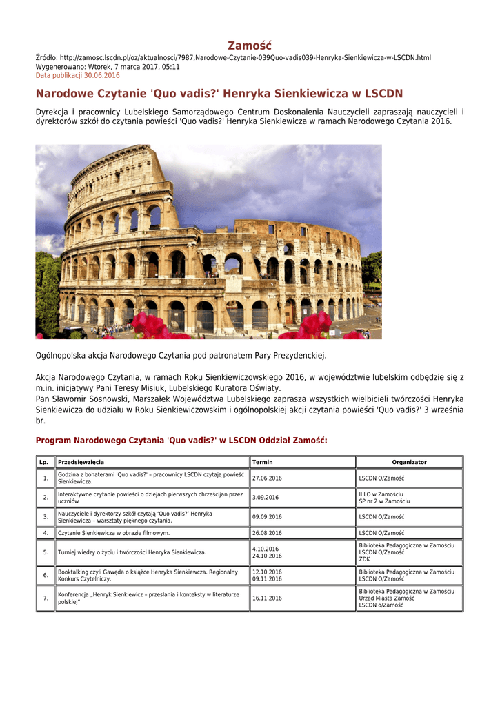 Zamość Źródło: http://zamosc.lscdn.pl/oz/aktualnosci/7987,Narodowe-Czytanie-039Quo-vadis039-Henryka-Sienkiewicza-w-LSCDN.html Wygenerowano: Wtorek, 7 marca 2017, 05:11 Data publikacji 30.06.2016 Narodowe Czytanie 'Quo vadis?' Henryka Sienkiewicza w LSCDN Dyrekcja i pracownicy Lubelskiego Samorządowego Centrum Doskonalenia Nauczycieli zapraszają nauczycieli i dyrektorów szkół do czytania powieści 'Quo vadis?' Henryka Sienkiewicza w ramach Narodowego Czytania 2016. Ogólnopolska akcja Narodowego Czytania pod patronatem Pary Prezydenckiej. Akcja Narodowego Czytania, w ramach Roku Sienkiewiczowskiego 2016, w województwie lubelskim odbędzie się z m.in. inicjatywy Pani Teresy Misiuk, Lubelskiego Kuratora Oświaty. Pan Sławomir Sosnowski, Marszałek Województwa Lubelskiego zaprasza wszystkich wielbicieli twórczości Henryka Sienkiewicza do udziału w Roku Sienkiewiczowskim i ogólnopolskiej akcji czytania powieści 'Quo vadis?' 3 września br. Program Narodowego Czytania 'Quo vadis?' w LSCDN Oddział Zamość: Lp. Przedsięwzięcia Termin Organizator 1. Godzina z bohaterami 'Quo vadis?' – pracownicy LSCDN czytają powieść Sienkiewicza. 27.06.2016 LSCDN O/Zamość 2. Interaktywne czytanie powieści o dziejach pierwszych chrześcijan przez uczniów 3.09.2016 II LO w Zamościu SP nr 2 w Zamościu 3. Nauczyciele i dyrektorzy szkół czytają ‘Quo vadis?’ Henryka Sienkiewicza – warsztaty pięknego czytania. 09.09.2016 LSCDN O/Zamość 4. Czytanie Sienkiewicza w obrazie filmowym. 26.08.2016 LSCDN O/Zamość 5. Turniej wiedzy o życiu i twórczości Henryka Sienkiewicza. 4.10.2016 24.10.2016 Biblioteka Pedagogiczna w Zamościu LSCDN O/Zamość ZDK 6. Booktalking czyli Gawęda o książce Henryka Sienkiewcza. Regionalny Konkurs Czytelniczy. 12.10.2016 09.11.2016 Biblioteka Pedagogiczna w Zamościu LSCDN O/Zamość 7. Konferencja „Henryk Sienkiewicz – przesłania i konteksty w literaturze polskiej” 16.11.2016 Biblioteka Pedagogiczna w Zamościu Urząd Miasta Zamość LSCDN o/Zamość Narodowe Czytanie to akcja zainicjowana przez Prezydenta Polski Bronisława Komorowskiego, mająca popularyzować fundamentalne w polskiej kulturze dzieła, wzmacniać poczucie wspólnej tożsamości, a także promować kulturę żywego słowa w jej najdoskonalszych przejawach. Narodowe Czytanie zainaugurowała w 2012 r. lektura 'Pana Tadeusza' Adama Mickiewicza. W 2013 r. w całej Polsce odbyło się wspólne czytanie dzieł Aleksandra Fredry, w 2014 roku 'Trylogii' Henryka Sienkiewicza, a w ubiegłym roku 'Lalki' Bolesława Prusa. Prezydent RP Andrzej Duda razem z Pierwsza Damą rozpoczną lekturę tegorocznego Narodowego Czytania 3 września. Prezydent.pl