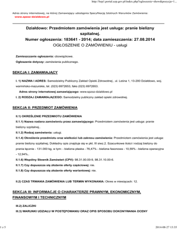 http://bzp1.portal.uzp.gov.pl/index.php?ogloszenie=show&pozycja=1... Adres strony internetowej, na której Zamawiający udostępnia Specyfikację Istotnych Warunków Zamówienia: www.spzoz-dzialdowo.pl Działdowo: Przedmiotem zamówienia jest usługa: pranie bielizny szpitalnej. Numer ogłoszenia: 183641 - 2014; data zamieszczenia: 27.08.2014 OGŁOSZENIE O ZAMÓWIENIU - usługi Zamieszczanie ogłoszenia: obowiązkowe. Ogłoszenie dotyczy: zamówienia publicznego. SEKCJA I: ZAMAWIAJĄCY I. 1) NAZWA I ADRES: Samodzielny Publiczny Zakład Opieki Zdrowotnej , ul. Leśna 1, 13-200 Działdowo, woj. warmińsko-mazurskie, tel. (023) 6972653, faks (023) 6972653. Adres strony internetowej zamawiającego: www.spzoz-dzialdowo.pl I. 2) RODZAJ ZAMAWIAJĄCEGO: Samodzielny publiczny zakład opieki zdrowotnej. SEKCJA II: PRZEDMIOT ZAMÓWIENIA II.1) OKREŚLENIE PRZEDMIOTU ZAMÓWIENIA II.1.1) Nazwa nadana zamówieniu przez zamawiającego: Przedmiotem zamówienia jest usługa: pranie bielizny szpitalnej.. II.1.2) Rodzaj zamówienia: usługi. II.1.4) Określenie przedmiotu oraz wielkości lub zakresu zamówienia: Przedmiotem zamówienia jest usługa: pranie bielizny szpitalnej. Dokładny opis znajduje się w pkt. III siwz.2. Szacunkowe ilości i rodzaj bielizny do prania łącznie - 131.000 kg, w tym: - bielizna płaska - 76,47% - bielizna fasonowa - 10,59% - bielizna operacyjna - 12,94%.. II.1.6) Wspólny Słownik Zamówień (CPV): 98.31.00.00-9, 98.31.10.00-6. II.1.7) Czy dopuszcza się złożenie oferty częściowej: nie. II.1.8) Czy dopuszcza się złożenie oferty wariantowej: nie. II.2) CZAS TRWANIA ZAMÓWIENIA LUB TERMIN WYKONANIA: Okres w miesiącach: 12. SEKCJA III: INFORMACJE O CHARAKTERZE PRAWNYM, EKONOMICZNYM, FINANSOWYM I TECHNICZNYM III.2) ZALICZKI III.3) WARUNKI UDZIAŁU W POSTĘPOWANIU ORAZ OPIS SPOSOBU DOKONYWANIA OCENY 1z5 2014-08-27 13:35 http://bzp1.portal.uzp.gov.pl/index.php?ogloszenie=show&pozycja=1... SPEŁNIANIA TYCH WARUNKÓW III. 3.1) Uprawnienia do wykonywania określonej działalności lub czynności, jeżeli przepisy prawa nakładają obowiązek ich posiadania Opis sposobu dokonywania oceny spełniania tego warunku Zamawiający nie wyznacza szczegółowego warunku w tym zakresie. III.3.2) Wiedza i doświadczenie Opis sposobu dokonywania oceny spełniania tego warunku W celu spełnienia ww. warunku Wykonawca zobowiązany jest wykazać co najmniej 3 usługi pralnicze świadczone na rzecz szpitali z podaniem ich wartości brutto nie mniejszej niż 50% ceny ofertowej, przedmiotu, dat wykonania i podmiotów, na rzecz których usługi zostały wykonane lub są wykonywane z załączeniem dowodów, że usługi te zostały lub są wykonywane należycie - załącznik nr 10 do siwz. III.3.3) Potencjał techniczny Opis sposobu dokonywania oceny spełniania tego warunku W celu spełnienia ww. warunku Wykonawca zobowiązany jest wykazać posiadane pralnice w odpowiedniej ilości przystosowane do realizacji usługi objętej przedmiotem zamówienia, wózki do przewozu bielizny czystej i brudnej posiadające zamknięcie, pojazdy do transportu bielizny itp. wraz z informacją o podstawie dysponowania tymi zasobami - załącznik nr 11 do siwz III.3.4) Osoby zdolne do wykonania zamówienia Opis sposobu dokonywania oceny spełniania tego warunku Zamawiający nie wyznacza szczegółowego warunku w tym zakresie. III.3.5) Sytuacja ekonomiczna i finansowa Opis sposobu dokonywania oceny spełniania tego warunku Zamawiający nie wyznacza szczegółowego warunku w tym zakresie. III.4) INFORMACJA O OŚWIADCZENIACH LUB DOKUMENTACH, JAKIE MAJĄ DOSTARCZYĆ WYKONAWCY W CELU POTWIERDZENIA SPEŁNIANIA WARUNKÓW UDZIAŁU W POSTĘPOWANIU ORAZ NIEPODLEGANIA WYKLUCZENIU NA PODSTAWIE ART. 24 UST. 1 USTAWY III.4.1) W zakresie wykazania spełniania przez wykonawcę warunków, o których mowa w art. 22 ust. 1 ustawy, oprócz oświadczenia o spełnianiu warunków udziału w postępowaniu należy przedłożyć: wykaz wykonanych, a w przypadku świadczeń okresowych lub ciągłych również wykonywanych, głównych dostaw lub usług, w okresie ostatnich trzech lat przed upływem terminu składania ofert albo wniosków o dopuszczenie do udziału w postępowaniu, a jeżeli okres prowadzenia działalności jest krótszy - w tym okresie, wraz z podaniem ich wartości, przedmiotu, dat wykonania i podmiotów, na rzecz których dostawy lub usługi zostały wykonane, oraz załączeniem dowodów, czy zostały wykonane lub są wykonywane należycie; wykaz narzędzi, wyposażenia zakładu i urządzeń technicznych dostępnych wykonawcy usług lub robót budowlanych w celu wykonania zamówienia wraz z informacją o podstawie do dysponowania tymi zasobami; 2z5 2014-08-27 13:35 http://bzp1.portal.uzp.gov.pl/index.php?ogloszenie=show&pozycja=1... III.4.2) W zakresie potwierdzenia niepodlegania wykluczeniu na podstawie art. 24 ust. 1 ustawy, należy przedłożyć: oświadczenie o braku podstaw do wykluczenia; aktualny odpis z właściwego rejestru lub z centralnej ewidencji i informacji o działalności gospodarczej, jeżeli odrębne przepisy wymagają wpisu do rejestru lub ewidencji, w celu wykazania braku podstaw do wykluczenia w oparciu o art. 24 ust. 1 pkt 2 ustawy, wystawiony nie wcześniej niż 6 miesięcy przed upływem terminu składania wniosków o dopuszczenie do udziału w postępowaniu o udzielenie zamówienia albo składania ofert; aktualne zaświadczenie właściwego naczelnika urzędu skarbowego potwierdzające, że wykonawca nie zalega z opłacaniem podatków, lub zaświadczenie, że uzyskał przewidziane prawem zwolnienie, odroczenie lub rozłożenie na raty zaległych płatności lub wstrzymanie w całości wykonania decyzji właściwego organu - wystawione nie wcześniej niż 3 miesiące przed upływem terminu składania wniosków o dopuszczenie do udziału w postępowaniu o udzielenie zamówienia albo składania ofert; aktualne zaświadczenie właściwego oddziału Zakładu Ubezpieczeń Społecznych lub Kasy Rolniczego