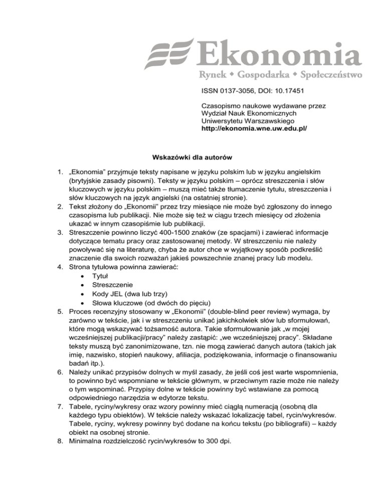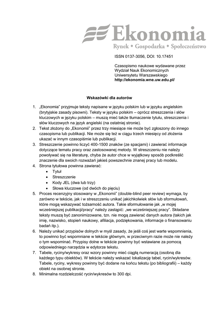 ISSN 0137-3056, DOI: 10.17451 Czasopismo naukowe wydawane przez Wydział Nauk Ekonomicznych Uniwersytetu Warszawskiego http://ekonomia.wne.uw.edu.pl/ Wskazówki dla autorów 1. „Ekonomia” przyjmuje teksty napisane w języku polskim lub w języku angielskim (brytyjskie zasady pisowni). Teksty w języku polskim – oprócz streszczenia i słów kluczowych w języku polskim – muszą mieć także tłumaczenie tytułu, streszczenia i słów kluczowych na język angielski (na ostatniej stronie). 2. Tekst złożony do „Ekonomii” przez trzy miesiące nie może być zgłoszony do innego czasopisma lub publikacji. Nie może się też w ciągu trzech miesięcy od złożenia ukazać w innym czasopiśmie lub publikacji. 3. Streszczenie powinno liczyć 400-1500 znaków (ze spacjami) i zawierać informacje dotyczące tematu pracy oraz zastosowanej metody. W streszczeniu nie należy powoływać się na literaturę, chyba że autor chce w wyjątkowy sposób podkreślić znaczenie dla swoich rozważań jakieś powszechnie znanej pracy lub modelu. 4. Strona tytułowa powinna zawierać: Tytuł Streszczenie Kody JEL (dwa lub trzy) Słowa kluczowe (od dwóch do pięciu) 5. Proces recenzyjny stosowany w „Ekonomii” (double-blind peer review) wymaga, by zarówno w tekście, jak i w streszczeniu unikać jakichkolwiek słów lub sformułowań, które mogą wskazywać tożsamość autora. Takie sformułowanie jak „w mojej wcześniejszej publikacji/pracy” należy zastąpić: „we wcześniejszej pracy”. Składane teksty muszą być zanonimizowane, tzn. nie mogą zawierać danych autora (takich jak imię, nazwisko, stopień naukowy, afiliacja, podziękowania, informacje o finansowaniu badań itp.). 6. Należy unikać przypisów dolnych w myśl zasady, że jeśli coś jest warte wspomnienia, to powinno być wspomniane w tekście głównym, w przeciwnym razie może nie należy o tym wspominać. Przypisy dolne w tekście powinny być wstawiane za pomocą odpowiedniego narzędzia w edytorze tekstu. 7. Tabele, ryciny/wykresy oraz wzory powinny mieć ciągłą numeracją (osobną dla każdego typu obiektów). W tekście należy wskazać lokalizację tabel, rycin/wykresów. Tabele, ryciny, wykresy powinny być dodane na końcu tekstu (po bibliografii) – każdy obiekt na osobnej stronie. 8. Minimalna rozdzielczość rycin/wykresów to 300 dpi. 9. Odniesienia do literatury należy umieszczać w tekście głównym zgodnie z zasadami The Chicago Manual of Style Author–Date References. Przykładowe zapisy: Jeden autor: (Kowalski 2001, 45) Dwóch autorów: (Kowalski i Nowak 2001, 45–51) Trzech autorów: (Kowalski, Nowak i Wiśniewski 2001, 123–27) Czterech i więcej autorów: (Kowalski et al. 2001, 34–78) Autor instytucjonalny: (GUS 2006, 96–99) 10. Bibliografia powinna być zestawiona alfabetycznie i chronologicznie w przypadku kilku prac tego samego autora, czyli jako pierwsza powinna być wymieniona praca najstarsza, jako ostatnia – najnowsza. Zapis bibliograficzny proszę przygotować zgodnie z zasadami The Chicago Manual of Style. Przykładowe zapisy: Jeden autor: Kowalski, Jan. 2001. Ekonomia sektora publicznego. Warszawa: Wydawnictwo Naukowe PWN. Dwóch autorów: Kowalski, Jan i Adam Nowak. 2001. Ekonomia sektora publicznego. Warszawa: Wydawnictwo Naukowe PWN. Trzech i więcej autorów: podajemy wszystkich autorów w porządku alfabetycznym Praca zbiorowa pod redakcją: Kowalski, Jan, red. 2001. Ekonomia sektora publicznego. Warszawa: Wydawnictwo Naukowe PWN. Tekst w pracy zbiorowej: Nowak, Adam. 2001. „Finanse publiczne”. W: Ekonomia sektora publicznego, red. Jan Kowalski, 125–65. Warszawa: Wydawnictwo Naukowe PWN. Artykuł w czasopiśmie: Kowalski, Jan. 2001. „Ekonomia sektora publicznego”. Bank i Kredyt 45(1): 56–78. Inne przykłady można znaleźć na stronie: https://www.aeaweb.org/sample_references.pdf 11. Tekst powinien być zapisany w Wordzie lub edytorze LEd. 12. Tekst nie powinien być dłuższy niż 40 stron zapisanych czcionką Times New Roman, 12 p., podwójny odstęp (ok. 30 wierszy na stronę). Rozmiar pliku (wraz z tabelami i rycinami/wykresami) nie powinien przekraczać 5MB.