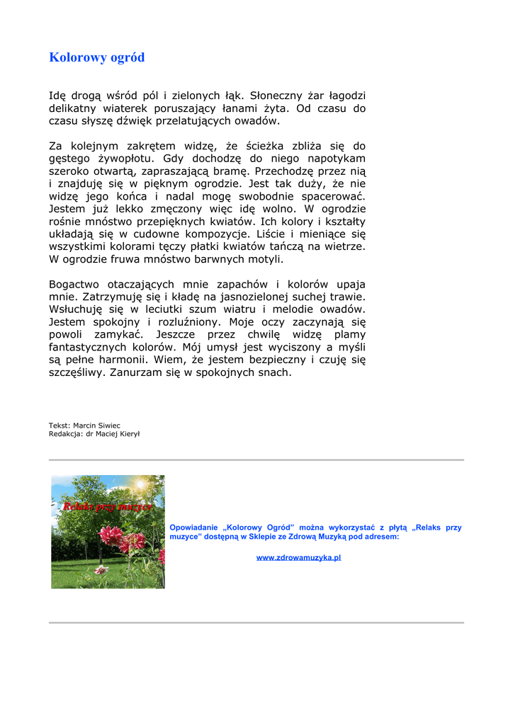 Kolorowy ogród Idę drogą wśród pól i zielonych łąk. Słoneczny żar łagodzi delikatny wiaterek poruszający łanami żyta. Od czasu do czasu słyszę dźwięk przelatujących owadów. Za kolejnym zakrętem widzę, że ścieżka zbliża się do gęstego żywopłotu. Gdy dochodzę do niego napotykam szeroko otwartą, zapraszającą bramę. Przechodzę przez nią i znajduję się w pięknym ogrodzie. Jest tak duży, że nie widzę jego końca i nadal mogę swobodnie spacerować. Jestem już lekko zmęczony więc idę wolno. W ogrodzie rośnie mnóstwo przepięknych kwiatów. Ich kolory i kształty układają się w cudowne kompozycje. Liście i mieniące się wszystkimi kolorami tęczy płatki kwiatów tańczą na wietrze. W ogrodzie fruwa mnóstwo barwnych motyli. Bogactwo otaczających mnie zapachów i kolorów upaja mnie. Zatrzymuję się i kładę na jasnozielonej suchej trawie. Wsłuchuję się w leciutki szum wiatru i melodie owadów. Jestem spokojny i rozluźniony. Moje oczy zaczynają się powoli zamykać. Jeszcze przez chwilę widzę plamy fantastycznych kolorów. Mój umysł jest wyciszony a myśli są pełne harmonii. Wiem, że jestem bezpieczny i czuję się szczęśliwy. Zanurzam się w spokojnych snach. Tekst: Marcin Siwiec Redakcja: dr Maciej Kierył Opowiadanie „Kolorowy Ogród” można wykorzystać z płytą „Relaks przy muzyce” dostępną w Sklepie ze Zdrową Muzyką pod adresem: www.zdrowamuzyka.pl Jak korzystać z zestawu płyta "Relaks przy muzyce" + opowiadanie "Kolorowy Ogród". ● Muzykę odtwarzaj bardzo cicho. ● Wygodna pozycja leżąca lub półleżąca (np. w fotelu) i swobodne, luźne ubranie pomogą w osiągnięciu relaksu. ● Tekst opowiadania przeczytaj przed lub w trakcie odtwarzania muzyki wolno, cicho i spokojnie. Dziękuję Ci, że przeczytałaś/-eś moje opowiadanie! Cieszę się, że doceniasz wartość zdrowia opartego na harmonii i spokoju. Mam więc dla Ciebie propozycję. Podziel się z innymi swoim Zdrowym Myśleniem! Ja rozdaję swoje opowiadania relaksacyjne za darmo. Ty też możesz je podarować komuś kogo lubisz, kochasz, komu dobrze życzysz. Jedynym warunkiem jaki stawiam jest przesłanie całości tekstu w niezmienionej formie. Ten utwór objęty jest licencją Creative Commons Uznanie autorstwa-Użycie niekomercyjne-Bez utworów zależnych 2.5 Polska. Aby zobaczyć kopię niniejszej licencji przejdź na stronę http://creativecommons.org/licenses/by-nc-nd/2.5/pl/ lub napisz do Creative Commons, 171 Second Street, Suite 300, San Francisco, California 94105, USA. Muzyczna Strona Zdrowia zaprasza!!! Odwiedź nas czasami! http://www.zdrowamuzyka.pl/