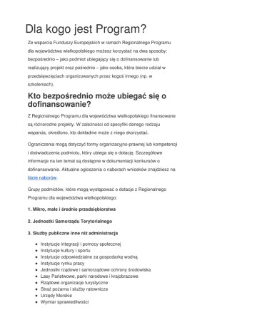 Dla kogo jest Program? Ze wsparcia Funduszy Europejskich w ramach Regionalnego Programu dla województwa wielkopolskiego możesz korzystać na dwa sposoby: bezpośrednio – jako podmiot ubiegający się o dofinansowanie lub realizujący projekt oraz pośrednio – jako osoba, która bierze udział w przedsięwzięciach organizowanych przez kogoś innego (np. w szkoleniach). Kto bezpośrednio może ubiegać się o dofinansowanie? Z Regionalnego Programu dla województwa wielkopolskiego finansowane są różnorodne projekty. W zależności od specyfiki danego rodzaju wsparcia, określono, kto dokładnie może z niego skorzystać. Ograniczenia mogą dotyczyć formy organizacyjno-prawnej lub kompetencji i doświadczenia podmiotu, który ubiega się o dotację. Szczegółowe informacje na ten temat są dostępne w dokumentacji konkursów o dofinansowanie. Aktualne ogłoszenia o naborach wniosków znajdziesz na liście naborów. Grupy podmiotów, które mogą występować o dotacje z Regionalnego Programu dla województwa wielkopolskiego: 1. Mikro, małe i średnie przedsiębiorstwa 2. Jednostki Samorządu Terytorialnego 3. Służby publiczne inne niż administracja Instytucje integracji i pomocy społecznej Instytucje kultury i sportu Instytucje odpowiedzialne za gospodarkę wodną Instytucje rynku pracy Jednostki rządowe i samorządowe ochrony środowiska Lasy Państwowe, parki narodowe i krajobrazowe Rządowe organizacje turystyczne Straż pożarna i służby ratownicze Urzędy Morskie Wymiar sprawiedliwości Zarządcy dróg Jednostki doradztwa rolniczego 4. Instytucje ochrony zdrowia Niepubliczne zakłady opieki zdrowotnej mające umowę z NFZ Publiczne zakłady opieki zdrowotnej Uzdrowiska 5. Instytucje wspierające biznes Instytucje finansowe Instytucje otoczenia biznesu Izby gospodarcze Organizacje zrzeszające pracodawców 6. Instytucje nauki i edukacji Jednostki naukowe Ośrodki kształcenia dorosłych Przedszkola i instytucje opieki Szkoły i inne placówki oświatowe Uczelnie wyższe 7. Partnerstwa Klastry Konsorcja naukowo-przemysłowe Partnerstwa Publiczno-Prywatne 8. Przedsiębiorstwa realizujące cele publiczne Kolej Organizatorzy i operatorzy transportu towarowego Podmioty zarządzające terenami inwestycyjnymi Porty lotnicze Porty śródlądowe i morskie Przedsiębiorstwa świadczące usługi publicznego transportu zbiorowego Spółki wodne 9. Organizacje społeczne i związki wyznaniowe Centra aktywności lokalnej Kluby sportowe, centra sportu Kościoły i związki wyznaniowe Niepubliczne inwestycje kultury i sportu Niepubliczne podmioty integracji i pomocy społecznej Organizacje pozarządowe Podmioty ekonomii społecznej Wspólnoty i spółdzielnie mieszkaniowe Związki zawodowe Kto pośrednio może otrzymać wsparcie? Z Funduszy Europejskich mogą korzystać również osoby, instytucje lub grupy społeczne, które nie ubiegają się bezpośrednio o dotację, ale mogą brać udział w projektach, na które wsparcie uzyskał inny podmiot, instytucja itp. W ten sposób można wziąć udział np. w szkoleniach, kursach, studiach, starać się o usługę rozwojową dla firmy lub dofinansowanie czy pożyczkę na założenie działalności gospodarczej. Tego rodzaju projekty kierowane są przede wszystkim do: osób bezrobotnych i długotrwale bezrobotnych, osób do 25 roku życia, osób w wieku 50+, mam wracających na rynek pracy po urodzeniu i wychowaniu dzieci, osób niepełnosprawnych, mieszkańców mniejszych miejscowości, właścicielu i pracowników przedsiębiorstw. Należy pamiętać, że ze środków europejskich można też korzystać będąc po prostu użytkownikiem infrastruktury, która powstała dzięki dofinansowaniu z Funduszy Europejskich (np. przedszkola, szkoły, teatry itp.)