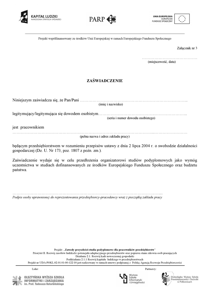 Projekt współfinansowany ze środków Unii Europejskiej w ramach Europejskiego Funduszu Społecznego Załącznik nr 3 …………………………………. (miejscowość, data) ZAŚWIADCZENIE Niniejszym zaświadcza się, że Pan/Pani …………………………………………………………………... (imię i nazwisko) legitymujący/legitymująca się dowodem osobistym…………………………………..…………………... (seria i numer dowodu osobistego) jest pracownikiem ………………………………………….……………………………………………...…………………… (pełna nazwa i adres zakładu pracy) będącym przedsiębiorstwem w rozumieniu przepisów ustawy z dnia 2 lipca 2004 r. o swobodzie działalności gospodarczej (Dz. U. Nr 173, poz. 1807 z poźn. zm.). Zaświadczenie wydaje się w celu przedłożenia organizatorowi studiów podyplomowych jako wymóg uczestnictwa w studiach dofinansowanych ze środków Europejskiego Funduszu Społecznego oraz budżetu państwa. …………………………………………………………………………………………….... Podpis osoby uprawnionej do reprezentowania przedsiębiorcy-pracodawcy wraz z pieczątką zakładu pracy Projekt: „Zawody przyszłości-studia podyplomowe dla pracowników przedsiębiorstw” Priorytet II. Rozwój zasobów ludzkich i potencjału adaptacyjnego przedsiębiorstw oraz poprawa stanu zdrowia osób pracujących Działanie 2.1. Rozwój kadr nowoczesnej gospodarki Poddziałanie 2.1.1 Rozwój kapitału ludzkiego w przedsiębiorstwach Projekt nr UDA-POKL.02.01.01-00-122/10 jest realizowany w ramach umowy podpisanej z Polską Agencją Rozwoju Przedsiębiorczości Lider: Partnerzy: