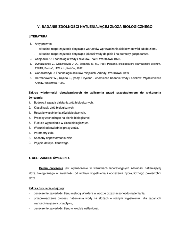 V. BADANIE ZDOLNOŚCI NATLENIAJĄCEJ ZŁOŻA BIOLOGICZNEGO LITERATURA 1. Akty prawne: - Aktualne rozporządzenie dotyczące warunków wprowadzania ścieków do wód lub do ziemi. - Aktualne rozporządzenie dotyczące jakości wody do picia i na potrzeby gospodarcze. 2. Chojnacki A.: Technologia wody i ścieków. PWN, Warszawa 1972. 3. Dymaczewski Z., Oleszkiewicz J. A., Sozański M. M., (red): Poradnik eksploatatora oczyszczalni ścieków. PZIiTS, Poznań, LEM s.c., Kraków, 1997 4. Gończarczyk I.: Technologia ścieków miejskich. Arkady, Warszawa 1989 5. Hermanowicz W., Dojlido J., (red): Fizyczno - chemiczne badanie wody i ścieków. Wydawnictwo Arkady, Warszawa, 1999. Zakres wiadomości obowiązujących do zaliczenia przed przystąpieniem do wykonania ćwiczenia: 1. Budowa i zasada działania złóż biologicznych. 2. Klasyfikacja złóż biologicznych. 3. Rodzaje wypełnienia złóż biologicznych. 4. Procesy zachodzące na błonie biologicznej. 5. Funkcje wypełnienia w złożu biologicznym. 6. Warunki odpowiedniej pracy złoża. 7. Parametry złóż. 8. Sposoby napowietrzania złóż. 9. Pojęcie deficytu tlenowego. 1. CEL I ZAKRES ĆWICZENIA Celem ćwiczenia jest wyznaczenie w warunkach laboratoryjnych zdolności natleniającej złoża biologicznego w zależności od rodzaju wypełnienia i obciążenia hydraulicznego powierzchni złoża. Zakres ćwiczenia obejmuje: - oznaczenie zawartości tlenu metodą Winklera w wodzie przeznaczonej do natleniania, - przeprowadzenie procesu natleniania wody na złożach o różnym wypełnieniu wartości natężenia przepływu, - oznaczenie zawartości tlenu w wodzie natlenionej. dla zadanych 2. WYKONANIE ĆWICZENIA 1. W wodzie przeznaczonej do natleniania należy oznaczyć zawartość tlenu rozpuszczonego (metodą Winklera). 2. Przeprowadzić proces natleniania wody na modelach złóż biologicznych (z wypełnieniem naturalnym i sztucznym) z natężeniem przepływu podanym przez prowadzącego zajęcia. 3. Pobrać próbki wody po przepływie przez złoża i wykonać oznaczenie zawartości tlenu rozpuszczonego. 4. Postępowanie powtórzyć dla każdej z zadanych wartości natężenia przepływu. 5. Uzyskane wyniki zestawić w formie sprawozdania. 3. METODYKA KONTROLI ANALITYCZNEJ A. Oznaczenie zawartości rozpuszczonego tlenu metodą Winklera 3 1. Do butelki inkubacyjnej o pojemności 300 cm nalać do pełna badanej wody. 2. Do butelki dodać 2 cm3 roztworu siarczanu(VI) manganu(II) MnSO4 (wprowadzając koniec pipety pod powierzchnię cieczy) i 2 cm3 alkalicznego roztworu jodku potasu (KI + NaOH). 3. Zamknąć butelkę korkiem (ostrożnie tak aby nie został pęcherzyk powietrza). 4. Wymieszać i odstawić na 20 minut. 5. Dodać 2 cm 3 stężonego kwasu siarkowego(VI) H2SO4 (wprowadzając koniec pipety pod powierzchnię cieczy). 6. Zamknąć butelkę korkiem i dokładnie wymieszać, aż do rozpuszczenia osadu. 3 7. Do trzech kolb stożkowych o pojemności 200 - 300 cm , pobrać z butelki za pomocą pipety jednomiarowej po 100 cm3 cieczy. 8. Miareczkować roztworem Na2S2O3 (tiosiarczan sodu) do jasnożółtego zabarwienia, następnie 3 dodać 1 cm roztworu skrobi i kontynuować miareczkowanie do odbarwienia roztworu. UWAGA: powtórnego zabarwienia próbki nie bierze się pod uwagę. 9. Odczytać objętość zużytego roztworu tiosiarczanu sodu i obliczyć zawartość rozpuszczonego tlenu. 10. Jako wynik podać średnią arytmetyczną z 3 oznaczeń. 4. OBLICZENIA 1) Zawartość tlenu rozpuszczonego Zo = 0,1 ⋅ V ⋅ a ⋅ 1000 (V − b ) ⋅ 100 3 [mg O2/d m ] 3 Zo - zawartość rozpuszczonego tlenu [mg/dm ] V - pojemność butelki inkubacyjnej [cm3] a - objętość roztworu Na2S2O3 zużytego do miareczkowania [cm3] 3 b - objętości dodawanych roztworów MnSO4 i KI + NaOH, [cm ] 2) Obliczenie obciążenia hydraulicznego złoża Vh = Vp t⋅ f [ m3/ m2 h] 3 2 Vh - obciążenie hydrauliczne powierzchni złoża, [ m / m h] Vp - objętość przepływającej wody, [m3] t - czas przepływu wody, [h] f – powierzchnia przekroju złoża, [m2] f = π ⋅d2 4 2 [m ] d - średnica złoża, [m] 3) Obliczenie zdolności natleniającej złoża Z n = Vh ⋅ ∆O2 ⋅ f ⋅ 24 [g O2/ d] Zn - zdolność natleniająca złoża, [g O2/ d] Vh - obciążenie hydrauliczne powierzchni złoża, [m3/ m2 h] f - powierzchnia złoża, [m2] ∆O2 - przyrost zawartości tlenu między punktem początkowym, a końcowym procesu 4) Obliczenie deficytu tlenowego D = Cn − C 3 [g O2/ m ] D - deficyt tlenowy, [g O2/ m3] 3 Cn - zawartość tlenu w wodzie przy pełnym nasyceniu (wg Tabeli 1), [gO2/ m ] C - zawartość tlenu w wodzie w punkcie końcowym natleniania, [gO2/ m3] 5. ZESTAWIENIE WYNIKÓW I WNIOSKI Otrzymane wyniki należy zestawić w formie tabelarycznej (Tabela 2) W sprawozdaniu należy podać wnioski dotyczące: - oceny zdolności natleniającej złoża biologicznego w zależności od rodzaju wypełnienia i obciążenia hydraulicznego złoża. - propozycji dotyczących zmian w zastosowanej metodzie, o ile wyniki otrzymane nie będą zgodne z oczekiwaniami. Tabela 1. Rozpuszczalność* tlenu w zależności od temperatury Temperatura wody [°C] Rozpuszczalność 3 tlenu [mg O2/dm ] Temperatura wody [°C] Rozpuszczalność 3 tlenu [mg O2/dm ] 0 14,62 11 11,08 1 14,23 12 10,83 2 13,84 13 10,60 3 13,48 14 10,37 4 13,13 15 10,15 5 12,80 16 9,95 6 12,48 17 9,74 7 12,17 18 9,54 8 11,87 19 9,35 9 11,59 20 9,17 10 11,33 *Ilość tlenu w mg potrzebna do nasycenia 1 dm3 wody destylowanej o z powietrzem o zawartości 20,9 % tlenu pod ciśnieniem 1013 hPa Temperatura wody [°C] 21 22 23 24 25 26 27 28 29 30 Rozpuszczalność 3 tlenu [mg O2/dm ] 8,99 8,83 8,63 8,53 8,38 8,22 8,07 7,92 7,77 7,63 temperaturze t°C stykającej się Tabela 2. Zawartość tlenu rozpuszczonego w wodzie w zależności od obciążenia hydraulicznego złoża biologicznego Rodzaj wypełnienia złoża Obciążenie hydrauliczne [m3/m2 h] Zawartość tlenu w wodzie [mg O2/dm3] na dopływie do złoża w odpływie ze