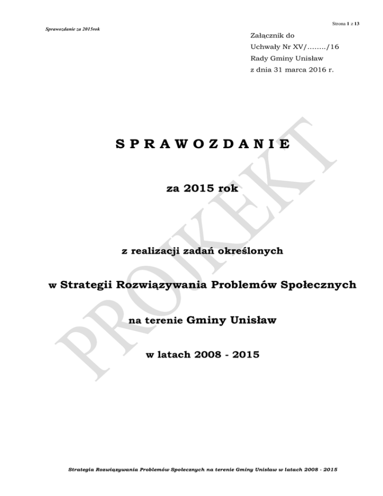 Strona 1 z 13 Sprawozdanie za 2015rok Załącznik do Uchwały Nr XV/……../16 Rady Gminy Unisław z dnia 31 marca 2016 r. SPRAWOZDANIE za 2015 rok z realizacji zadań określonych w Strategii Rozwiązywania Problemów Społecznych na terenie Gminy Unisław w latach 2008 - 2015 Strategia Rozwiązywania Problemów Społecznych na terenie Gminy Unisław w latach 2008 - 2015 Strona 2 z 13 Sprawozdanie za 2015rok Spis treści Wstęp …………………………………………………………………………………………………. I. Zwalczanie bezrobocia i przeciwdziałanie jego skutkom …………………………. II. Poprawa jakości życia ludzi starszych oraz zapobieganie marginalizacji życia starszego pokolenia ………………………………………………………………… III. str. 6 str. 7 Działania na rzecz poprawy funkcjonowania rodzin patologicznych i zagrożonych patologiami …………………………………………………………………. VI. str. 4 Poprawa warunków społecznego funkcjonowania osób niepełnosprawnych w społeczności lokalnej i integracja społeczna ……………………………………… V. str. 4 Budowa systemu profilaktyki przeciwalkoholowej oraz bieżące rozwiązywanie problemów z tym związanych wśród społeczności lokalnej ……………………… IV. str. 3 str. 9 Zatrzymanie mechanizmów społecznego wykluczenia i marginalizacji wśród dzieci i młodzieży ………………..………………………………………………………… str. 10 VII. Zwalczanie problemu narkomanii ……………………………………………………… str. 12 VIII. Zwiększenie aktywności społecznej mieszkańców …………………………………. str. 12 IX. Wzmocnienie oddziaływania instytucji odpowiedzialnych za politykę społeczną w gminie ……………………………………………………………………….. str. 13 Podsumowanie ……………………………………………………………………………………… str. 14 Strategia Rozwiązywania Problemów Społecznych na terenie Gminy Unisław w latach 2008 - 2015 Strona 3 z 13 Sprawozdanie za 2015rok Wstęp Strategia Rozwiązywania Problemów Społecznych jest dokumentem opracowywanym w celu kształtowania lokalnej polityki społecznej, poprzez wyznaczanie głównych celów i zadań do realizacji, ukierunkowanych na poprawę życia mieszkańców gminy Unisław, powstałym w oparciu o diagnozę stanu problemów społecznych. Cele integracji powinny być wyrazem dążeń i aspiracji społeczności lokalnej zmierzających do rozwiązania zidentyfikowanych problemów, likwidacji barier i zagrożeń oraz do wykorzystania wszelkich szans tkwiących w potencjale ludzkim i materialnym dla przyszłej integracji. Niniejsze opracowanie stanowi aktualizację, która uzupełnia i uszczegóławia o kwestie lokalnej polityki społecznej Strategię Rozwoju Gminy Unisław na lata 2008 - 2015. Konieczność opracowania i realizacji gminnej strategii rozwiązywania problemów społecznych wynika z art. 17 ust. 1 ustawy o pomocy społecznej z dnia 12 marca 2004 roku. Jest to zadanie własne gminy o charakterze obowiązkowym. W dniu 19 listopada 2008 roku uchwałą Nr VIII/45/08 Rady Gminy w Unisławiu została przyjęta Strategia Rozwiązywania Problemów Społecznych na lata 2008 - 2015. Określono w niej najważniejsze cele strategiczne, które mają zapewnić bezpieczeństwo socjalne mieszkańcom naszej gminy oraz podejmowanie różnorodnych działań dla poprawy warunków zaspokojenia potrzeb przez wybrane kategorie osób i rodzin. Dokument ten został opracowany przez Gminny Ośrodek Pomocy Społecznej przy wykorzystaniu własnych materiałów sprawozdawczych, analiz oraz informacji i materiałów przygotowanych przez jednostki administracji publicznej. Przyjęte w nim koncepcje wskazują sposoby zaradzenia problemom społecznym na terenie Gminy Unisław. Sprawozdanie z realizacji Strategii Rozwiązywania Problemów społecznych stanowi prezentację projektów i działań podejmowanych w celu realizacji przyjętych zadań wraz ze wskazaniem ich realizatorów na rzecz mieszkańców Gminy Unisław. Strategia Rozwiązywania Problemów Społecznych na terenie Gminy Unisław w latach 2008 - 2015 Strona 4 z 13 Sprawozdanie za 2015rok I - Zwalczanie bezrobocia i przeciwdziałanie jego skutkom 1. Urząd Gminy w Unisławiu zorganizował roboty publiczne dla 77 osób bezrobotnych, na staż dla osób bezrobotnych zostało przyjętych 29 osób. 2. Gminny Ośrodek Pomocy Społecznej wspierał osoby dotknięte bezrobociem poprzez udzielanie świadczeń w formie zasiłku okresowego, zasiłku celowego, dożywiania w ramach programu wieloletniego „Pomoc państwa w zakresie dożywiania” – pomoc z tytułu bezrobocia otrzymało 194 rodziny. 3. Gminny Ośrodek Kultury w Unisławiu organizował zajęcia, które pozwalają zdobyć nowe umiejętności: język angielski, zajęcia plastyczne, Akademia Dorosłego Człowieka, zespoły wokalne, orkiestra, szachy, klub gier planszowych, klub CASHLOW, zajęcia ruchowe (joga, fitness, aerobik, BPU). 4. Gminna Biblioteka Publiczna przeciwdziałając wykluczeniu cyfrowemu zorganizowała kurs 50+, który trwał 18 godzin/osobę. Obejmował podstawę obsługi komputera i Internetu, program World, założenie poczty e-mail oraz obsługę wybranego portalu społecznościowego. W kursie wzięło udział 10 osób. Oprócz Kursu 50+ Gminna Biblioteka Publiczna służy pomocą w pytaniach i problemach dotyczących spraw informatycznych. II - Poprawa jakości życia ludzi starszych oraz zapobieganie marginalizacji życia starszego pokolenia 1. Gminny Ośrodek Pomocy Społecznej w Unisławiu zakupił i obdarował paczkami ze słodyczami z okazji świąt Bożego Narodzenia 280 osób powyżej 80 roku życia. 2. Polski Związek Emerytów Rencistów i Inwalidów w Unisławiu na dzień 31.12.2015r. liczył 170 c