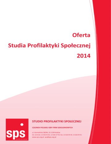 !"# $# '(% )&# ! # &* (+$ %&'()&* , (# !&) -$'. ! !" #$# % & $ #$#'#$# % & $ !! STUDIO PROFILAKTYKI SPOŁECZNEJ CZŁONEK POLSKIEJ IZBY FIRM SZKOLENIOWYCH ul. Karmelicka 28/9A, 31-128 Kraków tel. centrala: 12 636 92 85, 12 636-37 93; fax: 12 626 94 40, 12 626 94 41 www.sps.org.pl [email protected] WSPÓŁCZESNE ZAGROŻENIA SPOŁECZNE - ICH ROZPOZNANIE I PRZECIWDZIAŁANIE NA POZIOMIE LOKALNYM czyli: Oferta Studia Profilaktyki Społecznej 2014 OFERTA STUDIA PROFILAKTYKI SPOŁECZNEJ 2014 Szkolenia Szkoleniazamknięte zamkniętedla dlaKomisji KomisjiRozwiązywania RozwiązywaniaProblemów ProblemówAlkoholowych, Alkoholowych,Zespołów Zespołów Interdyscyplinarnych, Grup Roboczych Interdyscyplinarnych, Grup Roboczych 1. Używanie substancji psychoaktywnych – praktyczne aspekty profilaktyki na poziome lokalnym – czyli wszystko o „dopalaczach” 2. Substancje psychoaktywne w Polsce a najnowsza polityka antynarkotykowa, w tym m.in. wypracowany w ramach Komisji Europejskiej „Pakt Przeciwko Narkotykom Syntetycznym” i dopalaczom 3. Profilaktyka lokalna – jako szczególna procedura działania 4. Przemoc domowa - dziecko krzywdzone w świetle znowelizowanej Ustawy o Przeciwdziałaniu Przemocy w Rodzinie 5. Gminne Komisje Rozwiązywania Problemów Alkoholowych oraz Zespoły Interdyscyplinarne ds. przeciwdziałania przemocy w rodzinie – jak działać skutecznie krok po kroku. 6. Praktyczne elementy funkcjonowania Zespołów interdyscyplinarnych i grup roboczych Szkolenia dla sprzedawców napojów alkoholowych 1. Zakaz sprzedaży alkoholu i tytoniu nieletnim – aspekty prawne i psychologiczne 2. Odpowiedzialny sprzedawca Diagnoza lokalna Dzięki diagnozie: • Jeszcze lepiej poznasz swoją lokalną społeczność z jej specyfiką, potrzebami, zasobami i problemami. • Zdasz sobie sprawę z zagrożeń, które wiążą się z twoim działaniem. • Doznasz inspiracji, która płynie z ugruntowanej wiedzy na temat kontekstu. 2 ! !" !! #$# % & $ #$#'#$# % & $ ! & % '& ) , o o ( + " # & * # * / 0 2 *1 3 ! # . # - ! 4 ! . 0 * 5 1 ! % ! * * ! 0 7 9 1 ;;; 5 : $ #* A B D - '# ? 7 => ? / @ ! ) ) C* > 9D,,8* E# 7 F < : $ 7 9 " * " D ! " ! " ! $ # - / " ? (% 7 2%%*%% ! 7 ! # % * o # $ &- . 8 ! # ! # 6 ! # ! ! # % & ! ' & ( * ! !" !! #$# % & $ #$#'#$# % & $ ) * + " , -& D B ) ! # C* .' # G # ! # / ! # / D - # # # 0 G 0 *- * * ( # * * ! - - - & # & #/ - 12 343#5+ $ 6317+89 D # # B C1 + , /! D 2 * : # . & * ! # ' # * ! - IJJ @ E D " ! <= + @ # .G * # B / . , 1 0 /G . ! : # 936 6 93? 3 ? $ J$L < :F 7 9 A 3 E# D ) , ) ! - ! $ 3 ! # . 3 @ 5 6 C - " 6 * " # ! * ! 5 # # ! % +1 % % 6 - ! 8 ! . 0 DAK ") * A < 6 / - 4@8 $ D:3J ) # / 6 ! < @,) * - 3 ! # " ! # " 5 # D ! - A - / " ? 7 ! * # & ! . (% 7 2%%*%% ! % * # - * - '# ? 7 # <: :F 7 F * ' # 1 * # 0 ! ) 6 ! ! . D * ! 5 / 9 ! # 6 * * A ! <>>? ! + # 7 < - - - # # / - # ! ! ! . # ! 6 B . C D 936 8* # 0 - 1 H ! - ! - # # 6 ' -/ # B / - ! D 6 ! ' - * # .& ) - - ' # # B " D ' ! ; # C* C ! ' & ( ! ! !" !! #$# % & $ #$#'#$# % & $ -/ ) @ ! & / 3 * / ! - ! & < " < 0 8 - # . - $J" 0 ! # / 0 - 0 ! ! 5 -N 0 5 *# 0 - -7 # . / .G ! N # N G # 0 0 . -N . ! 5 0 - 7 F 5 1 0 - # 0 - J 6 ! < ! # - H - - 4 ! <J:N 7 2 ' # 0 3 + - N ? ( - F - 8< 8 # 0 ! * - * N - %%H1 %%E " % ! , ! )"< 8 D 9 F D 7 E# 7 ? 7 * # - '# / " (% 7 2%%*%% ! ! % ! ? ! # & O ' / . - 7 & 9P)< 8 # ! & * - ( + # + ! !" !! #$# % & $ #$#'#$# % & $ 0 ' ! # 7 D ! ! : ( < + ? 2 < ! ? ! J & ' - 0 &# H 3 E D ; $ 0 & - # /O G 0 ! -Q 6 Q ! 5 0 & / 7 6 : % % :# # B 4 # # - Q % 4 6 ! 9 # 9! @ 1D5 :. 1 # - ;E+ 1 ;;+N # 6 - ;;+ & ;;;N # ! 0 " / ! % A'# % ? / " / % (% % <?>>*>> ! 7 * ! % & ! ' 0 ! - 5 - & :. 0 - " . / # - ? ! # & ( ;;; & ! !" !! #$# % & $ #$#'#$# % & $ 6 @ 5 & / ! $ 3 ! ! C : - 5) 0 ( ) -" " " < 8 ? 7 # ! & ! * N 7 # N -N N • # • 0 -N N • # • ) # • + ? ! 2 ? ! # # ! N N * : 3* ? ! J # 3 ! # ! • ! B8C $ " 0 ! 3 N -N • • N 7 0 # ! * ! 9 • 0 " # < # N * / • 5 N ? 0 6 ! ! J - • ' ? ! ! # <J: $J" 7 F 1 5 0 - 8< 8 # 0 - * % ! D 9 F D 7 E# 7 ? 7 * # + ! 9P)< 8 * , ! # F - # ? 7 ! # ' / . N )"< 8 & & O ' * - %%H1 %%E " - '# / " (% 7 2%%*%% ! ! % ! ! & ( * - + # ! - ! !" !! #$# % & $ #$#'#$# % & $ 5 A !/ - 0 ! # # ! N ? $ ? ( 4 + 4 ! G# 1 > E 6 # * # D* ! N N $ ? # 1 5 " 1 ! ! P) -N ! # - A 6 ! " G / 8 5 / - ? / /N !P) 1 ! J 0 7 8# : R$ F 1 * RJ ? " ! :# # : - , < : - / R* R$ D 9 F D F 7 7 7 * # / J -0 H Q G 4 ? 1 -RN * #/ ' " GR ) 2 - % :0 * D 9 # < * J 3 # *3 3 . :. 8 ! RK R*6 E# ? (% 7 2%%*%% ! ! - '# / " # ? 7 ! # & ' ! & ( A- - ! !" !! #$# % & $ #$#'#$# % & $ ! "#$#% &' ( !"#!"$% ! • & ' ' ! ! • • • )' %( • • • • • • • • • ()* + , ) . / + 0 0 01 3 - 01 2 * - 4 5 * * - 6 7 6 5 ! 5 8# 5 "###1## 5 1 1 , 9 ! - : , " * ! + ' 1 ! !" !! #$# % & $ #$#'#$# % & $ ,-(,./#- /0$12 (3 #-0."0 ! "! ( ! + / 21 1 2 1 ! ( & 1 4 * -; ! ; <! 5 9 & 8! =! ; ! ! 6 ! ! ; ! ! 9 ! > ! +/ 3?31 1 1 9 & -! : 0 1 ! 3 / ! > 0 0 4 6 21 / @ 5 7 * A & : ! 5 6 ! 8# 5 "###1## 5 1 ! 1! : 3?31 " * ! , ! / + ! ! !" !! #$# % & $ #$#'#$# % & $ ! $ # $ ' $ " ! % ! $ & ' ( , + $ ) * ) + • • • • • • • • ) * * . + 0 + 0 + & / /1 /& * * ( 2 + ) • • • • • , 4 3 5 6 ! "#$ %$&'(&$ () ) ! ! * "+ #"!,-#!( *"#$ . ( / $ $0$" ,-"+1 &$& *#20% (0 *$3"# " &$) #* 42# '#$)05 627- % ! "$. %)0 ( $" # $ '#", $ *#0 2&# () * "$ )+ #"!,-#!( *"#$ 8 98 • • • • • $ $ 4 6 % * 7 7 7 77 8, 9 !