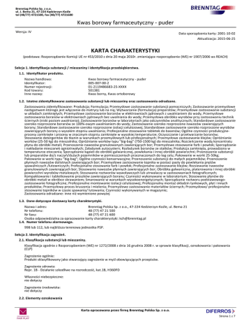 Brenntag Polska Sp. z o.o. ul. J. Bema 21, 47-224 Kędzierzyn-Koźle tel (48/77) 4721500, fax (48/77) 4721600 Kwas borowy farmaceutyczny - puder Wersja: IV Data sporządzenia karty: 2001-10-02 Aktualizacja: 2015-06-25 KARTA CHARAKTERYSTYKI (podstawa: Rozporządzenie Komisji UE nr 453/2010 z dnia 20 maja 2010r. zmieniające rozporządzenie (WE) nr 1907/2006 ws REACH) Sekcja 1. Identyfikacja substancji / mieszaniny i identyfikacja przedsiębiorstwa. 1.1. Identyfikator produktu. Nazwa handlowa: Identyfikator: Numer rejestracji: Kod towaru: Inne nazwy: Kwas borowy farmaceutyczny - puder 005-007-00-2 01-2119486683-25-XXXX 501381 Kwas borny, Kwas ortoborowy 1.2. Istotne zidentyfikowane zastosowania substancji lub mieszaniny oraz zastosowania odradzane. Zastosowania zidentyfikowane: Produkcja; Formulacja; Przemysłowe zastosowanie substancji pomocniczych; Zastosowanie przemysłowe następstwem którego jest włączenie do matrycy lub na nią; Wytwarzanie (formulacja) preparatów; Przemysłowe zastosowanie substancji w układach zamkniętych; Przemysłowe zastosowanie boranów w elektrowniach jądrowych z uwalnianiem do wody, Przemysłowe zastosowania boranów w elektrowniach jądrowych bez uwalniania do wody; Przemysłowa obróbka wyrobów przy zastosowaniu technik ściernych (niski poziom uwalniania); Zastosowanie boranów w laboratoriach jako odczynników analitycznych; Standardowe zastosowanie szeroko rozproszone boranów ze 100%-owym uwalnianiem do wody; Zastosowanie szeroko rozproszone nawozów zawierających borany; Standardowe zastosowanie szeroko rozproszone izolacji celulozowej; Standardowe zastosowanie szeroko rozproszone wyrobów zawierających borany o wysokim stopniu uwalniania; Profesjonalne stosowanie tabletek do basenów; Ogólne czynności produkcyjneprocesy zamknięte i procesy w znacznym stopniu zamknięte w wysokiej temperaturze; Oczyszczanie i przetwarzanie boranów; Stosowanie detergentów do tkanin w warunkach przemysłowych lub profesjonalnych; Przemysłowe zastosowanie klejów; Opróżnianie worków (25-50 kg) do mieszalnika; Opróżnianie worków typu "big-bag" (750-1500 kg) do mieszalnika; Rozcieńczenie wodą koncentratu płynu do obróbki metali; Przenoszenie nawozów granulowanych zawierających bor; Przemysłowe stosowanie farb i powłok; Sporządzanie i nakładanie mieszanek ogniotrwałych; Załadunek autocystern; Rozładunek boranów ze statków; Produkcja zamknięta, prowadzona w temperaturze otoczenia; Sporządzanie kąpieli do obróbki galwanicznej, powlekania i innej obróbki powierzchni; Przenoszenie substancji lub preparatów do/z naczyń/dużych pojemników w pomieszczeniach przeznaczonych do teg celu; Pakowanie w worki 25-50kg; Pakowanie w worki typu "big-bag"; Ogólne czynności konserwacyjne; Przenoszenie substancji do małych pojemników; Przenoszenie płynnych nawozów dolistnych zawierających bor; Przemysłowe zastosowanie topnika w postaci pasty do powlekania prętów spawalniczych /lutowniczych; Profesjonalne stosowanie farb i powłok; Profesjonalne zastosowanie klejów; Rozsiewanie nawozów granulowanych zawierających bor; Stosowanie nawozów płynnych zawierających bor; Obróbka galwaniczna, platerowania i innej obróbki powierzchni wyrobów metalowych; Stosowanie roztworów wywoławczych lub utrwalaczy w zastosowaniach fotograficznych; Kompaktowanie i tabletkowanie proszków zawierających borany; Czynności wykonywane w laboratorium; Stosowanie płynów do obróbki metali w obróbce skrawaniem; Smarowanie w warunkach wysokoenergetycznych; Sporządzanie roztworu podstawowegozastosowanie fotograficzne; Profesjonalne montowanie izolacji celulozowej; Profesjonalny montaż okładzin tynkowych, płyt i innych produktów; Przemysłowy proces kruszenia i mielenia; Przemysłowe zastosowanie materiałów ściernych; Przemysłowe/ profesjonalne stosowanie topników w czasie spawania/ lutowania; Czynności wykonywanych w magazynie; Zastosowania odradzane: inne niż wymienione powyżej 1.3. Dane dotyczące dostawcy karty charakterystyki. Nazwa i adres: Brenntag Polska Sp. z o.o., 47-224 Kedzierzyn-Koźle, ul. Bema 21 Nr telefonu: 48 (77) 47 21 500 Nr faxu: 48 (77) 47 21 600 Osoba odpowiedzialna za opracowanie karty charakterystyki: [email protected] 1.4. Numer telefonu alarmowego. 998 lub 112, lub najbliższa terenowa jednostka PSP. Sekcja 2. Identyfikacja zagrożeń. 2.1. Klasyfikacja substancji lub mieszaniny. Klasyfikacja zgodnie z Rozporządzeniem (WE) nr 1272/2008 z dnia 16 grudnia 2008 r. w sprawie klasyfikacji, oznakowania i pakowania (CLP) Zagrożenie ogólnie: Produkt sklasyfikowany jako stwarzający zagrożenie w myśl obowiązujących przepisów. Zagrożenie zdrowia: Repr. 1B - Działanie szkodliwe na rozrodczość, kat.1B, H360FD Własności niebezpieczne: nie dotyczy Zagrożenie środowiska: nie dotyczy 2.2. Elementy oznakowania Karta opracowana przez firmę Brenntag Polska Sp. z o.o. Strona 1 z 7 Brenntag Polska Sp. z o.o. ul. J. Bema 21, 47-224 Kędzierzyn-Koźle tel (48/77) 4721500, fax (48/77) 4721600 Kwas borowy farmaceutyczny - puder Piktogramy określające rodzaj zagrożenia: Hasło ostrzegawcze: Niebezpieczeństwo Zwroty wskazujące rodzaj zagrożenia: H360FD - Może działać szkodliwie na płodność. Może działać szkodliwie na dziecko w łonie matki. Zwroty określające warunki bezpiecznego stosowania: P202 - Nie używać przed zapoznaniem się i zrozumieniem wszystkich środków bezpieczeństwa. P281 - Stosować wymagane środki ochrony indywidualnej P308+P313 - W przypadku narażenia lub styczności: Zasięgnąć porady/zgłosić się pod opiekę lekarza. P501 - Zawartość/pojemnik usuwać do upoważnionego odbiorcy odpadów 2.3. Inne zagrożenia. Może działać szkodliwie po spożyciu. Sekcja 3. Skład / informacja o składnikach. Skład wg Rozporządzenia 1272/2008. Kwas borny > 99,9% Nr CAS: 10043-35-3 Nr indeksowy: 005-007-00-2 Nr WE: 233-139-2 Sekcja 4. Środki pierwszej pomocy. 4.1. Opis środków pierwszej pomocy.