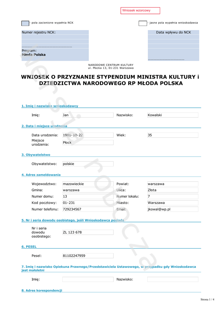 Wniosek wzorcowy pola zacienione wypełnia NCK Numer rejestru NCK: ……………………………………………… Program: Młoda Polska jasne pola wypełnia wnioskodawca Data wpływu do NCK ………………………………… NARODOWE CENTRUM KULTURY ul. Płocka 13, 01231 Warszawa WNIOSEK O PRZYZNANIE STYPENDIUM MINISTRA KULTURY i DZIEDZICTWA NARODOWEGO RP MŁODA POLSKA 1. Imię i nazwisko wnioskodawcy Imię: Jan Nazwisko: Kowalski 35 2. Data i miejsce urodzenia Data urodzenia: 19811022 Wiek: Miejsce urodzenia: Płock polskie 3. Obywatelstwo Obywatelstwo: 4. Adres zameldowania Wojewodztwo: mazowieckie Powiat: warszawa Gmina: warszawa Ulica: Złota Numer domu: 13 Numer lokalu: 7 Kod pocztowy: 01231 Miasto: Warszawa Numer telefonu: 729234567 Email: [email protected] 5. Nr i seria dowodu osobistego, jeśli Wnioskodawca posiada Nr i seria dowodu osobistego: ZL 123 678 81102247959 6. PESEL Pesel: 7. Imię i nazwisko Opiekuna Prawnego/Przedstawiciela Ustawowego, w przypadku gdy Wnioskodawca jest małoletni Imię: Nazwisko: 8. Adres korespondencji Strona 1 / 4 Wojewodztwo: Powiat: Gmina: Ulica: Numer domu: Numer lokalu: Kod pocztowy: Miasto: Numer telefonu: Email: 9. Nazwa uczelni/szkoły Nazwa uczelni: np. Akademia Muzyczna im. St. Moniuszki w Gdański np. I Wydz. Instrumentalny, Akademia Muzyczna im. St. Moniuszki w Gdańsku np. Zespół Szkół Muzycznych I i II st. Rok ukończenia: Uzyskany dyplom / tytuł: 2011 mgr student III roku np. Zespół Szkół Muzycznych I i II st. 2006 uczeń II klasy muzyk, ze spec. instr. w zakresie gry na skrzypcach 10. Znajomość języków obcych (jakie i w jakim stopniu) np. angielski średnio, zaawansowany (można podać nazwę certyfikatu) 11. Miejsce pracy, wyłącznie w przypadku pracy zarobkowej Nazwa instytucji/firmy: Filharminia Sudecka Ulica: Juliusza Słowackiego Numer domu: 4 Kod pocztowy: 58300 Miejscowoś ć: Wałbrzych Nr telefonu: 748423287 Email: [email protected] 12. Przebieg kariery artystycznej Należy podać TYLKO NAJWAŻNIEJSZE wydarzenia, np. ukończenie szkoły/dyplomy uczelni, prezentacje, c złonkostwa w gremiach/organizacjach zawodowych, jury, itd. 13. Udział w konkursach, warsztatach, seminariach, itp. (proszę podać daty oddo, miejsce, organizatorów, nazwiska prowadzących) W porządku chronologicznym poczynając od DAT AKTUALNYCH, przechodząc do STARSZYCH 2016, 2015, 2014, itd., należy podać UCZESTNICTWO we wszystkich, lub najważniejszych (według własnej opinii) formach edukacji, prezentacji, twórczości/działalności artystycznej, itd. Np. 2016 czerwiec, Międzynarodowy Kursy Muzyczne im. Z. Brzewskiego, Łancut, prow. prof. Andrzej Gębski 14. Udział w konkursach, festiwalach, wystawach, itp. (proszę podać osiągnięcia) W porządku chronologicznym poczynając od DAT AKTUALNYCH, przechodząc do STARSZYCH 2016, 2015, 2014, itd., należy podać formy prezentacji swojej twórczości/działalności artystycznej uhonorowane OFICJALNYMI NAGRODAMI, WYRÓŻNIENIAMI, SPECJALNĄ PUNKTACJĄ, itd, lub podać takie, które WEDŁUG WŁASNEJ OPINII uznaje się za OSIĄGNIĘCIA. Np. 2016 I miejsce w kat. 18 lat, za wykonanie Kaprysu N. Paganiniego. NP. 2016 zaproszenie do jubileuszowego koncertu Filharmonii Gdańskiej 15. Inne osiągnięcia artystyczne W porządku chronologicznym poczynając od DAT AKTUALNYCH, przechodząc do STARSZYCH 2016, 2015, 2014, itd., należy wymienić inne osiągnięcia/działalnoś ć artystyczną, a także z innych dziedzin, które według własnej opinii, uznaje się za ważne. Strona 2 / 4 16. Czy Pan / Pani ubiegał / ubiegała się o jakiekolwiek stypendium, w tym o stypendium z Programu Młoda Polska? (nie dotyczy stypendiów socjalnych) W przypadku odbycia stypendium proszę podać ramy czasowe, miejsce realizacji, pod czyim kierunkiem, przez kogo finansowane Nazwa stypendium Instytucja przyznająca stypendium Termin rozpoczęcia Termin zakończenia Cel przyznania stypendium Młoda Polska NCk 20120301 20121231 studia w Juilliard School of Music w Nowym Jorku 17. Nazwa (tytuł) projektu stypendialnego nie więcej niż 300 znaków łącznie ze spacjami Nagranie płyty CD z koncertami skrzypcowymi Karola Szymanowskiego. 18. Opis planowanego projektu stypendialnego (w tym: miejsce realizacji projektu, zakres realizowanych działań, harmonogram ich wykonania, planowane efekty przedsięwzięcia oraz sposób ich upowszechniania) nie więcej niż 7 200 znaków łącznie ze spacjami Należy wpisać wszystkie elementy, o których mowa w nawiasie powyżej. 19. Uzasadnienie celowości przyznania stypendium nie więcej niż 1800 znaków łącznie ze spacjami Stypendium przyczyni się do... 20. Budżet projektu stypendialnego Rodzaj kosztów wynajem studia honoraria muzyków towarzyszących mastering, produkcja PLN 10000.00 20000.00 50000.00 Koszty projektu ogółem: 80000.00 Wnioskowana kwota minimum 30 000 maksimum 50 000: 40000.00 21. W przypadku otrzymania stypendium wnioskuję o wypłatę (właściwe zakreślić) w miesięcznych ratach j k l m n jednorazowo i j k l m n 22. Uzasadnienie wniosku o jednorazową wypłatę stypendium nie więcej niż 900 znaków Konkretne argumenty przemawiające za koniecznością dysponowania cała kwota przyznanego stypendium. OŚWIADCZENIA Potwierdzam prawdziwość danych wpisanych we wniosku świadomy / świadoma odpowiedzialności karnej i, w przypadku gdy Wnioskodawca jest małoletni także Opiekuna Prawnego/Przedstawiciela Ustawowego. Wyrażam zgodę na przetwarzanie moich danych osobowych zawartych w złożonym przeze mnie wniosku i, w przypadku gdy Wnioskodawca jest małoletni także Opiekuna Prawnego/Przedstawiciela Ustawowego / zgodnie z Ustawą z dnia 29.08.1997 roku o Ochronie Danych Osobowych (Dz. U. z 2014 Strona 3 / 4 r. poz. 1182 ze zm.) Strona 4 / 4