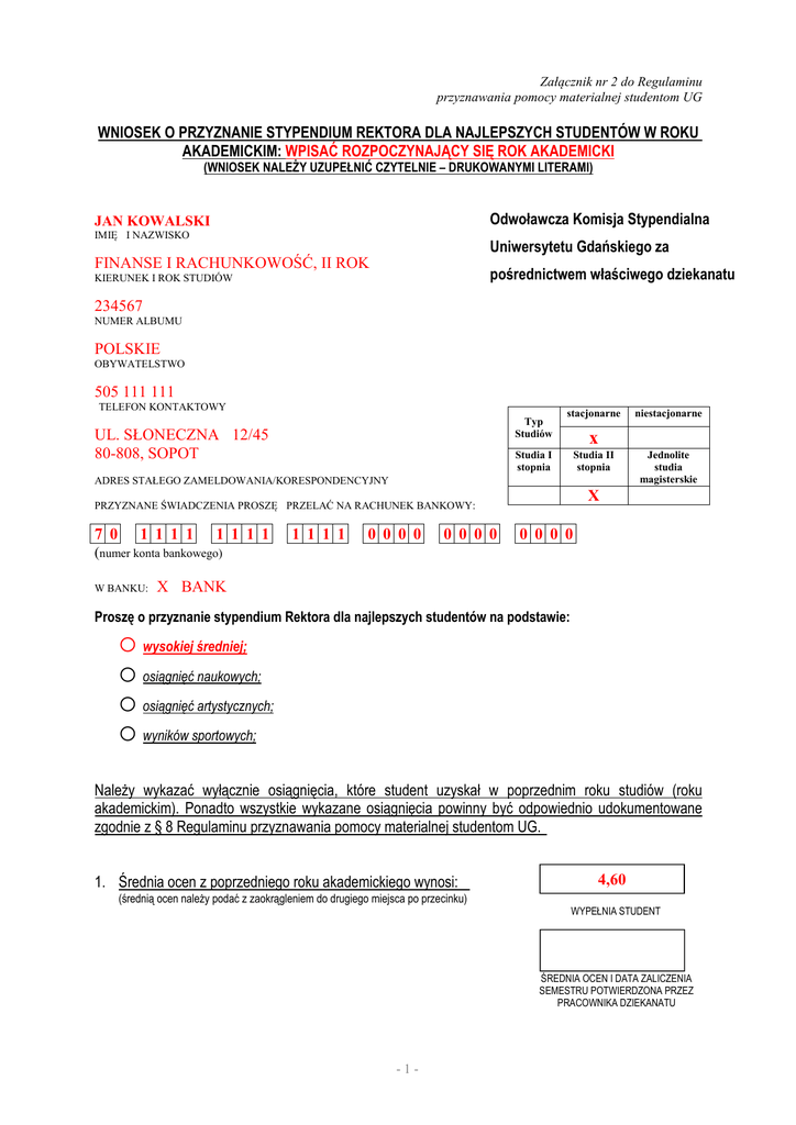 Załącznik nr 2 do Regulaminu przyznawania pomocy materialnej studentom UG WNIOSEK O PRZYZNANIE STYPENDIUM REKTORA DLA NAJLEPSZYCH STUDENTÓW W ROKU AKADEMICKIM: WPISAĆ ROZPOCZYNAJĄCY SIĘ ROK AKADEMICKI (WNIOSEK NALEŻY UZUPEŁNIĆ CZYTELNIE – DRUKOWANYMI LITERAMI) Odwoławcza Komisja Stypendialna JAN KOWALSKI IMIĘ I NAZWISKO Uniwersytetu Gdańskiego za FINANSE I RACHUNKOWOŚĆ, II ROK pośrednictwem właściwego dziekanatu KIERUNEK I ROK STUDIÓW 234567 NUMER ALBUMU POLSKIE OBYWATELSTWO 505 111 111 TELEFON KONTAKTOWY Typ Studiów UL. SŁONECZNA 12/45 80-808, SOPOT stacjonarne x Studia I stopnia Studia II stopnia ADRES STAŁEGO ZAMELDOWANIA/KORESPONDENCYJNY 1 1 1 1 1 1 1 1 1 1 1 1 0 0 0 0 0 0 0 0 Jednolite studia magisterskie X PRZYZNANE ŚWIADCZENIA PROSZĘ PRZELAĆ NA RACHUNEK BANKOWY: 7 0 niestacjonarne 0 0 0 0 (numer konta bankowego) W BANKU: X BANK Proszę o przyznanie stypendium Rektora dla najlepszych studentów na podstawie: o wysokiej średniej; o osiągnięć naukowych; o osiągnięć artystycznych; o wyników sportowych; Należy wykazać wyłącznie osiągnięcia, które student uzyskał w poprzednim roku studiów (roku akademickim). Ponadto wszystkie wykazane osiągnięcia powinny być odpowiednio udokumentowane zgodnie z § 8 Regulaminu przyznawania pomocy materialnej studentom UG. 1. Średnia ocen z poprzedniego roku akademickiego wynosi: 4,60 (średnią ocen należy podać z zaokrągleniem do drugiego miejsca po przecinku) WYPEŁNIA STUDENT ŚREDNIA OCEN I DATA ZALICZENIA SEMESTRU POTWIERDZONA PRZEZ PRACOWNIKA DZIEKANATU -1- 2. Informacja o urlopie dziekańskim, powtarzaniu przedmiotu lub okresu rozliczeniowego: WYPEŁNIĆ JEŻELI DOTYCZY………………………………………………………………………………………………………… 3. Oświadczam, iż w roku akademickim 2016/2017 uzyskałem/łam* następujące osiągnięcia naukowe, artystyczne, sportowe za poprzedni rok akademicki (dołączona dokumentacja powinna być w języku polskim): WYPEŁNIĆ W PRZYPADKU UBIEGANIA SIĘ O STYPENDIUM ZA OSIĄGNIĘCIA NAUKOWE, SPORTOWE LUB ARTYSTYCZNE…………………………………………………………………………………………………… ………………………………………………………………………………………………………………………… ………………………………………………………………………………………………………………………… ………………………………………………………………………………………………………………………… ………………………………………………………………………………………………………………………… ………………………………………………………………………………………………………………………… ………………………………………………………………………………………………………………………… Oświadczam, że: 1. Studiuję/nie studiuję* równocześnie na drugim kierunku studiów w, jeżeli tak proszę podać: nazwa Uczelni, wydział, kierunek: Uniwersytet Mikołaja Kopernika w Toruniu, Wydział Historyczny, kierunek: historia tryb i rok studiów (studia I, II stopnia, jednolite studia magisterskie): studia niestacjonarne II stopnia, I rok przewidziany regulaminem uczelni planowany termin ukończenia studiów: 30.09.2018r. 2. Ukończyłem/am / nie ukończyłem/am* kierunek studiów, jeżeli tak proszę podać: nazwa Uczelni, wydział, kierunek: Uniwersytet Gdański, Wydział Zarządzania, kierunek: Informatyka i Ekonometria tryb (studia I, II stopnia, jednolite studia magisterskie): tryb stacjonarny, studia I stopnia termin ukończenia studiów: 30.09.2015r. * 3. Nie pobieram i nie ubiegam się o przyznanie stypendium Rektora dla najlepszych studentów na innym kierunku lub na innej uczelni. 4. W przypadku otrzymania świadczeń pomocy materialnej na innym kierunku lub innej uczelni, jak również w przypadku wystąpienia każdej innej okoliczności mającej wpływ na prawo do świadczenia pomocy materialnej, fakt ten zgłoszę niezwłocznie do Odwoławczej Komisji Stypendialnej, a nienależnie pobrane świadczenia zostaną przeze mnie zwrócone. 5. Zapoznałem/am* się z Regulaminem przyznawania pomocy materialnej studentom UG oraz warunkami uprawniającymi do pobierania świadczeń z Funduszu Pomocy Materialnej Studentów i Doktorantów UG. - niepotrzebne skreślić Świadomy odpowiedzialności prawnej, w tym za podanie nieprawdziwych danych – łącznie z możliwością wydalenia mnie z Uczelni i konieczności zwrotu nieprawnie pobranych środków finansowych oraz odpowiedzialności karnej z art. 286 § 1 k.k. [kto, w celu osiągnięcia korzyści majątkowej, doprowadza inną osobę do niekorzystnego rozporządzenia własnym lub cudzym mieniem za pomocą wprowadzenia jej w błąd albo wyzyskania błędu lub niezdolności do należytego pojmowania przedsiębranego działania, podlega karze pozbawienia wolności od 6 miesięcy do lat 8] oraz odpowiedzialności dyscyplinarnej z art. 211 ustawy z dnia 27 lipca 2005 r. Prawo o szkolnictwie wyższym (t.j. DZ. U. z 2012 r., poz. 572 ze zm.) [Za naruszenie przepisów obowiązujących w uczelni oraz za czyny uchybiające godności studenta student ponosi odpowiedzialność dyscyplinarną przed komisją dyscyplinarną albo przed sądem koleżeńskim samorządu studenckiego, zwanym dalej „sądem koleżeńskim”] oświadczam, że wszystkie załączone dokumenty oraz dane w nich zawarte są kompletne i zgodne ze stanem faktycznym. W związku z ubieganiem się o przyznanie stypendium Rektora dla najlepszych studentów wyrażam zgodę na przetwarzanie przez Uniwersytet Gdański danych osobowych zawartych we wniosku oraz złożonych załącznikach -2- zgodnie z art. 23 ust.1 pkt 1 ustawy o ochronie danych osobowych ( Dz. U.