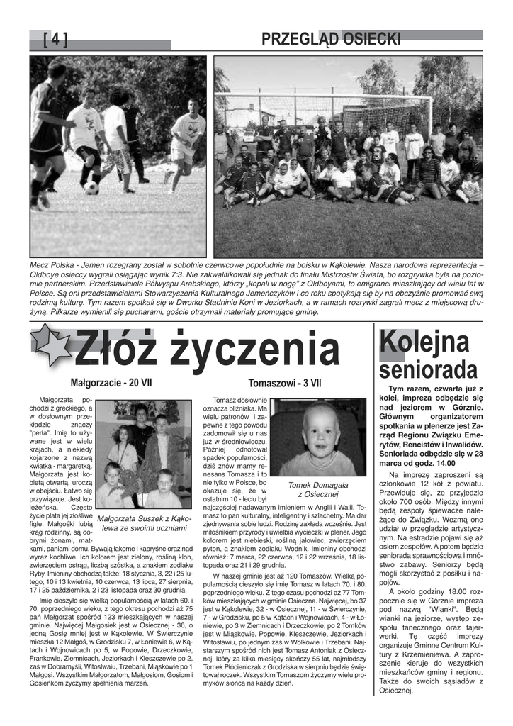 [4] PRZEGLĄD OSIECKI Mecz Polska - Jemen rozegrany został w sobotnie czerwcowe popołudnie na boisku w Kąkolewie. Nasza narodowa reprezentacja – Oldboye osieccy wygrali osiągając wynik 7:3. Nie zakwalifikowali się jednak do finału Mistrzostw Świata, bo rozgrywka była na poziomie partnerskim. Przedstawiciele Półwyspu Arabskiego, którzy „kopali w nogę” z Oldboyami, to emigranci mieszkający od wielu lat w Polsce. Są oni przedstawicielami Stowarzyszenia Kulturalnego Jemeńczyków i co roku spotykają się by na obczyźnie promować swą rodzimą kulturę. Tym razem spotkali się w Dworku Stadninie Koni w Jeziorkach, a w ramach rozrywki zagrali mecz z miejscową drużyną. Piłkarze wymienili się pucharami, goście otrzymali materiały promujące gminę. ZłóŜ Ŝyczenia Małgorzacie - 20 VII Małgorzata pochodzi z greckiego, a w dosłownym przekładzie znaczy "perła". Imię to używane jest w wielu krajach, a niekiedy kojarzone z nazwą kwiatka - margaretką. Małgorzata jest kobietą otwartą, uroczą w obejściu. Łatwo się przywiązuje. Jest koleżeńska. Często życie płata jej złośliwe Małgorzata Suszek z Kąkofigle. Małgośki lubią lewa ze swoimi uczniami krąg rodzinny, są dobrymi żonami, matkami, paniami domu. Bywają łakome i kapryśne oraz nad wyraz kochliwe. Ich kolorem jest zielony, rośliną klon, zwierzęciem pstrąg, liczbą szóstka, a znakiem zodiaku Ryby. Imieniny obchodzą także: 18 stycznia, 3, 22 i 25 lutego, 10 i 13 kwietnia, 10 czerwca, 13 lipca, 27 sierpnia, 17 i 25 października, 2 i 23 listopada oraz 30 grudnia. Imię cieszyło się wielką popularnością w latach 60. i 70. poprzedniego wieku, z tego okresu pochodzi aż 75 pań Małgorzat spośród 123 mieszkających w naszej gminie. Najwięcej Małgosiek jest w Osiecznej - 36, o jedną Gosię mniej jest w Kąkolewie. W Świerczynie mieszka 12 Małgoś, w Grodzisku 7, w Łoniewie 6, w Kątach i Wojnowicach po 5, w Popowie, Drzeczkowie, Frankowie, Ziemnicach, Jeziorkach i Kleszczewie po 2, zaś w Dobramyśli, Witosłwaiu, Trzebani, Miąskowie po 1 Małgosi. Wszystkim Małgorzatom, Małgosiom, Gosiom i Gosieńkom życzymy spełnienia marzeń. Tomaszowi - 3 VII Tomasz dosłownie oznacza bliźniaka. Ma wielu patronów i zapewne z tego powodu zadomowił się u nas już w średniowieczu. Później odnotował spadek popularności, dziś znów mamy renesans Tomasza i to nie tylko w Polsce, bo Tomek Domagała okazuje się, że w z Osiecznej ostatnim 10 - leciu był najczęściej nadawanym imieniem w Anglii i Walii. Tomasz to pan kulturalny, inteligentny i szlachetny. Ma dar zjednywania sobie ludzi. Rodzinę zakłada wcześnie. Jest miłośnikiem przyrody i uwielbia wycieczki w plener. Jego kolorem jest niebieski, rośliną jałowiec, zwierzęciem pyton, a znakiem zodiaku Wodnik. Imieniny obchodzi również: 7 marca, 22 czerwca, 12 i 22 września, 18 listopada oraz 21 i 29 grudnia. W naszej gminie jest aż 120 Tomaszów. Wielką popularnością cieszyło się imię Tomasz w latach 70. i 80. poprzedniego wieku. Z tego czasu pochodzi aż 77 Tomków mieszkających w gminie Osieczna. Najwięcej, bo 37 jest w Kąkolewie, 32 - w Osiecznej, 11 - w Świerczynie, 7 - w Grodzisku, po 5 w Kątach i Wojnowicach, 4 - w Łoniewie, po 3 w Ziemnicach i Drzeczkowie, po 2 Tomków jest w Miąskowie, Popowie, Kleszczewie, Jeziorkach i Witosławiu, po jednym zaś w Wolkowie i Trzebani. Najstarszym spośród nich jest Tomasz Antoniak z Osiecznej, który za kilka miesięcy skończy 55 lat, najmłodszy Tomek Płócieniczak z Grodziska w sierpniu będzie świętował roczek. Wszystkim Tomaszom życzymy wielu promyków słońca na każdy dzień. Kolejna seniorada Tym razem, czwarta już z kolei, impreza odbędzie się nad jeziorem w Górznie. Głównym organizatorem spotkania w plenerze jest Zarząd Regionu Związku Emerytów, Rencistów i Inwalidów. Senioriada odbędzie się w 28 marca od godz. 14.00 Na imprezę zaproszeni są członkowie 12 kół z powiatu. Przewiduje się, że przyjedzie około 700 osób. Między innymi będą zespoły śpiewacze należące do Związku. Wezmą one udział w przeglądzie artystycznym. Na estradzie pojawi się aż osiem zespołów. A potem będzie seniorada sprawnościowa i mnóstwo zabawy. Seniorzy będą mogli skorzystać z posiłku i napojów. A około godziny 18.00 rozpocznie się w Górznie impreza pod nazwą "Wianki". Będą wianki na jeziorze, występ zespołu tanecznego oraz fajerwerki. Tę część imprezy organizuje Gminne Centrum Kultury z Krzemieniewa. A zaproszenie kieruje do wszystkich mieszkańców gminy i regionu. Także do swoich sąsiadów z Osiecznej.