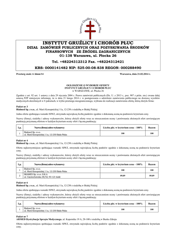INSTYTUT GRUŹLICY I CHORÓB PŁUC DZIAŁ ZAMÓWIEŃ PUBLICZNYCH ORAZ POZYSKIWANIA ŚRODKÓW FINANSOWYCH ZE ŹRÓDEŁ ZAGRANICZNYCH 01-138 Warszawa, ul. Płocka 26 Tel. +48224312312 Fax. +48224312421 KRS: 0000141482 NIP: 525-00-08-838 REGON: 000288490 Przetarg znak: 6 /dmm/14 Warszawa, dnia 21.02.2014 r. OGŁOSZENIE O WYBORZE OFERTY INSTYTUT GRUŹLICY I CHORÓB PŁUC w WARSZAWIE, ul. Płocka 26 Zgodnie z art. 92 ust. 1 ustawy z dnia 29 stycznia 2004 r. Prawo zamówień publicznych (Dz. U. z 2013 r., poz. 907 z późn. zm.) zwana dalej ustawą PZP niniejszym informuję, że w dniu 21 lutego 2014 r. w postępowaniu o udzielenie zamówienia publicznego na dostawę wyrobów medycznych określonych w 8 pakietach, w trybie przetargu nieograniczonego, wybrano do realizacji zamówienia ofertę, którą złożyła firma: Pakiet nr 3 Bialmed Sp. z o.o., ul. Marii Konopnickiej 11a, 12-230 z siedzibą w Białej Piskiej Jedna oferta spełniająca warunki SIWZ, otrzymała największą liczbę punktów zgodnie z dokonaną oceną na podstawie kryterium ceny. Nazwy (firmy), siedziby i adresy wykonawców, którzy złożyli oferty wraz ze streszczeniem oceny i porównania złożonych ofert zawierającym punktację przyznaną ofertom w każdym kryterium oceny ofert i łączną punktację: Lp. 1 Nazwa (firma) adres wykonawcy Liczba pkt. w kryterium cena – 100% Razem 100 100 Bialmed Sp. z o.o. ul. Marii Konopnickiej 11a, 12-230 Biała Piska Pakiet nr 4 Bialmed Sp. z o.o., ul. Marii Konopnickiej 11a, 12-230 z siedzibą w Białej Piskiej Oferta najkorzystniejsza spełniająca warunki SIWZ, otrzymała największą liczbę punktów zgodnie z dokonaną oceną na podstawie kryterium ceny. Nazwy (firmy), siedziby i adresy wykonawców, którzy złożyli oferty wraz ze streszczeniem oceny i porównania złożonych ofert zawierającym punktację przyznaną ofertom w każdym kryterium oceny ofert i łączną punktację: Lp. 1 2 Nazwa (firma) adres wykonawcy Liczba pkt. w kryterium cena – 100% Razem 100 100 89,89 89,89 Bialmed Sp. z o.o. ul. Marii Konopnickiej 11a, 12-230 Biała Piska SKAMEX Sp. z o.o. S.K-A ul. Częstochowska 38/52, 93-121 Łódź Pakiet nr 6 Bialmed Sp. z o.o., ul. Marii Konopnickiej 11a, 12-230 z siedzibą w Białej Piskiej Jedna oferta spełniająca warunki SIWZ, otrzymała największą liczbę punktów zgodnie z dokonaną oceną na podstawie kryterium ceny. Nazwy (firmy), siedziby i adresy wykonawców, którzy złożyli oferty wraz ze streszczeniem oceny i porównania złożonych ofert zawierającym punktację przyznaną ofertom w każdym kryterium oceny ofert i łączną punktację: Lp. 1 Nazwa (firma) adres wykonawcy Liczba pkt. w kryterium cena – 100% Razem 100 100 Bialmed Sp. z o.o. ul. Marii Konopnickiej 11a, 12-230 Biała Piska Pakiet nr 7 ARMED Dystrybucja Sprzętu Medycznego, ul. Kopernika 19 A, 28-100 z siedzibą w Busko Zdroju Oferta najkorzystniejsza spełniająca warunki SIWZ, otrzymała największą liczbę punktów zgodnie z dokonaną oceną na podstawie kryterium ceny. Nazwy (firmy), siedziby i adresy wykonawców, którzy złożyli oferty wraz ze streszczeniem oceny i porównania złożonych ofert zawierającym punktację przyznaną ofertom w każdym kryterium oceny ofert i łączną punktację: Lp. 1 2 Nazwa (firma) adres wykonawcy SKAMEX Sp. z o.o. S.K-A ul. Częstochowska 38/52, 93-121 Łódź ARMED Dystrybucja Sprzętu Medycznego, ul. Kopernika 19 A 28-100 Busko Zdrój Liczba pkt. w kryterium cena – 100% Razem 54,79 54,79 100 100 Pakiet nr 8 Beryl Med. Ltd. 1 st Floor, 26 Fouberts Place, Londyn, W1F 7PP, z siedzibą w UK Jedna oferta spełniająca warunki SIWZ, otrzymała największą liczbę punktów zgodnie z dokonaną oceną na podstawie kryterium ceny. Nazwy (firmy), siedziby i adresy wykonawców, którzy złożyli oferty wraz ze streszczeniem oceny i porównania złożonych ofert zawierającym punktację przyznaną ofertom w każdym kryterium oceny ofert i łączną punktację: Lp. 1 Nazwa (firma) adres wykonawcy Beryl Med. Ltd. 1 st Floor, 26 Fouberts Place, Londyn, W1F 7PP, UK Liczba pkt. w kryterium cena – 100% Razem 100 100 ZATWIERDZAM Z-ca Dyrektora ds. Techniczno-Administracyjnych mgr Włodzimierz Pomianowski Treść ogłoszenia została wywieszona na tablicy ogłoszeń IGICHP oraz zamieszczona na stronie internetowej www.igichp.edu.pl od dnia 21.02.2014 r. Instytut Gruźlicy i Chorób Płuc, ul. Płocka 26, 01-138 Warszawa. 2 Strona