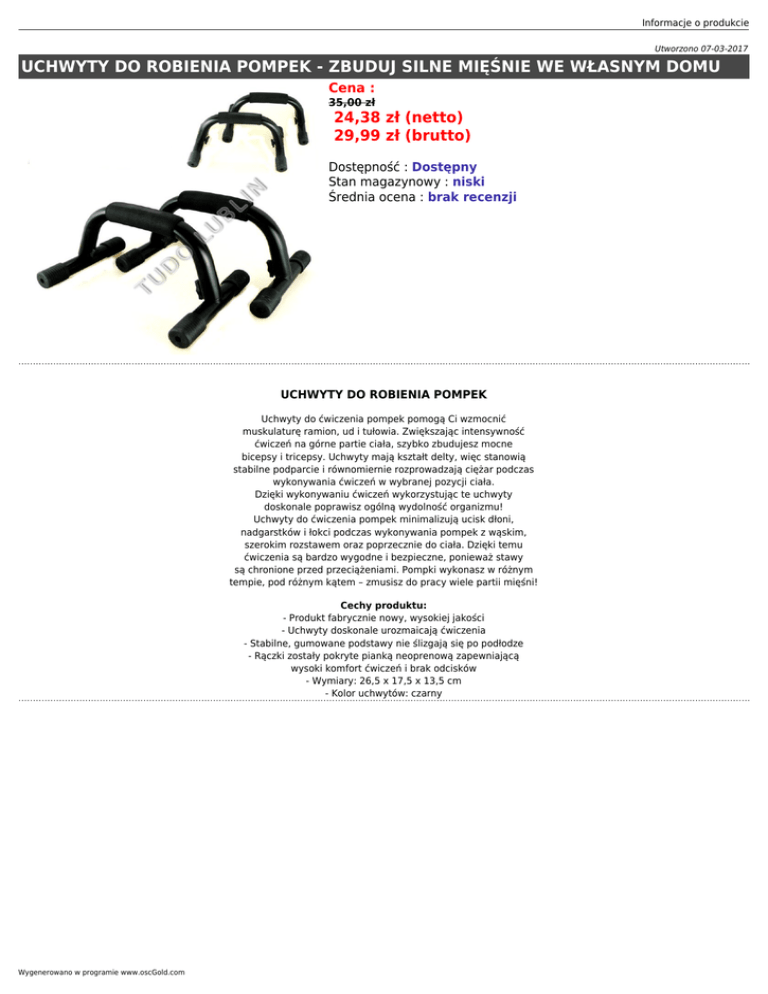 Informacje o produkcie Utworzono 07-03-2017 UCHWYTY DO ROBIENIA POMPEK - ZBUDUJ SILNE MIĘŚNIE WE WŁASNYM DOMU Cena : 35,00 zł 24,38 zł (netto) 29,99 zł (brutto) Dostępność : Dostępny Stan magazynowy : niski Średnia ocena : brak recenzji UCHWYTY DO ROBIENIA POMPEK Uchwyty do ćwiczenia pompek pomogą Ci wzmocnić muskulaturę ramion, ud i tułowia. Zwiększając intensywność ćwiczeń na górne partie ciała, szybko zbudujesz mocne bicepsy i tricepsy. Uchwyty mają kształt delty, więc stanowią stabilne podparcie i równomiernie rozprowadzają ciężar podczas wykonywania ćwiczeń w wybranej pozycji ciała. Dzięki wykonywaniu ćwiczeń wykorzystując te uchwyty doskonale poprawisz ogólną wydolność organizmu! Uchwyty do ćwiczenia pompek minimalizują ucisk dłoni, nadgarstków i łokci podczas wykonywania pompek z wąskim, szerokim rozstawem oraz poprzecznie do ciała. Dzięki temu ćwiczenia są bardzo wygodne i bezpieczne, ponieważ stawy są chronione przed przeciążeniami. Pompki wykonasz w różnym tempie, pod różnym kątem – zmusisz do pracy wiele partii mięśni! Cechy produktu: - Produkt fabrycznie nowy, wysokiej jakości - Uchwyty doskonale urozmaicają ćwiczenia - Stabilne, gumowane podstawy nie ślizgają się po podłodze - Rączki zostały pokryte pianką neoprenową zapewniającą wysoki komfort ćwiczeń i brak odcisków - Wymiary: 26,5 x 17,5 x 13,5 cm - Kolor uchwytów: czarny Wygenerowano w programie www.oscGold.com