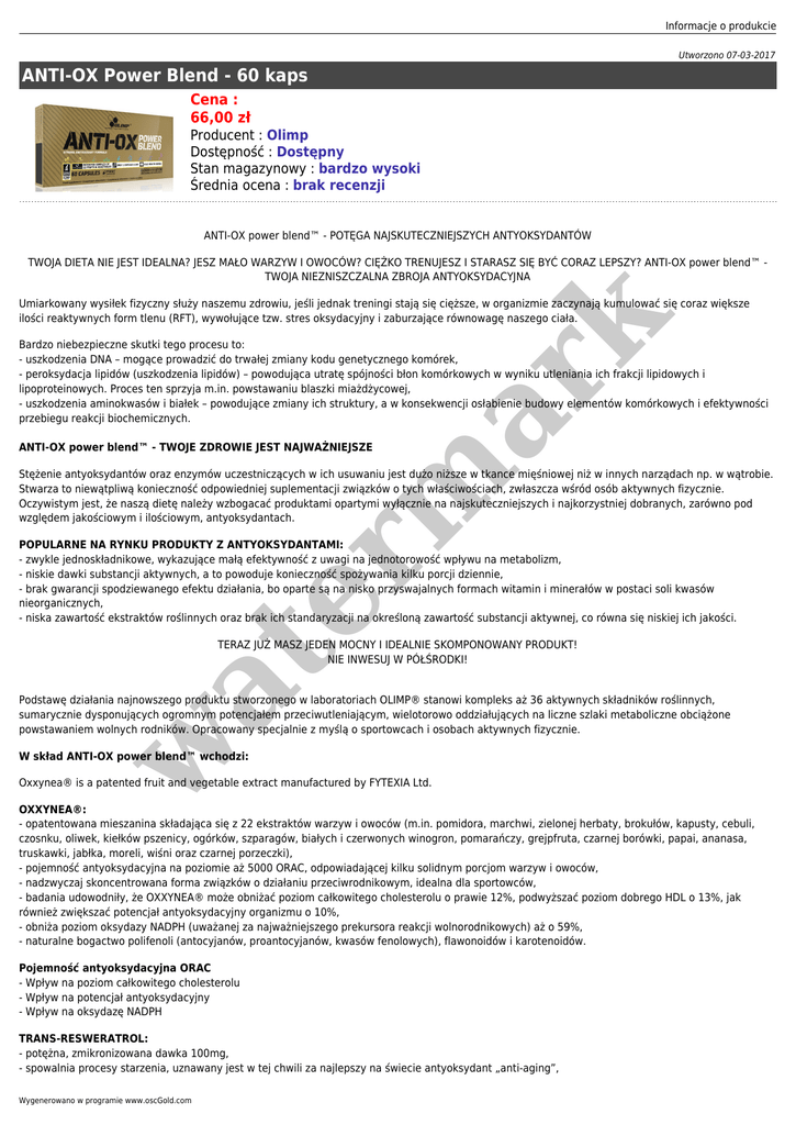 Informacje o produkcie Utworzono 07-03-2017 ANTI-OX Power Blend - 60 kaps Cena : 66,00 zł Producent : Olimp Dostępność : Dostępny Stan magazynowy : bardzo wysoki Średnia ocena : brak recenzji ANTI-OX power blend™ - POTĘGA NAJSKUTECZNIEJSZYCH ANTYOKSYDANTÓW TWOJA DIETA NIE JEST IDEALNA? JESZ MAŁO WARZYW I OWOCÓW? CIĘŻKO TRENUJESZ I STARASZ SIĘ BYĆ CORAZ LEPSZY? ANTI-OX power blend™ TWOJA NIEZNISZCZALNA ZBROJA ANTYOKSYDACYJNA er m ar k Umiarkowany wysiłek fizyczny służy naszemu zdrowiu, jeśli jednak treningi stają się cięższe, w organizmie zaczynają kumulować się coraz większe ilości reaktywnych form tlenu (RFT), wywołujące tzw. stres oksydacyjny i zaburzające równowagę naszego ciała. Bardzo niebezpieczne skutki tego procesu to: - uszkodzenia DNA – mogące prowadzić do trwałej zmiany kodu genetycznego komórek, - peroksydacja lipidów (uszkodzenia lipidów) – powodująca utratę spójności błon komórkowych w wyniku utleniania ich frakcji lipidowych i lipoproteinowych. Proces ten sprzyja m.in. powstawaniu blaszki miażdżycowej, - uszkodzenia aminokwasów i białek – powodujące zmiany ich struktury, a w konsekwencji osłabienie budowy elementów komórkowych i efektywności przebiegu reakcji biochemicznych. ANTI-OX power blend™ - TWOJE ZDROWIE JEST NAJWAŻNIEJSZE Stężenie antyoksydantów oraz enzymów uczestniczących w ich usuwaniu jest dużo niższe w tkance mięśniowej niż w innych narządach np. w wątrobie. Stwarza to niewątpliwą konieczność odpowiedniej suplementacji związków o tych właściwościach, zwłaszcza wśród osób aktywnych fizycznie. Oczywistym jest, że naszą dietę należy wzbogacać produktami opartymi wyłącznie na najskuteczniejszych i najkorzystniej dobranych, zarówno pod względem jakościowym i ilościowym, antyoksydantach. POPULARNE NA RYNKU PRODUKTY Z ANTYOKSYDANTAMI: - zwykle jednoskładnikowe, wykazujące małą efektywność z uwagi na jednotorowość wpływu na metabolizm, - niskie dawki substancji aktywnych, a to powoduje konieczność spożywania kilku porcji dziennie, - brak gwarancji spodziewanego efektu działania, bo oparte są na nisko przyswajalnych formach witamin i minerałów w postaci soli kwasów nieorganicznych, - niska zawartość ekstraktów roślinnych oraz brak ich standaryzacji na określoną zawartość substancji aktywnej, co równa się niskiej ich jakości. at TERAZ JUŻ MASZ JEDEN MOCNY I IDEALNIE SKOMPONOWANY PRODUKT! NIE INWESUJ W PÓŁŚRODKI! w Podstawę działania najnowszego produktu stworzonego w laboratoriach OLIMP® stanowi kompleks aż 36 aktywnych składników roślinnych, sumarycznie dysponujących ogromnym potencjałem przeciwutleniającym, wielotorowo oddziałujących na liczne szlaki metaboliczne obciążone powstawaniem wolnych rodników. Opracowany specjalnie z myślą o sportowcach i osobach aktywnych fizycznie. W skład ANTI-OX power blend™ wchodzi: Oxxynea® is a patented fruit and vegetable extract manufactured by FYTEXIA Ltd. OXXYNEA®: - opatentowana mieszanina składająca się z 22 ekstraktów warzyw i owoców (m.in. pomidora, marchwi, zielonej herbaty, brokułów, kapusty, cebuli, czosnku, oliwek, kiełków pszenicy, ogórków, szparagów, białych i czerwonych winogron, pomarańczy, grejpfruta, czarnej borówki, papai, ananasa, truskawki, jabłka, moreli, wiśni oraz czarnej porzeczki), - pojemność antyoksydacyjna na poziomie aż 5000 ORAC, odpowiadającej kilku solidnym porcjom warzyw i owoców, - nadzwyczaj skoncentrowana forma związków o działaniu przeciwrodnikowym, idealna dla sportowców, - badania udowodniły, że OXXYNEA® może obniżać poziom całkowitego cholesterolu o prawie 12%, podwyższać poziom dobrego HDL o 13%, jak również zwiększać potencjał antyoksydacyjny organizmu o 10%, - obniża poziom oksydazy NADPH (uważanej za najważniejszego prekursora reakcji wolnorodnikowych) aż o 59%, - naturalne bogactwo polifenoli (antocyjanów, proantocyjanów, kwasów fenolowych), flawonoidów i karotenoidów. Pojemność antyoksydacyjna ORAC - Wpływ na poziom całkowitego cholesterolu - Wpływ na potencjał antyoksydacyjny - Wpływ na oksydazę NADPH TRANS-RESWERATROL: - potężna, zmikronizowana dawka 100mg, - spowalnia procesy starzenia, uznawany jest w tej chwili za najlepszy na świecie antyoksydant „anti-aging”, Wygenerowano w programie www.oscGold.com w at er m ar k - wzmacnia system nerwowy i immunologiczny, poprawia funkcję śródbłonka naczyń krwionośnych, zwiększa ich elastyczność, zapobiega rozwijaniu się w nich stanów zapalnych, a tym samym zmian miażdżycowych, - minimalizuje niepożądane skutki działania estradiolu (wykazuje aktywność inhibitora aromatazy), - przypisuje mu się działanie przeciwnowotworowe, - zmniejsza tempo rozpadu włókien kolagenowych w skórze, jak również w ścięgnach i więzadłach stawowych, wywierając pozytywny wpływ na regenerację stawów, - aby w pełni wykorzystać potencjał tego związku, należy podawać go z innymi flawonoidami, zwiększającymi jego biodostępność i poziom aktywności jednym z ważniejszych jest obecna w ANTI-OX power blend™ kwercetyna, a także likopen oraz ekstrakt z zielonej herbaty. EKSTRAKT RHODIOLA ROSEA: - polifenole, w tym rozawina (najważniejsza substancja czynna różeńca górskiego) wykazują właściwości antystresowe i przeciwdepresyjne, - rozawina wpływa pozytywnie na mięsień sercowy, działa przeciwnowotworowo, immunostymulująco i przeciwutleniająco, - odpowiada za polepszenie funkcji intelektualnych, - doskonale chroni wątrobę w kuracjach opartych na zabronionym w sporcie dopingu. ASTAKSANTYNA: - naturalnie produkowana m.in. przez algi i plankton morski, - posiada właściwości hamowania stanów zapalnych, reguluje poziom cholesterolu, a także zwiększa wrażliwość komórek na insulinę (można, więc polecić ją diabetykom), - przyspiesza redukcję tkanki tłuszczowej i zwiększa wytrzymałość w trakc