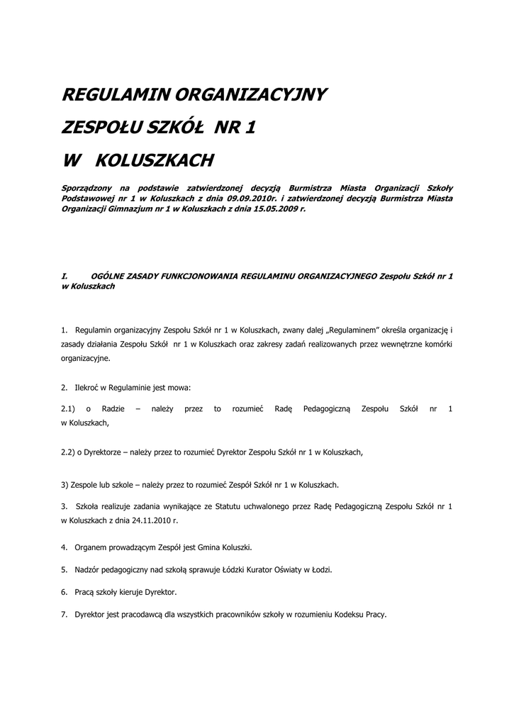 REGULAMIN ORGANIZACYJNY ZESPOŁU SZKÓŁ NR 1 W KOLUSZKACH Sporządzony na podstawie zatwierdzonej decyzją Burmistrza Miasta Organizacji Szkoły Podstawowej nr 1 w Koluszkach z dnia 09.09.2010r. i zatwierdzonej decyzją Burmistrza Miasta Organizacji Gimnazjum nr 1 w Koluszkach z dnia 15.05.2009 r. I. OGÓLNE ZASADY FUNKCJONOWANIA REGULAMINU ORGANIZACYJNEGO Zespołu Szkół nr 1 w Koluszkach 1. Regulamin organizacyjny Zespołu Szkół nr 1 w Koluszkach, zwany dalej „Regulaminem” określa organizację i zasady działania Zespołu Szkół nr 1 w Koluszkach oraz zakresy zadań realizowanych przez wewnętrzne komórki organizacyjne. 2. Ilekroć w Regulaminie jest mowa: 2.1) o Radzie – należy przez to rozumieć Radę Pedagogiczną Zespołu Szkół nr 1 w Koluszkach, 2.2) o Dyrektorze – należy przez to rozumieć Dyrektor Zespołu Szkół nr 1 w Koluszkach, 3) Zespole lub szkole – należy przez to rozumieć Zespół Szkół nr 1 w Koluszkach. 3. Szkoła realizuje zadania wynikające ze Statutu uchwalonego przez Radę Pedagogiczną Zespołu Szkół nr 1 w Koluszkach z dnia 24.11.2010 r. 4. Organem prowadzącym Zespół jest Gmina Koluszki. 5. Nadzór pedagogiczny nad szkołą sprawuje Łódzki Kurator Oświaty w Łodzi. 6. Pracą szkoły kieruje Dyrektor. 7. Dyrektor jest pracodawcą dla wszystkich pracowników szkoły w rozumieniu Kodeksu Pracy. II. STRUKTURA ORGANIZACYJNA ZESPOŁU SZKÓŁ NR 1 W KOLUSZKACH 1. W ramach szkoły zostały wyodrębnione niżej wymienione komórki organizacyjne: 1) dyrektor, 2) wicedyrektor ds. szkoły podstawowej, 3) wicedyrektor ds. gimnazjum 4) nauczyciele, 5) pedagog, 6) główny księgowy, 7) z-ca głównego księgowego 8) sekretarz szkoły – Szkoły Podstawowej nr 1 w Koluszkach 9) sekretarz szkoły – Gimnazjum nr 1 w Koluszkach 10) pracownicy obsługi (sprzątaczki, kucharka, pomoc kuchenna, intendent, konserwator, palacz c.o.) 11) rada rodziców, 12) rady klasowe, 13) uczniowie. III. ZADANIA REALIZOWANE W SZKOLE: 1. Dyrektor szkoły: 1) sprawowanie nadzoru nad zgodnością pracy szkoły z przepisami oświatowymi oraz postanowieniami statutu, 2) reprezentowanie szkoły na zewnątrz, 3) wykonywanie wobec pracowników czynności wynikających z przepisów prawa pracy określonych dla pracodawcy, 4) sprawowanie nadzoru pedagogicznego nad nauczycielami, i pedagogiem pracującymi w zespole szkół według obowiązujących przepisów, 5) bibliotekarzami realizowanie zadań w zakresie awansu zawodowego nauczycieli wynikających z obowiązujących przepisów, 6) zapewnienie, w miarę możliwości, odpowiednich warunków organizacyjnych do realizacji zadań dydaktycznych i opiekuńczo-wychowawczych szkoły, 7) dysponowanie środkami określonymi w planie finansowym szkoły i ponoszenie odpowiedzialności za ich prawidłowe wykorzystanie, 8) organizowanie administracyjnej, finansowej i gospodarczej działalności zespołu szkół, 9) sprawowanie opieki nad uczniami, zapewnianie warunków harmonijnego ich rozwoju, podejmowanie decyzji w sprawach uczniów zgodne z prawem oświatowym i Statutami Szkół, 10) udzielanie zezwolenia na spełnianie obowiązku nauki ucznia poza szkołą, 11) udzielanie zezwolenia na realizację przez ucznia indywidualnego programu lub toku nauki oraz wyznaczanie uczniowi nauczyciela-opiekuna, 12) kierowanie pracą rady pedagogicznej, 13) koordynowanie pracy organów szkoły: samorządu uczniowskiego, rady rodziców, rady pedagogicznej, 14) realizowanie uchwał rady pedagogicznej podejmowanych w ramach jej kompetencji stanowiących, 15) rozpoznawanie potrzeb szkoły i wypracowanie koncepcji jej rozwoju, 16) informowanie organu prowadzącego o potrzebach i problemach szkoły. 2. Wicedyrektor szkoły ds. szkoły podstawowej i ds. gimnazjum: 1) organizowanie pracy dydaktycznej szkoły: a) prawidłowe funkcjonowanie podziału godzin, b) odpowiednie wykorzystanie sal lekcyjnych, c) zastępstwa za nieobecnych nauczycieli, d) nadzór nad dokumentacją szkolną: dzienniki lekcyjne, arkusze ocen, dzienniki zajęć pozalekcyjnych, e) nadzór pedagogiczny nad nauczycielami zgodnie z corocznie przyjętym planem, f) organizacje i nadzór nad działalnością kół przedmiotowych, kół zainteresowań, olimpiad, konkursów, g) organizowanie dyżurów nauczycieli. 2) nadzorowanie i tygodniowy plan zajęć. pracy zespołów opracowujących 3) organizowanie pracy wychowawczej szkoły: a) realizacja kalendarza uroczystości, konkursów i olimpiad przedmiotowych, dokumenty programowe b) prawidłowe wykonanie przydzielonych zadań w zakresie działań opiekuńczo – wychowawczych (bieżąca kontrola i ocena), c) koordynowanie czynności związanych z oceną roczną pracy opiekuńczo – wychowawczej szkoły, d) właściwe funkcjonowanie zespołu wychowawczego oraz komisji d/s pomocy materialnej ucznia, e) przestrzeganie dyscypliny pracy uczniów, f) dbanie o estetykę szkoły. 4) wykonywanie innych zadań zleconych przez dyrektora, 5) wicedyrektor wykonuje obowiązki dyrektora w czasie jego nieobecności. 3. Nauczyciele: 1) dbanie o prawidłowy przebieg realizacji podstawy programowej w powierzonych klasach (grupach), 2) prawidłowe prowadzenie dokumentacji szkolnej, 3) wspieranie rozwoju psychofizycznego uczniów, ich zdolności oraz zainteresowań, 4) zapewnienie powierzonym uczniom bezpieczeństwa na zajęciach w szkole oraz organizowanych przez szkołę, pełnienie dyżuru podczas przerw zgodnie z harmonogramem, 5) kierowanie się obiektywizmem i bezstronnością w ocenie postępów ucznia zgodnie z kryteriami zawartymi w Wewnątrzszkolnym Systemie Oceniania, 6) udzielanie pomocy w przezwyciężaniu niepowodzeń szkolnych, w oparciu o rozeznanie potrzeb uczniów, 7) stałe podnoszenie w dostępnych formach, 8) swoich umiejętności zawodowych, podejmowanie doskonalenia zawodowego dbanie o pomoce dydaktyczne i sprzęt szkolny, 9) udzielanie rodzicom informacji o bieżących i okresowych wynikach w nauce ich dzieci w rozmowach indywidualnych w c