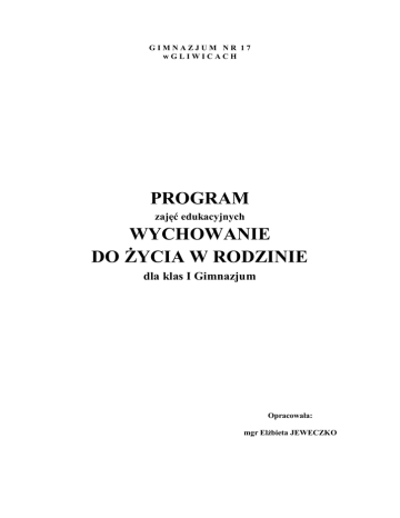 GIMNAZJUM NR 17 wGLIWICACH PROGRAM zajęć edukacyjnych WYCHOWANIE DO ŻYCIA W RODZINIE dla klas I Gimnazjum Opracowała: mgr Elżbieta JEWECZKO CEL EDUKACYJNY: Wychowanie moralno – etyczne w świecie wartości i norm oraz postaw i czynów w kontekście uwrażliwienie młodego człowieka na integrację człowieczej duchowości z człowieczą płciowością, nakierunkowane na wszechstronny rozwój młodego człowieka, ze względu na jego współuczestniczenie w życiu rodzinnym i społecznym. L.P. 1. FORMA REALIZACJI Wprowadzenie w Uczeń zna organizację Miniwykład. problematykę zajęć. Rozmowy indywychowania do widualne i grupowe życia w rodzinie. TEMAT ZADANIA 2. Rodzina –Społeczeństwo – Państwo. Ukazanie człowieka w jego wymiarze osobowym w rodzinie, społecznym w społeczeństwie, obywatelskim w państwie. Ćwiczenia nakierowane na temat, miniwykład, ćwiczenia podsumowujące. 3. Rodzina, jako wspólnota osób. Ukazanie rodziny, jako wspólnoty osób ludzkich w kontekście więzi prywatnych i więzi intymnych, warunkowanych wartościami i normami moralnymi. Ćwiczenia nakierowane na temat Stawianie tez miniwykładu, ćwiczenia podsumowujące. 4. Rodzina podsta- Ukazanie rodziny w wową komórką kontekście rodu ojca i rodu. rodu matki. Miniwykład. Praca indywidualna i grupowa, ćwiczenia ukierunkowane na temat. OSIĄGNIĘCIA UCZNIA 1. Wie, co jest przedmiotem zajęć. 2. Zna podstawowe słownictwo związane z przedmiotem. 3. Przejawia zainteresowanie problematyką. 1. Potrafi scharakteryzować osobę. 2. Jest świadomy pełnienia przez siebie różnych ról społecznych. 3. Potrafi scharakteryzować osobę będącą obywatelem. 4. Wie, co to jest rodzina, społeczeństwo, państwo. 5. Uchwyci istotną różnicę w funkcjonowaniu człowieka, w rodzinie, społeczeństwie, państwie. 1. Wie, co to jest wspólnota osób, której fundamentem jest miłość. 2. Wie, że więzi intymne i prywatne warunkowane są wartościami i normami moralnymi. 3. Jest uwrażliwiony na ochronę więzi intymnych i prywatnych w rodzinie. 1. Wie, że rodziny poprzez zwarte małżeństwo stanowią ród. 2. Umie rozróżnić rodzinę od rodu i narodu. 3. Przejawia poczucie dumy z przynależ- L.P. 5. 6. TEMAT Dziecko, jako osoba w rodzinie. Wartości i normy moralne osoby w rodzinie. ZADANIA FORMA REALIZACJI Opis i wyjaśnienie atry- Ćwiczenia nakiebutów człowieka, jako runkowane na teosoby ludzkiej. mat, praca indywidualna i grupowa. 1. Uwrażliwienie na wartości i normy moralne osoby w rodzinie. 1. Ćwiczenia nakierunkowane na temat, praca indywidualna i grupowa. 2. 2. 3. 4. 7. 8. Formacja charak- Uwrażliwienie młodego teru moralnego w człowieka na charakter rodzinie. moralny. Ćwiczenia nakierunkowane na temat, praca indywidualna i grupowa. 1. Dylematy etyczne Uwrażliwienie na dylei prawne w rodzi- maty etyczne i prawne nie. w rodzinie. Ćwiczenia nakierunkowane na temat, praca indywidualna i grupowa. 1. 2. 2. 3. 9. Socjalizacja a resocjalizacja w rodzinie. Ukazanie rodziny, jako miejsca socjalizacji. Ćwiczenia nakierunkowane na temat, praca indywidualna i grupowa. 1. 2. 3. 10. Anatomia i fizjologia układu płciowego żeńskiego. Nabycie rzetelnej wiedzy z zakresu anatomii i fizjologii układu płciowego żeńskiego w kli- Miniwykład. Praca indywidualna i grupowa, ćwiczenia ukierunkowane 1. 2. OSIĄGNIĘCIA UCZNIA ności do swojej rodziny. Wie, że w człowieku można wyróżnić trzy sfery. Wie, że człowiek, jako osoba wyróżnia się ze świata zwierzęcego sferą umysłową. Potrafi rozróżnić czyny, których podstawą są wartości moralne. Wie, co to jest wartość i norma moralna. Wie, że normy są nakazujące i zakazujące. Wie, że w okresie dojrzewania pojawiają się dylematy moralne. Wie, co to jest charakter moralny. Wzbudzi refleksję nad formacją własnego charakteru. Wie, co to jest wartość kulturowa, norma etyczna, dylematy etyczne. Wie, co to jest władza rodzicielska. Wie, że przekraczanie prawa może być przyczyną rozpadu lub tragedii w rodzinie. Wie i zna atrybuty rodziny prawidłowe. Wie, co to jest rodzina niepełna, dysfunkcyjna. Wie, co to jest resocjalizacja. Potrafi nazwać narządy wewnętrzne i zewnętrze. Zna fizjologię narzą- L.P. TEMAT ZADANIA macie szacunku dla ludzkiej płciowości. 11. 12. 13. Anatomia i fizjologia układu płciowego męskiego. Psychofizjologia dojrzewania dziewcząt i chłopców. Sposoby radzenia sobie z trudnościami okresu dojrzewania. FORMA REALIZACJI na temat. 3. Nabycie rzetelnej wiedzy z zakresu anatomii i fizjologii układu płciowego męskiego w klimacie szacunku dla ludzkiej płciowości. Miniwykład. Praca indywidualna i grupowa, ćwiczenia ukierunkowane na temat. Opis – w klimacie szacunku do płci przeciwnej – psychofizjologia dojrzewania dziewcząt i chłopców z jednoczesnym uchwyceniem istotnych różnic. Ćwiczenia nakierunkowane na temat, praca indywidualna i grupowa. Opis i wyjaśnienie trudności związanych z okresem dojrzewania, ale i pomoc w ich przezwyciężaniu. Ćwiczenia nakierunkowane na temat, rozmowy indywidualne i grupowe. 1. 2. 3. 1. 2. 1. 2. 14. Higiena okresu dojrzewania dziewcząt i chłopców. Odpowiednie motywowanie młodzieży do prowadzenia higienicznego trybu życia. Ćwiczenia nakierunkowane na temat, rozmowy indywidualne i grupowe. 1. 2. OSIĄGNIĘCIA UCZNIA dów płciowych. Akceptuje cykliczność zmian hormonalnych w organizmie. Potrafi nazwać narządy wewnętrzne i zewnętrze. Zna fizjologię narządów płciowych. Akceptuje cykliczność zmian hormonalnych w organizmie. Wie, jakie zmiany zachodzą w organizmie w okresie dojrzewania. Jest przygotowany do zrozumienia i zaakceptowania zmian psychofizycznych związanych z okresem dojrzewania. Wie, że w okresie dojrzewania pojawiają się problemy natury psychoseksualnej, egzystencjalnej czy moralnej. Wie, do kogo może zwrócić się o pomoc w przypadku pojawienia się trudności. Branie odpowiedzialności za własne zdr