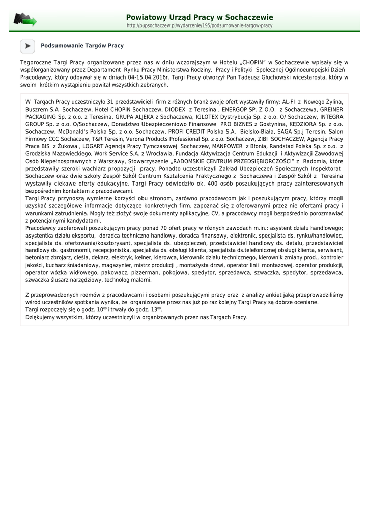 Powiatowy Urząd Pracy w Sochaczewie http://pupsochaczew.pl/wydarzenie/195/podsumowanie-targow-pracy Podsumowanie Targów Pracy Tegoroczne Targi Pracy organizowane przez nas w dniu wczorajszym w Hotelu „CHOPIN” w Sochaczewie wpisały się w współorganizowany przez Departament Rynku Pracy Ministerstwa Rodziny, Pracy i Polityki Społecznej Ogólnoeuropejski Dzień Pracodawcy, który odbywał się w dniach 04-15.04.2016r. Targi Pracy otworzył Pan Tadeusz Głuchowski wicestarosta, który w swoim krótkim wystąpieniu powitał wszystkich zebranych. W Targach Pracy uczestniczyło 31 przedstawicieli firm z różnych branż swoje ofert wystawiły firmy: AL-FI z Nowego Żylina, Buszrem S.A Sochaczew, Hotel CHOPIN Sochaczew, DIODEX z Teresina , ENERGOP SP. Z O.O. z Sochaczewa, GREINER PACKAGING Sp. z o.o. z Teresina, GRUPA ALJEKA z Sochaczewa, IGLOTEX Dystrybucja Sp. z o.o. O/ Sochaczew, INTEGRA GROUP Sp. z o.o. O/Sochaczew, Doradztwo Ubezpieczeniowo Finansowe PRO BIZNES z Gostynina, KĘDZIORA Sp. z o.o. Sochaczew, McDonald's Polska Sp. z o.o. Sochaczew, PROFI CREDIT Polska S.A. Bielsko-Biała, SAGA Sp.j Teresin, Salon Firmowy CCC Sochaczew, T&R Teresin, Verona Products Professional Sp. z o.o. Sochaczew, ZIBI SOCHACZEW, Agencja Pracy Praca BIS z Żukowa , LOGART Agencja Pracy Tymczasowej Sochaczew, MANPOWER z Błonia, Randstad Polska Sp. z o.o. z Grodziska Mazowieckiego, Work Service S.A. z Wrocławia, Fundacja Aktywizacja Centrum Edukacji i Aktywizacji Zawodowej Osób Niepełnosprawnych z Warszawy, Stowarzyszenie „RADOMSKIE CENTRUM PRZEDSIĘBIORCZOŚCI” z Radomia, które przedstawiły szeroki wachlarz propozycji pracy. Ponadto uczestniczyli Zakład Ubezpieczeń Społecznych Inspektorat Sochaczew oraz dwie szkoły Zespół Szkół Centrum Kształcenia Praktycznego z Sochaczewa i Zespół Szkół z Teresina wystawiły ciekawe oferty edukacyjne. Targi Pracy odwiedziło ok. 400 osób poszukujących pracy zainteresowanych bezpośrednim kontaktem z pracodawcami. Targi Pracy przynoszą wymierne korzyści obu stronom, zarówno pracodawcom jak i poszukującym pracy, którzy mogli uzyskać szczegółowe informacje dotyczące konkretnych firm, zapoznać się z oferowanymi przez nie ofertami pracy i warunkami zatrudnienia. Mogły też złożyć swoje dokumenty aplikacyjne, CV, a pracodawcy mogli bezpośrednio porozmawiać z potencjalnymi kandydatami. Pracodawcy zaoferowali poszukującym pracy ponad 70 ofert pracy w różnych zawodach m.in.: asystent działu handlowego; asystentka działu eksportu, doradca techniczno handlowy, doradca finansowy, elektronik, specjalista ds. rynku/handlowiec, specjalista ds. ofertowania/kosztorysant, specjalista ds. ubezpieczeń, przedstawiciel handlowy ds. detalu, przedstawiciel handlowy ds. gastronomii, recepcjonistka, specjalista ds. obsługi klienta, specjalista ds.telefonicznej obsługi klienta, serwisant, betoniarz zbrojarz, cieśla, dekarz, elektryk, kelner, kierowca, kierownik działu technicznego, kierownik zmiany prod., kontroler jakości, kucharz śniadaniowy, magazynier, mistrz produkcji , montażysta drzwi, operator linii montażowej, operator produkcji, operator wózka widłowego, pakowacz, pizzerman, pokojowa, spedytor, sprzedawca, szwaczka, spedytor, sprzedawca, szwaczka ślusarz narzędziowy, technolog malarni. Z przeprowadzonych rozmów z pracodawcami i osobami poszukującymi pracy oraz z analizy ankiet jaką przeprowadziliśmy wśród uczestników spotkania wynika, że organizowane przez nas już po raz kolejny Targi Pracy są dobrze oceniane. Targi rozpoczęły się o godz. 1000 i trwały do godz. 1300. Dziękujemy wszystkim, którzy uczestniczyli w organizowanych przez nas Targach Pracy.