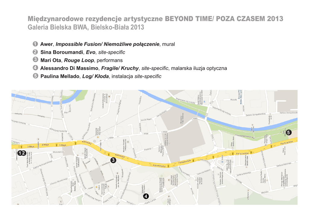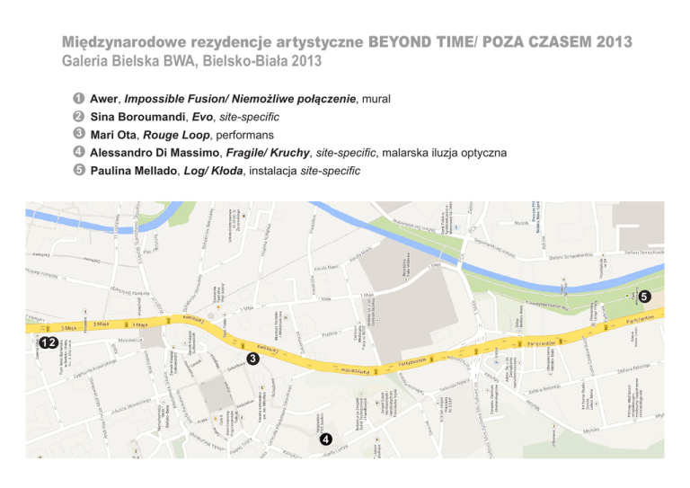 Międzynarodowe rezydencje artystyczne BEYOND TIME/ POZA CZASEM 2013 Galeria Bielska BWA, Bielsko-Biała 2013 1 Awer, Impossible Fusion/ Niemożliwe połączenie, mural 2 Sina Boroumandi, Evo, site-specific 3 Mari Ota, Rouge Loop, performans 4 Alessandro Di Massimo, Fragile/ Kruchy, site-specific, malarska iluzja optyczna 5 Paulina Mellado, Log/ Kłoda, instalacja site-specific 5 12 3 4