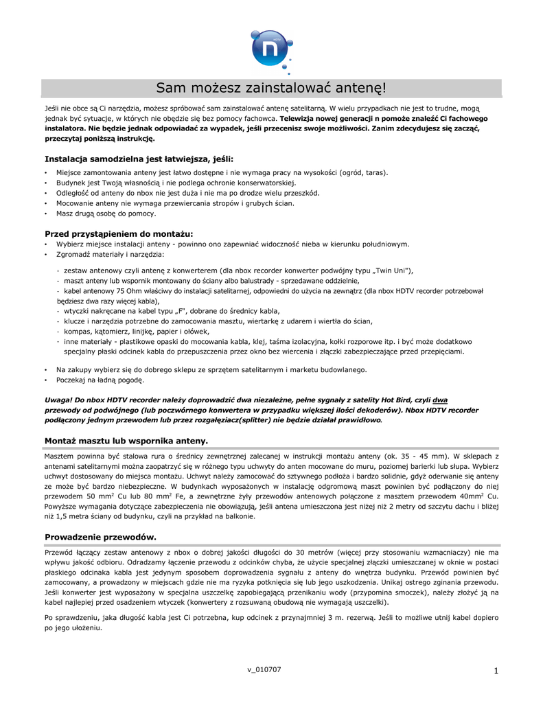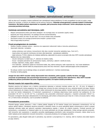 Sam możesz zainstalować antenę! Jeśli nie obce są Ci narzędzia, możesz spróbować sam zainstalować antenę satelitarną. W wielu przypadkach nie jest to trudne, mogą jednak być sytuacje, w których nie obędzie się bez pomocy fachowca. Telewizja nowej generacji n pomoże znaleźć Ci fachowego instalatora. Nie będzie jednak odpowiadać za wypadek, jeśli przecenisz swoje możliwości. Zanim zdecydujesz się zacząć, przeczytaj poniższą instrukcję. Instalacja samodzielna jest łatwiejsza, jeśli: • Miejsce zamontowania anteny jest łatwo dostępne i nie wymaga pracy na wysokości (ogród, taras). • Budynek jest Twoją własnością i nie podlega ochronie konserwatorskiej. • • Odległość od anteny do nbox nie jest duża i nie ma po drodze wielu przeszkód. Mocowanie anteny nie wymaga przewiercania stropów i grubych ścian. • Masz drugą osobę do pomocy. Przed przystąpieniem do montażu: • • Wybierz miejsce instalacji anteny - powinno ono zapewniać widoczność nieba w kierunku południowym. Zgromadź materiały i narzędzia: - zestaw antenowy czyli antenę z konwerterem (dla nbox recorder konwerter podwójny typu „Twin Uni"), - maszt anteny lub wspornik montowany do ściany albo balustrady - sprzedawane oddzielnie, - kabel antenowy 75 Ohm właściwy do instalacji satelitarnej, odpowiedni do użycia na zewnątrz (dla nbox HDTV recorder potrzebował będziesz dwa razy więcej kabla), - wtyczki nakręcane na kabel typu „F", dobrane do średnicy kabla, - klucze i narzędzia potrzebne do zamocowania masztu, wiertarkę z udarem i wiertła do ścian, - kompas, kątomierz, linijkę, papier i ołówek, - inne materiały - plastikowe opaski do mocowania kabla, klej, taśma izolacyjna, kołki rozporowe itp. i być może dodatkowo specjalny płaski odcinek kabla do przepuszczenia przez okno bez wiercenia i złączki zabezpieczające przed przepięciami. • Na zakupy wybierz się do dobrego sklepu ze sprzętem satelitarnym i marketu budowlanego. • Poczekaj na ładną pogodę. Uwaga! Do nbox HDTV recorder należy doprowadzić dwa niezależne, pełne sygnały z satelity Hot Bird, czyli dwa przewody od podwójnego (lub poczwórnego konwertera w przypadku większej ilości dekoderów). Nbox HDTV recorder podłączony jednym przewodem lub przez rozgałęziacz(splitter) nie będzie działał prawidłowo. Montaż masztu lub wspornika anteny. Masztem powinna być stalowa rura o średnicy zewnętrznej zalecanej w instrukcji montażu anteny (ok. 35 - 45 mm). W sklepach z antenami satelitarnymi można zaopatrzyć się w różnego typu uchwyty do anten mocowane do muru, poziomej barierki lub słupa. Wybierz uchwyt dostosowany do miejsca montażu. Uchwyt należy zamocować do sztywnego podłoża i bardzo solidnie, gdyż oderwanie się anteny ze może być bardzo niebezpieczne. W budynkach wyposażonych w instalację odgromową maszt powinien być podłączony do niej przewodem 50 mm2 Cu lub 80 mm2 Fe, a zewnętrzne żyły przewodów antenowych połączone z masztem przewodem 40mm2 Cu. Powyższe wymagania dotyczące zabezpieczenia nie obowiązują, jeśli antena umieszczona jest niżej niż 2 metry od szczytu dachu i bliżej niż 1,5 metra ściany od budynku, czyli na przykład na balkonie. Prowadzenie przewodów. Przewód łączący zestaw antenowy z nbox o dobrej jakości długości do 30 metrów (więcej przy stosowaniu wzmacniaczy) nie ma wpływu jakość odbioru. Odradzamy łączenie przewodu z odcinków chyba, że użycie specjalnej złączki umieszczanej w oknie w postaci płaskiego odcinaka kabla jest jedynym sposobem doprowadzenia sygnału z anteny do wnętrza budynku. Przewód powinien być zamocowany, a prowadzony w miejscach gdzie nie ma ryzyka potknięcia się lub jego uszkodzenia. Unikaj ostrego zginania przewodu. Jeśli konwerter jest wyposażony w specjalna uszczelkę zapobiegającą przenikaniu wody (przypomina smoczek), należy złożyć ją na kabel najlepiej przed osadzeniem wtyczek (konwertery z rozsuwaną obudową nie wymagają uszczelki). Po sprawdzeniu, jaka długość kabla jest Ci potrzebna, kup odcinek z przynajmniej 3 m. rezerwą. Jeśli to możliwe utnij kabel dopiero po jego ułożeniu. v_010707 1 Wtyczki "F" trzeba nakręcać ciasno na kabel koncentryczny, posługując się w razie potrzeby szczypcami (lepiej użyć specjalnego kluczyka). Ważne jest staranne przygotowanie przewodu do zamontowania wtyczki i na koniec sprawdzenie czy fragment metalowego oplotu kabla koncentrycznego nie zwiera się z żyłą środkową. Rysunki ilustrujące poszczególne fazy osadzania wtyczki typu "F". 1 2 3 4 5 6 Montaż i wstępne ustawienie anteny. Po złożeniu anteny zgodnie z załączoną instrukcją i zamontowaniu konwertera regulujemy wstępnie kąt konwertera A i kąt elewacji B zgodnie z opisem i rysunkami. Zestawienie wartości kątów potrzebnych do ustawienia anteny: Miasto Białystok Bydgoszcz Ełk Gdańsk Gorzów Wielkopolski Kalisz Kielce Kołobrzeg Kraków Lublin Olsztyn Opole Rzeszów Szczecin Warszawa Wrocław Zielona Góra A (kąt konwertera) B (kąt elewacji) C (kąt od kierunku południe) 8 28,6 12,6 4 29,1 6,2 7 28,3 11,6 4 27,8 7,0 2 29,7 2,9 4 30,6 6,5 6 31,3 9,9 2 28,1 3,2 6 32,2 9,0 7 30,7 12,0 5 28,3 9,2 4 31,8 6,4 7 31,9 11,7 1 29,0 1,9 6 29,8 10,1 3 31,4 5,2 2 30,5 3,2 v_010707 2 Ustawienie kąta konwertera - A. Jeśli na konwerterze jest skala, bądź posiadasz kątomierz, obróć konwerter w mocowaniu o kąt A odczytany z tabeli właściwy dla najbliższego miasta. Kąt A odmierzaj od pionu przeciwnie do ruchu wskazówek zegara patrząc na antenę z przodu (od strony konwertera). Na tym etapie instalacji dokładne ustawienie kąta A nie jest konieczne. Poprawki wprowadzisz w końcowej fazie ustawienia anteny. Zablokuj ustawienie śrubami mocującymi konwerter w wysięgniku. Ustawienie kąta elewacji - B. Drugim krokiem jest ustawienie kąta B – tzw. kąta elewacji, czyli takiego, pod którym antena patrzy w górę. Kąt ten us