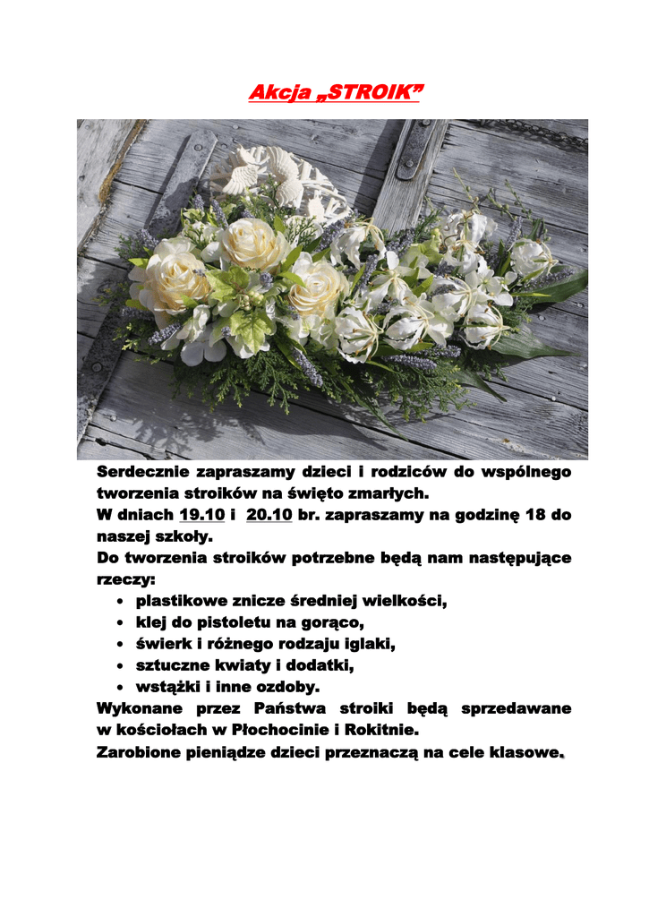 Akcja „STROIK” Serdecznie zapraszamy dzieci i rodziców do wspólnego tworzenia stroików na święto zmarłych. W dniach 19.10 i 20.10 br. zapraszamy na godzinę 18 do naszej szkoły. Do tworzenia stroików potrzebne będą nam następujące rzeczy: plastikowe znicze średniej wielkości, klej do pistoletu na gorąco, świerk i różnego rodzaju iglaki, sztuczne kwiaty i dodatki, wstążki i inne ozdoby. Wykonane przez Państwa stroiki będą sprzedawane w kościołach w Płochocinie i Rokitnie. Zarobione pieniądze dzieci przeznaczą na cele klasowe.