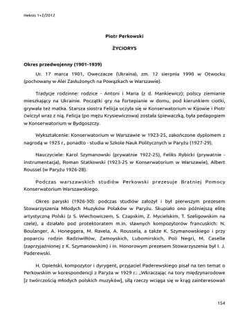 Heksis 1+2/2012 Piotr Perkowski ŻYCIORYS Okres przedwojenny (1901-1939) Ur. 17 marca 1901, Oweczacze (Ukraina), zm. 12 sierpnia 1990 w Otwocku (pochowany w Alei Zasłużonych na Powązkach w Warszawie). Tradycje rodzinne: rodzice - Antoni i Maria (z d. Mankiewicz); polscy ziemianie mieszkający na Ukrainie. Początki gry na fortepianie w domu, pod kierunkiem ciotki, grywała też matka. Starsza siostra Felicja uczyła się w Konserwatorium w Kijowie i Piotr ćwiczył wraz z nią. Felicja (po mężu Krysiewiczowa) została śpiewaczką, była pedagogiem w Konserwatorium w Bydgoszczy. Wykształcenie: Konserwatorium w Warszawie w 1923-25, zakończone dyplomem z nagrodą w 1925 r., ponadto - studia w Szkole Nauk Politycznych w Paryżu (1927-29). Nauczyciele: Karol Szymanowski (prywatnie 1922-25), Feliks Rybicki (prywatnie instrumentacja), Roman Statkowski (1923-25 w Konserwatorium w Warszawie), Albert Roussel (w Paryżu 1926-28). Podczas warszawskich studiów Perkowski prezesuje Bratniej Pomocy Konserwatorium Warszawskiego. Okres paryski (1926-30): podczas studiów założył i był pierwszym prezesem Stowarzyszenia Młodych Muzyków Polaków w Paryżu. Skupiało ono późniejszą elitę artystyczną Polski (z S. Wiechowiczem, S. Czapskim, Z. Mycielskim, T. Szeligowskim na czele), a działało pod protektoratem m.in. sławnych kompozytorów francuskich: N. Boulanger, A. Honeggera, M. Ravela, A. Roussela, a także K. Szymanowskiego i przy poparciu rodzin Radziwiłłów, Zamoyskich, Lubomirskich, Poli Negri, M. Caselle (zaprzyjaźnionej z K. Szymanowskim) i in. Honorowym prezesem Stowarzyszenia był I. J. Paderewski. H. Opieński, kompozytor i dyrygent, przyjaciel Paderewskiego pisał na ten temat o Perkowskim w korespondencji z Paryża w 1929 r.: „Wkraczając na tory międzynarodowe [z twórczością młodych polskich muzyków], siłą rzeczy wciąga się w krąg zainteresowań 154 Heksis 1+2/2012 Francuzów i muzyków innych narodowości. Inicjator i prezes, p. Perkowski, jest duszą Stowarzyszenia. Dzięki jego energii, zdolnościom organizacyjnym, przedsiębiorczości i rozległym stosunkom, działalność Stowarzyszenia zawdzięcza swój chlubny i pomyślny rozwój” („Dziennik Poznański” z 8 lipca 1929 r.). W tym samym czasie Perkowski przewodniczy Komisji Muzycznej Towarzystwa Popierania Stosunków Literacko-Artystycznych między Polską a Francją. Okres warszawski (1930-35): po powrocie z Francji P. Perkowski rozpoczął działalność jako wiceprezes lub członek zarządu warszawskiego Towarzystwa Wydawniczego Muzyki Polskiej, a także jako wiceprzewodniczący lub członek zarządu w Sekcji Polskiej Międzynarodowego Towarzystwa Muzyki Współczesnej (1929-39). W roku 1930 był ponadto dyrektorem warszawskiego Towarzystwa Muzyki Symfonicznej. Okres toruński (1936-39): po powrocie z Paryża Piotr Perkowski został profesorem i dyrektorem Konserwatorium i Pomorskiego Towarzystwa Muzycznego w Toruniu. K. Szymanowski, w liście rekomendującym go na to stanowisko, pisał: „(...) jest on bowiem nie tylko wysoce uzdolnionym kompozytorem i poważnie wykształconym muzykiem (...), lecz jednocześnie wykazał w swej działalności w Paryżu rzadki wśród artystów dar organizacyjny (...), jestem bowiem przekonany, iż trudno by było o trafniejszy wybór, zwłaszcza że nie mówiąc już o kwali)kacjach fachowych - «last not least» - ma się tu do czynienia z człowiekiem z dobrej sfery i o nieposzlakowanej prawości i charakterze” (pismo Szymanowskiego - rektora Państwowego Konserwatorium Muzycznego w Warszawie z dn. 13 VI 1931 r.). Po 1 września 1939 r. P. Perkowski wyjechał z Torunia i wraz z wojskiem gen. Tokarzewskiego (ówczesnego szefa DOK Toruń) dostał się do Warszawy. Okres okupacji (1939-45) W czasie II wojny i okupacji Piotr Perkowski niezwykle prężnie kierował warszawską Spółdzielnią Artystów (pod patronatem Rady Głównej Opiekuńczej), która mieściła się na tyłach „Zachęty”, pomagając m.in. w sprawach bytowych, w ukrywaniu osób ze środowiska muzyków i plastyków. Współdziałał aktywnie w Ruchu Oporu, jako organizator i kierownik akcji samopomocowej (wraz z pośrednictwem pracy) w 155 Heksis 1+2/2012 kawiarence „Lira” na ul. Szpitalnej. Organizował też tajne koncerty i tajne nauczanie na poziomie Konserwatorium. W jego mieszkaniu na ul. Puławskiej (blisko Gestapo) odbywały się zebrania konspiracyjne sztabu gł. AK; tu przechowywano broń, dokumenty, skoczków londyńskich; a także Żydów. Ponadto Piotr Perkowski był inicjatorem i kierownikiem „Tajnych zespołów programowych dla szkolnictwa muzycznego” oraz ds. „Organizacji życia muzycznego po wyzwoleniu Kraju”, a także komisji ds. odbudowy Opery i Filharmonii, zespołu delegatów do sprawy organizacji i opieki (po zakończeniu wojny) nad ocalałym majątkiem instytucji muzycznych itp. Chcąc ratować szkatułę z sercem K. Szymanowskiego, przeniósł ją ze Szpitala Ujazdowskiego do kapliczki (na ul. Raszyńskiej), która później spłonęła. Uczestniczył w Powstaniu Warszawskim pod pseudonimem dr Puławski. Jako tzw. „delegat rządu” działał na terenie Śródmieście-Północ (miejsce kontaktowe: ul. Bracka 23). Zorganizował miejscową ludność w ekipy do utworzenia szpitali polowych (odnalazł też w piwnicach ZG PCK kilku lekarzy), ekipy ds. bytowych, aprowizacji, grzebania zmarłych itp. Po kapitulacji Warszawy sformował grupy (zw. Polnische Rotes KreutzTransportgruppe) złożone z młodzieży Warszawy (łączników własnej Delegatury oraz pozostałych wciąż żołnierzy-powstańców) z zadaniem wyszukiwania w gruzach i ewakuowania osób, które nie mogły o własnych siłach wyjść z Warszawy. W ten sposób, prócz rannych, chorych i niedołężnych, uchronił też tę młodzież przed wysyłką do obozów. W kierowanej osobiście przez Perkowskiego grupie uratowano m.in. Marię Rodziewiczównę i pianistkę Marię Ogilbiankę (ciężko ran