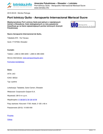 Ameryka Południowa » Ekwador » Lotnisko Port lotniczy Quito - Aeropuerto Internacional Mariscal Sucre www.lotniska.info 2015-09-20 - Monika Pietryga Port lotniczy Quito - Aeropuerto Internacional Mariscal Sucre Międzynarodowy Port Lotniczy Quito jest jednym z największych lotnisk w Ekwadorze. Ilość obsługiwanych co roku pasażerów klasyfikuje go na liście najważniejszych portów lotniczych Ameryki Południowej. Nuevo Aeropuerto Internacional de Quito, Tababela S/N - Via Yaruqui, Quito 17107032, Ekwador Kontakt: Telefon: +(593 2) 395-4200 / +(593 2) 395-4300 Strona internetowa: www.aeropuertoquito.aero Formularz kontaktowy Dane: IATA: UIO ICAO: SEQU Typ: cywilne Lokalizacja: Tababela, Quito Canton, Ekwador Właściciel: Corporación Quiport S.A. Wysokość: 2813 m n.p.m. Współrzędne: 0°08′28″S 78°29′18″W Pasy startowe: Kierunek 17/35: Asfalt, 3 120 x 46 m Pasażerowie (2012): 10 000 000 Przyloty Odloty http://www.lotniska.info/lotnisko,port-lotniczy-quito-aeropuerto-internacional-mariscal-sucre,394.html strona 1 / 3 Ameryka Południowa » Ekwador » Lotnisko Port lotniczy Quito - Aeropuerto Internacional Mariscal Sucre www.lotniska.info Linie lotnicze operujące z lotniska Quito: -loty międzynarodowe -loty krajowe Zobacz lądowanie na lotnisku Mariscal Sucre - Quito (wideo): Opis: Międzynarodowy Port Lotniczy Quito położony jest około 18 km. na wschód od starówki miasta Quito, w Tababeli. Znany jest też pod tą nazwą - Aeropuerto de Tababela. Port lotniczy został nazwany na cześć wenezuelskiego generała Antonio José de Sucre - bohatera walk niepodległościowych w Ekwadorze. Lotnisko zostało otwarte 20 lutego 2013 roku i zastąpiło stary port lotniczy Quito. Jest bazą dla flagowej linii lotniczej TAME, obsługującej około 220 lotów tygodniowo. JAK DOJECHAĆ? Autobusem - Aeroservicios Nowy Port Lotniczy Mariscal Sucre jest dobrze skomunikowany z miastem Quito. Codziennie, przez całą dobę, co około 30 minut kursują autobusy firmy Aeroservicios. Bilet kosztuje US$8 i można go kupić online: www.aeroservicios.com.ec lub w kasach znajdujących się w hali przylotów na lotnisku. Wypożyczenie samochodu Na lotnisku możemy wynając samochód z następującymi firmami: Hertz, Avis, Localiza, Budget, EXPO Rent a Car, Servirent, Team Rent a Car. Więcej informacji na stronie. Taksówką -"Taxi Servicios" http://www.lotniska.info/lotnisko,port-lotniczy-quito-aeropuerto-internacional-mariscal-sucre,394.html strona 2 / 3 Ameryka Południowa » Ekwador » Lotnisko Port lotniczy Quito - Aeropuerto Internacional Mariscal Sucre www.lotniska.info Oficjalną firmą obsługującą port lotniczy Quito jest New Mariscal Sucre International Airport Cooperative. Działa non stop, we wszystkie dni w tygodniu. Korzystając z taksówek, należy pamiętać, by licznik był właczony. Źródło: (wikipedia, aeropuertoquito.aero) http://www.lotniska.info/lotnisko,port-lotniczy-quito-aeropuerto-internacional-mariscal-sucre,394.html http://www.lotniska.info/lotnisko,port-lotniczy-quito-aeropuerto-internacional-mariscal-sucre,394.html Powered by TCPDF (www.tcpdf.org) strona 3 / 3