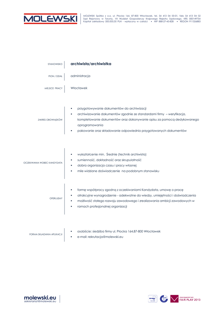 MOLEWSKI Spółka z o.o. ul. Płocka 164, 87-800 Włocławek, tel. 54 413 04 00-01, faks 54 413 04 02 Sąd Rejonowy w Toruniu, VII Wydział Gospodarczy Krajowego Rejestru Sądowego, KRS 000149754 Kapitał zakładowy 500.000,00 PLN - wpłacony w całości • NIP 888-27-45-828 • REGON 911326883 STANOWISKO archiwista/archiwistka PION / DZIAŁ administracja MIEJSCE PRACY Włocławek przygotowywanie dokumentów do archiwizacji archiwizowanie dokumentów zgodnie ze standardami firmy – weryfikacja, kompletowanie dokumentów oraz dokonywanie opisu za pomocą dedykowanego ZAKRES OBOWIĄZKÓW oprogramowania OCZEKIWANIA WOBEC KANDYDATA OFERUJEMY FORMA SKŁADANIA APLIKACJI pakowanie oraz składowanie odpowiednio przygotowanych dokumentów wykształcenie min. Średnie (technik archiwista) sumienność, dokładność oraz skrupulatność dobra organizacja czasu i pracy własnej mile widziane doświadczenie na podobnym stanowisku formę współpracy zgodną z oczekiwaniami Kandydata, umowę o pracę atrakcyjne wynagrodzenie - adekwatne do wiedzy, umiejętności i doświadczenia możliwość stałego rozwoju zawodowego i zrealizowania ambicji zawodowych w ramach profesjonalnej organizacji osobiście: siedziba firmy ul. Płocka 164,87-800 Włocławek e-mail: [email protected]