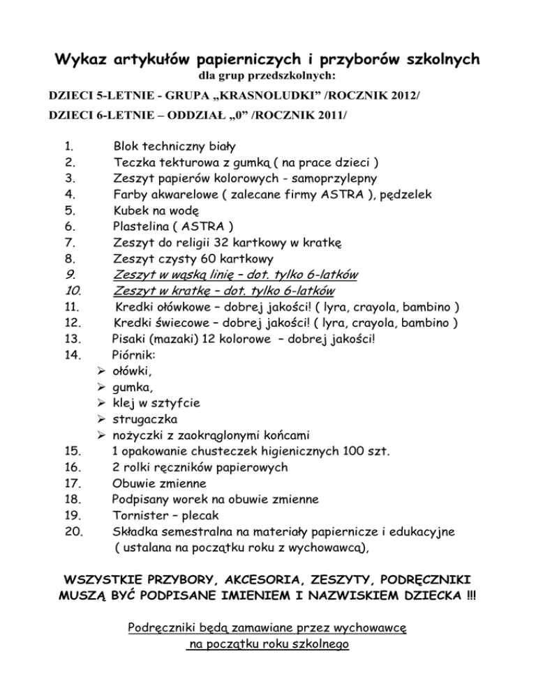 Wykaz artykułów papierniczych i przyborów szkolnych dla grup przedszkolnych: DZIECI 5-LETNIE - GRUPA „KRASNOLUDKI” /ROCZNIK 2012/ DZIECI 6-LETNIE – ODDZIAŁ „0” /ROCZNIK 2011/ 1. 2. 3. 4. 5. 6. 7. 8. Blok techniczny biały Teczka tekturowa z gumką ( na prace dzieci ) Zeszyt papierów kolorowych - samoprzylepny Farby akwarelowe ( zalecane firmy ASTRA ), pędzelek Kubek na wodę Plastelina ( ASTRA ) Zeszyt do religii 32 kartkowy w kratkę Zeszyt czysty 60 kartkowy 9. 10. Zeszyt w wąską linię – dot. tylko 6-latków Zeszyt w kratkę – dot. tylko 6-latków 11. 12. 13. 14. Kredki ołówkowe – dobrej jakości! ( lyra, crayola, bambino ) Kredki świecowe – dobrej jakości! ( lyra, crayola, bambino ) Pisaki (mazaki) 12 kolorowe – dobrej jakości! Piórnik: ołówki, gumka, klej w sztyfcie strugaczka nożyczki z zaokrąglonymi końcami 1 opakowanie chusteczek higienicznych 100 szt. 2 rolki ręczników papierowych Obuwie zmienne Podpisany worek na obuwie zmienne Tornister – plecak Składka semestralna na materiały papiernicze i edukacyjne ( ustalana na początku roku z wychowawcą), 15. 16. 17. 18. 19. 20. WSZYSTKIE PRZYBORY, AKCESORIA, ZESZYTY, PODRĘCZNIKI MUSZĄ BYĆ PODPISANE IMIENIEM I NAZWISKIEM DZIECKA !!! Podręczniki będą zamawiane przez wychowawcę na początku roku szkolnego INNE WAŻNE INFORMACJE ROZPOCZĘCIE ROKU SZKOLNEGO Rok szkolny 2017/2018 rozpocznie się 01 września 2017 /piątek/ mszą świętą w kościele (godzina podawana podczas ogłoszeń parafialnych, zazwyczaj 8.00), następnie dzieci wraz z rodzicami udają się do szkoły gdzie około 9.30 na sali gimnastycznej odbędzie się krótka akademia, po akademii dzieci wraz z rodzicami udają się do wyznaczonych klas na spotkanie z wychowawcą. ŻYWIENIE Dzieci w oddziałach przedszkolnych i zerowych obowiązkowo korzystają z dożywiania. Odpłatności za żywienie przyjmowane są w sekretariacie szkoły pokój 38, I piętro, zawsze w ostatnim tygodniu miesiąca poprzedzającego miesiąc żywieniowy, (np. na wrzesień płacimy w ostatnim tygodniu sierpnia, na październik płacimy w ostatnim tygodniu września, itd.). Wysokość opłat uzależniona jest od liczby dni w miesiącu. Stawka dzienna dla dzieci korzystających z jednego posiłku obiadowego wynosi 2,50 zł. Np. we wrześniu 2017 będziemy mieć: 20 dni nauki x 2,50 zł = 50,00 zł INNE OPŁATY Na każdy nowy rok szkolny szkoła obejmuje ubezpieczeniem grupowym NW wszystkie dzieci, stawka ubezpieczenia ustalana jest corocznie z ubezpieczycielem, składka zazwyczaj nie przekracza kwoty 50 zł od każdego dziecka. Rodzice zobowiązani są do dokonania opłaty do połowy września lub złożenia pisemnego oświadczenia o nieubezpieczaniu dziecka. Składka na Radę Rodziców – stawka ustalana przez przedstawicieli Klasowych Rad Rodziców na początku każdego roku szkolnego. Okolicznościowe składki na potrzeby klasowe, uroczystości, wycieczki itp. Numery telefonów kontaktowych do szkoły: Dyrektor / Katarzyna Sudoł / – (15) 87 94 089 Wicedyrektor / Aneta Sekulska / – 699 671 049 Sekretariat / Monika Ziober / - (15) 87 94 309