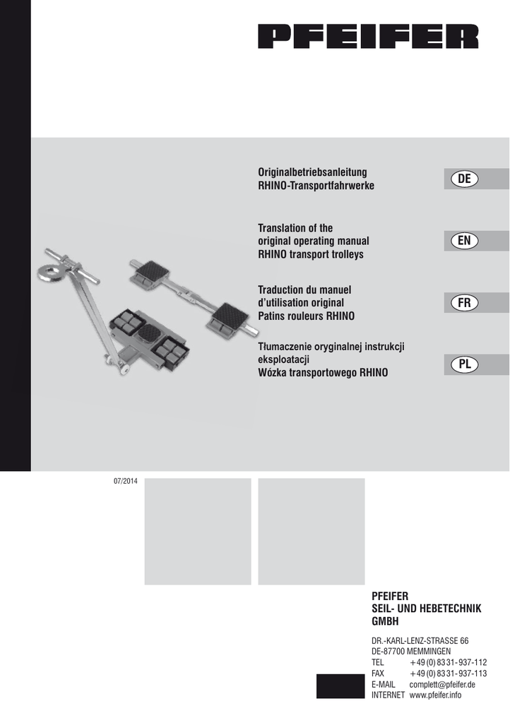 Originalbetriebsanleitung RHINO-Transportfahrwerke DE Translation of the original operating manual RHINO transport trolleys EN Traduction du manuel d’utilisation original Patins rouleurs RHINO FR Tłumaczenie oryginalnej instrukcji eksploatacji Wózka transportowego RHINO PL 07/2014 PFEIFER SEIL- und HEBETECHNIK GmbH DR.-KARL-LENZ-STRASSE 66 DE-87700 MEMMINGEN TEL +49 (0) 83 31- 937-112 FAX +49 (0) 83 31- 937-113 [email protected] INTERNETwww.pfeifer.info DE Sehr geehrter Kunde, vor der ersten Benutzung Ihres neuen Transportlenkwerks bzw. Transportfahrwerks lesen Sie bitte die Bedienungsanleitung sorgfältig durch! Sicherheitshinweise Vor Anwenden der Transportlenkwerke und der Transportfahrwerke ist das Gewicht des Hebegutes sowie die Bodenverhältnisse zu prüfen. •Vor dem Benutzen der Transportgeräte auf Mängel prüfen (Sichtprüfung) •Wir empfehlen die Transportgeräte nur auf ebenen Böden zu benutzen •Die Transportgeräte müssen bei unebenen Böden fest mit dem Hebegut verbunden sein •Transportlenkwerke und Transportfahrwerke dürfen nicht überlastet werden, beachten Sie die max. Traglast auf dem jeweiligen Typenschild •Unsere Transportgeräte haben keine Bremsvorrichtung •Die Rollgeschwindigkeit von 2 km/h darf nicht überschritten werden •Steigungen oder Gefälle nicht befahren •Nicht unter die schwebende Last greifen! •Der Gesamtschwerpunkt der zu befördernden Last ist zu beachten, die Transportfahrwerke müssen dementsprechend positioniert werden. •Die Transportfahrwerke sind auf der Tragfläche mit 8 mm Gummi belegt. Die Gummiauflage muss trocken und frei von Öl und Fett sein. Haftungs- und Gewährleistungsansprüche bei Sach- und Personenschäden sind ausgeschlossen, wenn sie auf eine oder mehrere der folgenden Punkte zurückzuführen sind: Reparaturanleitung Austauschen Axialkugellager: 1. Transportlenkwerk auf den Drehteller legen 2. Sicherungsring am Bolzen des Drehtellers entfernen 3. Transportlenkwerk vom Drehteller heben 4. Axialkugellager austauschen (Lager fetten) 5. Transportlenkwerk auf den Drehteller aufsetzen 6. Sicherungsring auf den Bolzen montieren Gummiauflage erneuern: 1. Gummiauflage und Klebstoffreste entfernen (Achtung: Kontaktflächen müssen fettfrei sein!) 2. Folie von der neuen Gummiauflage abziehen 3. Gummiauflage und Auflagefläche mit Verdünnung abreiben 4. Kontaktkleber auf beiden Flächen auftragen 5. Kurze Zeit antrocknen lassen 6. Gummiauflage auf die Auflagefläche auflegen und fest andrücken Rollenwechsel: 1. Transportlenkwerk oder Transportfahrwerk auf den Rücken legen 2. Sicherungsring an der Achse entfernen 3. defekte Rollen abziehen 4. neue Rollen aufstecken 5. Sicherungsring auf die Achse montieren •Nichtbeachten der Bedienungsanleitung •Unsachgemäßer Einsatz der Transport- und Lenkfahrwerke •Mangelhafte Überwachung von Verschleißteilen •Reparaturen sind unsachgemäß durchgeführt •Bauliche Veränderungen durch Dritte W W W W 2 RHINO-Transportfahrwerke 7/2015 / Änderungen vorbehalten! e Kontakt e .. . e s k c it siehe Rü EN Dear customer, Please read the operating manual carefully before using your new steering trolleys and/or transport trolleys for the first time! Safety instructions The weight of the item to be lifted and the floor conditions must be checked before the use of the steering and transport trolleys. •Check the transport devices for defects before use (visual inspection) •We recommend that you use the transport devices only on level floors •The transport devices must be firmly connected to the item being lifted if the floors are uneven •Steering and transport trolleys must not be overloaded; observe the max. load on the respective type plate •Our transport devices have no brakes •The rolling speed of 2 km/h may not be exceeded •Do not drive on upward or downward gradients •Do not reach underneath the suspended load! Liability and warranty claims for damage to property and personal injury are excluded if they are attributable to one or more of the following points: •Disregarding the operating manual •Improper use of the transport and steering trolleys •Inadequate monitoring of wearing parts •Improper repairs •Structural modifications by third parties Repair manual Exchanging the thrust ball bearing: 1. Lay the steering trolley down on its turntable 2. Remove the circlip from the bolt of the turntable 3. Lift the steering trolley off the turntable 4. Exchange the thrust ball bearing (grease the bearing) 5. Place the steering trolley on its turntable 6. Mount the circlip on the bolt Replacing the rubber support: 1. Remove the rubber support and glue residues (note: contact areas must be free of grease!) 2. Peel the film off the new rubber support 3. Rub the rubber support and the support surface with thinner 4. Apply contact adhesive to both surfaces 5. Allow to dry for a short while 6. Position the rubber support on the support surface and press on firmly Exchanging rollers: 1. Lay the steering trolley or transport trolley upside down 2. Remove the circlip from the axle 3. Pull off the defective rollers 4. Push on the new rollers 5. Mount the circlip on the axle W W W leaf See over c a ts .. . for cont W RHINO transport trolleys 7/2015 / Subject to technical changes! 3 FR Cher client, Avant d’utiliser pour la première fois votre nouveau patin rouleur et patin rouleur pivotant, veuillez lire attentivement le manuel d’utilisation ! Consignes de sécurité Avant d’utiliser les patins rouleurs et les patins rouleurs pivotants, il est important de vérifier le poids des éléments à déplacer ainsi que la qualité du sol. •Vérifier, avant toute utilisation, qu’il n’y a aucun défaut sur les patins de transport (contrôle visuel) •Nous vous recommandons de faire rouler les patins de transport sur des sols plats •Si le déplacement se fait sur des sols irréguliers, il faut que l’élément à déplacer soit fermement fixé sur les patins de