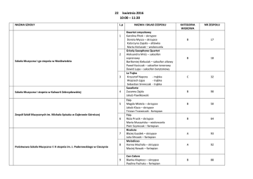 22 NAZWA SZKOŁY kwietnia 2016 10:00 – 11:30 L.p 1 2 Szkoła Muzyczna I-go stopnia w Niedźwiedziu 3 Szkoła Muzyczna I stopnia w Kalwarii Zebrzydowskiej 4 5 Zespół Szkół Muzycznych im. Michała Spisaka w Dąbrowie Górniczej 6 7 Państwowa Szkoła Muzyczna I i II stopnia im. J. Paderewskiego w Cieszynie 8 9 NAZWA I SKŁAD ZESPOŁU Kwartet smyczkowy Karolina Pitek – skrzypce Dorota Mysza – skrzypce Katarzyna Zapała – altówka Marta Kielusiak – wiolonczela Grizzly Saxophone Quartet Aleksandra Mróz – saksofon sopranowy Bartłomiej Kielusiak – saksofon altowy Paweł Kaciczak – saksofon tenorowy Dawid Lupa – saksofon barytonowy La Trąba Krzysztof Napora - trąbka Wojciech Ligas - trąbka Sebastian Smreczak - trąbka Saxoforte Zuzanna Zajda Jakub Pawlikowski Trio Magda Mistela – skrzypce Jakub Kluza – skrzypce Tristan Trzewiczek - fortepian Trio Róża Prusik – skrzypce Maria Muszyńska – wiolonczela Piotr Szymczak – fortepian Risoluto Błażej Guzdek – skrzypce Julia Mrozek – fortepian Melodioso Hanna Machała – skrzypce Maciej Nowak – fortepian Con Colore Blanka Kłaptocz – skrzypce Paulina Pachuta – fortepian KATEGORIA WIEKOWA NR ZESPOŁU B 17 B 18 C 32 B 90 B 50 B 64 A 93 A 92 B 88 Państwowa Szkoła Muzyczna I i II st. im. I.J Paderewskiego w Piotrkowie Trybunalskim 10 Ogólnokształcąca Szkoła Muzyczna I i II st. im. H. Wieniawskiego w Łodzi 11 Państwowa Szkoła Muzyczna № 2 I st. w Grodnie (Białoruś) 12 Duet gitarowy Oskar Strukiel – Piotrowski Damian Kuśmierczyk Trio fortepianowe Anna Toporkiewicz – skrzypce Miłosz Mirowski – wiolonczela Mateusz Muchewicz - fortepian Smyk Cyd Iryna Aleksandrovich Veranika Balukhtsina Marharyta Hauk Palina Hrybava Raman Ivanou Kseniya Ivanova Anastasiya Simanava D 66 D 58 B 4 B 22 A 27 11:35 – 13:30 13 Centre for Young Musician – London 14 Amanita Musicaria Ensemble – London CYM String Quartet Leon Oliver Human - skrzypce Kamile Gowan - skrzypce Emmeline Rose McDonald - altówka Susannah Francesca Roman – wiolonczela KWARTET Mina Hobson Mazur - skrzypce Lucien Engelmann - skrzypce Jamie Jones - altowka Sacha Neugarten - fagot Kwartet Wiolonczelowy – Picasso Zespół Szkół Muzycznych im. Oskara Kolberga w Radomiu 15 B 15 B 55 D 44 B 57 D 12 D 45 D 78 C 82 Amelia Chmielewska Katarzyna Kacprzak Marika Tkaczyk Zofia Malinowska 16 Zespół Państwowych Szkół Muzycznych nr 4 im. Karola Szymanowskiego w Warszawie Państwowa Szkoła Muzyczna I i II st. w Zielonej Górze 17 18 19 Państwowa Ogólnokształcąca Szkoła Muzyczna II st. Im. K. Szymanowskiego w Katowicach 20 21 22 Trio fortepianowe Justyna Żołnacz – fortepian Wiktoria Osińska – wiolonczela Jeremi Tabęcki - klarnet Trio Marianna Żołnacz – flet Maurycy Hartman – klarnet Magdalena Jaroszewicz – fortepian Violin Guys Trio Mikołaj Górny – skrzypce Witold Kamiński – skrzypce Mikołaj Woźniak – fortepian Kwartet saksofonowy POSM II ST. w Katowicach Łukasz Dyczko – saksofon sopranowy Mateusz Warzecha – saksofon altowy Paweł Paw – saksofon tenorowy Wojciech Chałupka – saksofon barytonowy Trio Ewa Bukała - fortepian Łukasz Dyczko – saksofon sopranowy Wojciech Chałupka – saksofon barytonowy Duet Przemysław Czałupka Wojciech Czałupka (akordeon, saksofon) Duet Alina Spyrka - flet Olga Ucieklak - harfa 13:30 – 15:00 PRZERWA 15:00 – 17:00 Państwowa Szkoła Muzyczna I i II stopnia im. F. Chopina w Olsztynie 23 24 Powiatowa Szkoła Muzyczna I st. w Dywitach 25 Duet Barbara Pliszka – skrzypce Zuzanna Konstantynowicz – wiolonczela Duet skrzypcowy Zofia Hiszpańska Marcelina Rucińska Kwartet Krasnonutki Marcelina Rucińska – skrzypce Zofia Hiszpańska – skrzypce Zuzanna Krotoszyńska – akordeon Amelia Bryl - wiolonczela B 84 A 75 A 23 B 52 C 59 C 61 B 89 Trio fortepianowe PSM Dywity 26 Zuzanna Zielińska – skrzypce Alan Dżbik – flet Filip Borowik – fortepian Ogólnokształcąca Szkoła Muzyczna I i II st. im. Karola Szymanowskiego w Wrocławiu Zespół Szkół Muzycznych - Szkoła Muzyczna II st. Im. Fryderyka Chopina w Gdańsku –Wrzeszczu 27 28 Państwowa Szkoła Muzyczna I stopnia w Kętrzynie 29 Trio fortepianowe Agnieszka Hnat – wiolonczela Aleksandra Lenkiewicz – skrzypce Karolina Marciniak – fortepian Trio fortepianowe Malwina Pakuła- fortepian Szczepan Buśko – skrzypce Stanislas Roesler – wiolonczela Duetto Aleksandra Pietrzyk – skrzypce Jakub Zawistowski – fortepian Społeczna Szkoła Muzyczna II st. TPZ w Zgierzu 30 Trio Karolina Michalak - flet Natalia Budzyńska - flet Karolina Zielińska - fortepian D 42