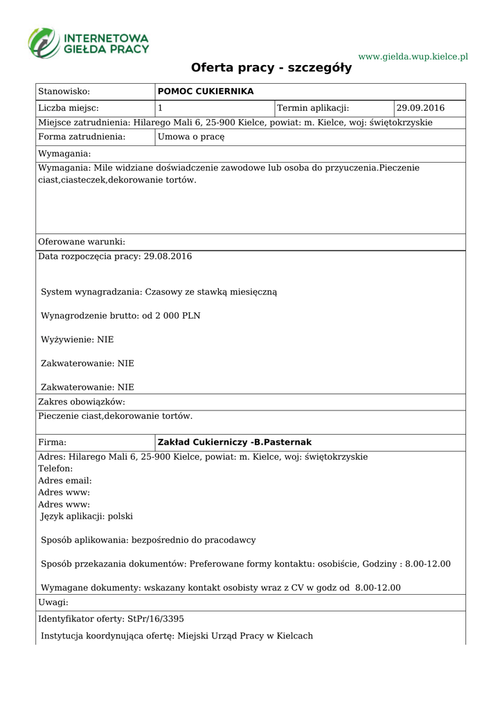 Oferta pracy - szczegóły Stanowisko: POMOC CUKIERNIKA Liczba miejsc: 1 www.gielda.wup.kielce.pl Termin aplikacji: 29.09.2016 Miejsce zatrudnienia: Hilarego Mali 6, 25-900 Kielce, powiat: m. Kielce, woj: świętokrzyskie Forma zatrudnienia: Umowa o pracę Wymagania: Wymagania: Mile widziane doświadczenie zawodowe lub osoba do przyuczenia.Pieczenie ciast,ciasteczek,dekorowanie tortów. Oferowane warunki: Data rozpoczęcia pracy: 29.08.2016 System wynagradzania: Czasowy ze stawką miesięczną Wynagrodzenie brutto: od 2 000 PLN Wyżywienie: NIE Zakwaterowanie: NIE Zakwaterowanie: NIE Zakres obowiązków: Pieczenie ciast,dekorowanie tortów. Firma: Zakład Cukierniczy -B.Pasternak Adres: Hilarego Mali 6, 25-900 Kielce, powiat: m. Kielce, woj: świętokrzyskie Telefon: Adres email: Adres www: Adres www: Język aplikacji: polski Sposób aplikowania: bezpośrednio do pracodawcy Sposób przekazania dokumentów: Preferowane formy kontaktu: osobiście, Godziny : 8.00-12.00 Wymagane dokumenty: wskazany kontakt osobisty wraz z CV w godz od 8.00-12.00 Uwagi: Identyfikator oferty: StPr/16/3395 Instytucja koordynująca ofertę: Miejski Urząd Pracy w Kielcach Urząd Pracy dokłada wszelkich starań, aby oferty pracy będące w zasobach urzędu, były rzetelne i wiarygodne. Ponieważ wszystkie oferty pracy pochodzą od osób trzecich Urząd Pracy zastrzega, że odpowiedzialność za ewentualne rozbieżności pomiędzy warunkami pracy zaprezentowanymi w niniejszej ofercie a warunkami zaproponowanymi przez potencjalnego pracodawcę ponosi pracodawca.