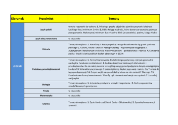 Kierunek Przedmiot Język polski Język obcy nowożytny Tematy tematy rozprawki do wyboru: 1. Mitologia grecka objaśniała zjawiska przyrody i złożność ludzkiego losu (minimum 2 mity) 2. Biblia księgą mądrości, która dostarcza wzorców godnego postępowania. Wykorzystaj minimum 3 przykłady z Biblii (przypowieści, psalmy, księga Hioba) w załączniku Historia Tematy do wyboru: 1. Narodziny II Rzeczpospolitej - etapy kształtowania się granic państwa polskiego 2. Kultura, nauka i sztuka II Rzeczpospolitej - najważniejsze osiągnięcia 3. Autorytaryzm i totalitaryzm w okresie międzywojennym - podobieństwa i różnice. 4. Kampania polska - blaski i cienie polskich działań obronnych w 1939r. Podstawy przedsiębiorczości Tematy do wyboru: 1. Formy finansowania działalności gospodarczej, czyli jak zgromadzić niezbędne fundusze na działalność. 2. Rodzaje kredytów bankowych dla ludności i przedsiębiorstw. Na co należy zwrócić szczególną uwagę przed podjęciem decyzji o zaciągnięciu kredytu? 3. Scharakteryzuj znanego Ci przedsiębiorcę. Wykaż jego wady i zalety. Czy Ty masz do tego predyspozycje? 4. Z czym wejść na rynek lokalny lub co na nim zmienić? Dlaczego ? 5. Pozabankowe formy inwestowania. W co Ty byś zainwestował swoje oszczędności? Uzasadnij swój wybór. LO SEM I Biologia Tematy do wyboru: 1. Inżynieria genetyczna korzyści i zagrożenia. 2. Cechy organizmów zmodyfikowanych genetyczne. Fizyka w załączniku Matematyka w załączniku Chemia Tematy do wyboru: 1. Życie i twórczość Marii Curie – Skłodowskiej. 2. Sposoby konserwacji żywności. LO SEM III Język polski Tematy do wyboru: 1. Bohater romantyczny – zwycięzca czy moralny przegrany ? 2. Jacek Soplica – zdrajca czy bohater narodowy? 3. „Lalka” B. Prusa jest powieścią o miłości i jej klęsce. Czy zgadzasz się z tym stwierdzeniem? Język obcy nowożytny Tematy do wyboru: 1. Write a short greeting card from your holiday to your friend (napisz kartkę z wakacji do przyjaciela) 2. Describe one member of your family or a famous person (opisz członka rodziny lub znaną osobę). 3. Ćwiczenia sprawdzające słownictwo na temat życia rodzinnego, posiadania narodowości, krajów, upodobań. Wiedza o społeczeństwie Tematy do wyboru: 1. Scharakteryzuj sytuację młodych ludzi w Polsce i określ w których obszarach życia społecznego występuje dla nich najwięcej niedogodności. 2. Przedstaw i scharakteryzuj najważniejsze Twoim zdaniem przyczyny kryzysu współczesnej polskiej rodziny. Opisz społeczne skutki tego zjawiska. Geografia Matematyka Historia i społeczeństwo 1. Zmiany atmosfery i klimatu na skutek antropogenicznej działalności człowieka. w załączniku Tematy do wyboru: 1. „Słodko i zaszczytnie jest umierać za ojczyznę”. Wymienić polskich bohaterów narodowych, którzy według Ciebie kierowali się sentencją Horacego. 2. Opisz rozwój kultury na ziemiach polskich w średniowieczu. 3. Konstytucja 3 maja ratunek czy przyczyna upadku? 4. Przyczyny upadku Rzeczpospolitej w XVIII w. Język polski Tematy do wyboru: 1. Tomasz Judym – bohater wygrany czy przegrany? 2. Uzasadnij, że „Wesele” S. Wyspiańskiego to dramat narodowy. 3. Uzasadnij, że „Przedwiośnie” S. Żeromskiego jest powieścią polityczną i społeczną. Język obcy nowożytny Tematy do wyboru: 1. Describe the place where you live or would like to live, give your opinion (opisz miejsce w którym chciałbyś mieszkać i uzasadnij dlaczego) 2. Read about famous person and write a short note about his/her life (przeczytaj informację na temat znanej osoby, a następnie napisz krótką notatkę na temat życia tej osoby ) Wiedza o społeczeństwie Tematy do wyboru: 1. Scharakteryzuj współczesne patologie życia publicznego (korupcja, demagogia, populizm, nepotyzm, klientyzm). Która z nich wg Ciebie, stanowi obecnie największy problem w naszym kraju. Uzasadnij swój wybór. 2. Scharakteryzuj organy kontroli państwowej ochrony prawa i zaufania publicznego (NIK, Urząd Rzecznika Praw Obywatelskich, KRRITV, IPN, Urząd Ochrony konkurencji i Konsumentów). 3. Opisz strukturę władzy sądowniczej w Polsce. Wymień zadania sądów powszechnych, wojskowych i administracyjnych oraz Trybunałów Stanu Konstytucyjnego. LO SEM IV Geografia Matematyka Język polski Język obcy nowożytny LO SEM V Wiedza o społeczeństwie Geografia Matematyka Oddziaływanie poztywne i negatywne człowieka na litosferę i hydrosferę. w załączniku Tematy do wyboru: 1. Czy w miłości lepiej słuchać głosu rozsądku czy też oddać się namiętności. Sformułuj tezę i napisz rozprawkę odwołując się do minimum 2 utworów literackich. 2. Uzasadnij tezę, że literatura współczesna (od 1945r.) oskarża totalitaryzm XX w. i protestuje przeciw wojnie. Wybierz minimum 2 utwory. Tematy do wyboru: 1. Write an e-mail, apologize a friend. (napisze-mail w którym przeprosisz przyjaciela) 2. Tell about your best holidays you had (wypowiedz się na temat najlepszych wakacji w życiu ). Tematy do wyboru: 1. Wyjaśnij jak rozumiesz stwierdzenie Herberta Marshalla Mcluhan, że świat jest „globalną wioską”. Opisz wpływ rozwoju mediów na nasze postrzeganie rzeczywistości . 2. Scharakteryzuj ewolucję polskiej polityki zagranicznej po 1989r., jej główne etapy i najważniejsze wydarzenia z nimi związane. Tematy do wyboru: 1. Wpływ usług na życie i działalność człowieka. 2. Wpływ działalności gospodarczej człowieka na sfery Ziemi. w załączniku Język polski Język obcy nowożytny LO SEM VI Geografia Matematyka Rozprawka na dowolny, wybrany temat Tematy do wyboru: 1. Write an e-mail, apologize a friend. (napisze-mail w którym przeprosisz przyjaciela) 2. Tell about your future plans ( wypowiedź na temat planów na przyszłość z wykorzystaniem różnych struktur gramatycznych). Ochrona przyrody w Polsce w załączniku