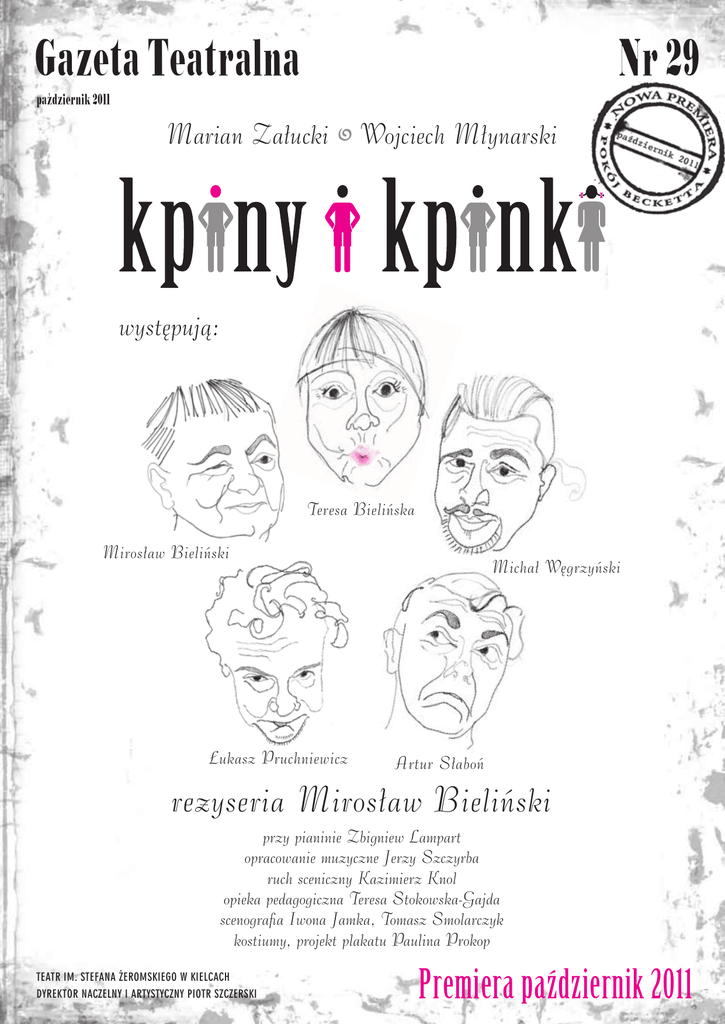 Gazeta Teatralna Nr 29 październik 2011 Marian Załucki A Wojciech Młynarski występują: Teresa Bielińska Mirosław Bieliński Łukasz Pruchniewicz Michał Węgrzyński Artur Słaboń reżyseria Mirosław Bieliński przy pianinie Zbigniew Lampart opracowanie muzyczne Jerzy Szczyrba ruch sceniczny Kazimierz Knol opieka pedagogiczna Teresa Stokowska-Gajda scenografia Iwona Jamka, Tomasz Smolarczyk kostiumy, projekt plakatu Paulina Prokop TEATR IM. STEFANA ŻEROMSKIEGO W KIELCACH DYREKTOR NACZELNY I ARTYSTYCZNY PIOTR SZCZERSKI Premiera pazdziernik 2011 T E AT R I M . S T E FA N A Ż E RO M S K I E G O W K I E LC AC H Młynarskiemu wielkiej krzywdy, mam nadzieję, nie robię z Mirosławem Bielińskim o „Kpinach i kpinkach” (prawie całkiem poważnie) – Dwie kwestie mnie nurtują: pierwsza to Twój reżyserski debiut, druga dotyczy tekstów Wojciecha Młynarskiego – nie boisz się zmierzyć z legendą twórcy? – Młynarskiemu wielkiej krzywdy, mam nadzieję, nie robię. Jestem niemal fanatykiem jego twórczości „od zawsze”, bo to są zwyczajnie mądre, inteligentne i dowcipne teksty. I tak się składa, że w każdej rzeczywistości są bardzo na miejscu. Więc należy słuchać ich uważnie, jak najczęściej przypominać, a ich przesłanie najlepiej mieć w rozumie, na co dzień. Bo to taki czynnik, który stabilizuje życie emocjonalne jednostki – czyli słuchajmy Młynarskiego, żeby nie zwariować. Wywód powyższy częściowo uzasadnia moje działania w nurtującej cię kwestii dotyczącej Młynarskiego; część dalsza uzasadnienia związana jest z moim prywatnym protestem przeciwko obniżającym się lotom kabareciarzy. Tym spektaklem chcę przypomnieć, że teksty kabaretowe to jednak nie bełkot i wuwuzele. Czy konfrontacja z legendą twórcy jest trudna… Są tacy, którzy mierzą się z Szekspirem… – Szekspir co najwyżej w grobie się przekręca… – … a ja mogę ewentualnie usłyszeć od autora, że coś spieprzyłem. Przyjmę z pokorą, albo będę dyskutował. To wszystko. Pomysł na spektakl z prezentacją twórczości Mariana Załuckiego prześladował mnie już wiele lat, właściwie od czasu, kiedy postanowiłem, że zostanę aktorem: pracowałem z ś.p. Kazimierzem Jasiewiczem, świetnym aktorem, właśnie na tekstach Załuckiego, więc spektakl ten jest jakby moją sentymentalną podróżą i hołdem dla Mistrza, bo tak się ułożyło, że od 27 lat pracuję na scenie. A Załucki i Młynarski świetnie się uzupełniają. – Kielczanom znany jesteś z wielu doskonałych kreacji aktorskich… A tu tymczasem, proszę, debiut reżyserski… – Nie taki całkiem debiut. Na początku mojej scenicznej drogi współreżyserowałem „Tygrysa Pietrka” Hanny Januszewskiej; to spektakl dla dzieci. Od wielu lat prowadzę warsztaty z młodzieżą i na finał przygotowujemy jakieś widowisko. I wtedy natrętna myśl chodzi mi po głowie: gdybym miał do dyspozycji prawdziwych (w sensie zawodowych) aktorów, to ja bym pokazał… W pracy przy tym spektaklu inna myśl się wykluła: żebym ja z obcymi pracował, a nie z kolegami… Z przeproszeniem kolegów, oczywista… I dużym przymrużeniem oka wobec siebie. A poważnie: stawiam na mądrość tekstów Załuckiego i Młynarskiego, ich ponadczasowy charakter, celne pointy. Mam nadzieję, że publiczność będzie tym wyborem usatysfakcjonowana. Dziękuję za rozmowę. Justyna Żukowska Marian Załucki Fragment pięknego życiorysu …A gdy miał już willę, samochód i futro, To uświadomił sobie w pewnej chwili: - A więc to już Dzisiaj jest to Lepsze Jutro, o któreśmy wczoraj walczyli!... Stanisław Jerzy Lec MY ŚL I NI EU CZ ES AN E nia przemyka Na bocznych dróżkach myśle ny sens. obok ciebie czasem przerażo 2 Gazeta Teatralna nr 29, październik 2011 MARIAN ZAŁUCKI I WOJCIECH MŁYNARSKI - KPINY I KPINKI - REŻYSERIA MIROSŁAW BIELIŃSKI h c a c r ó O tw n Maria i k Załuc ch Wojcie ski r Młyna – poeta, reżyser, wykonawca piosenki autorskiej, satyryk, artysta kabaretowy, autor tekstów piosenek i librett, tłumacz. Urodził się 26 marca 1941 roku w Warszawie, debiutował na początku lat 60. ubiegłego stulecia w kabarecie i teatrze w „Hybrydach”, popularnym klubie studenckim. Jest absolwentem polonistyki. Od połowy lat 60. współpracował z kabaretami. „Dudek”, „Owca” i „Dreszczowiec”, wtedy powstały m.in. utwory: W Polskę idziemy, Ludzie to kupią, W co się bawić. Był również związany z telewizyjna redakcją rozrywki, gdzie stworzył cykl „Porady sercowe”, z którego pochodzą m.in. Polska miłość czy Niedziela na Głównym. Jest autorem także większych form literackich – librett do oper i musicali, m.in.: Henryk IV na łowach, Cień, Awantura w Recco. Przetłumaczył na język polski teksty piosenek z musicali: Kabaret, Jesus Christ Superstar, Chicago. Na scenie warszawskiego Teatru Ateneum realizował programy autorskie poświęcone wybitnym artystom i twórcom, m.in.: J. Brelowi, Marianowi Hemarowi, Hance Ordonównie, Włodzimierzowi Wysockiemu. Wojciech Młynarski uznany jest za twórcę nowej formy artystycznej, tzw. felietonów śpiewanych. – poeta, satyryk, pisarz. Urodził się 5 maja 1920 w Kołomyi, zmarł 13 kwietnia 1979 w Warszawie. Swoje dzieciństwo spędził w Lwowie, po wojnie mieszkał w Krakowie. Tu, w Teatrze Satyryków, prezentował swoje wiersze. W latach 1956-67 występował w kabarecie Wagabunda, a od 1962 w teatrach warszawskich Buffo, Syrena oraz kabaretach „U Lopka”, „Dudek” i w popularnych programach radiowych: Podwieczorek przy mikrofonie, Poznajmy się, Zgaduj zgadula. Współpracował z „Przekrojem”, „Życiem Literackim”, satyrycznym pismem „Szpilki”. Pisał dla dorosłych i dla dzieci. Wydał m.in.: • Przejażdżki wierszem (1954) • Uszczypnij muzo (1955) • Oj-czyste kpiny (1959) • A nie mówiłem? (1961) • Niespokojna czaszka (1965) • Czy pani lubi Załuckiego (1967) • Komu 
