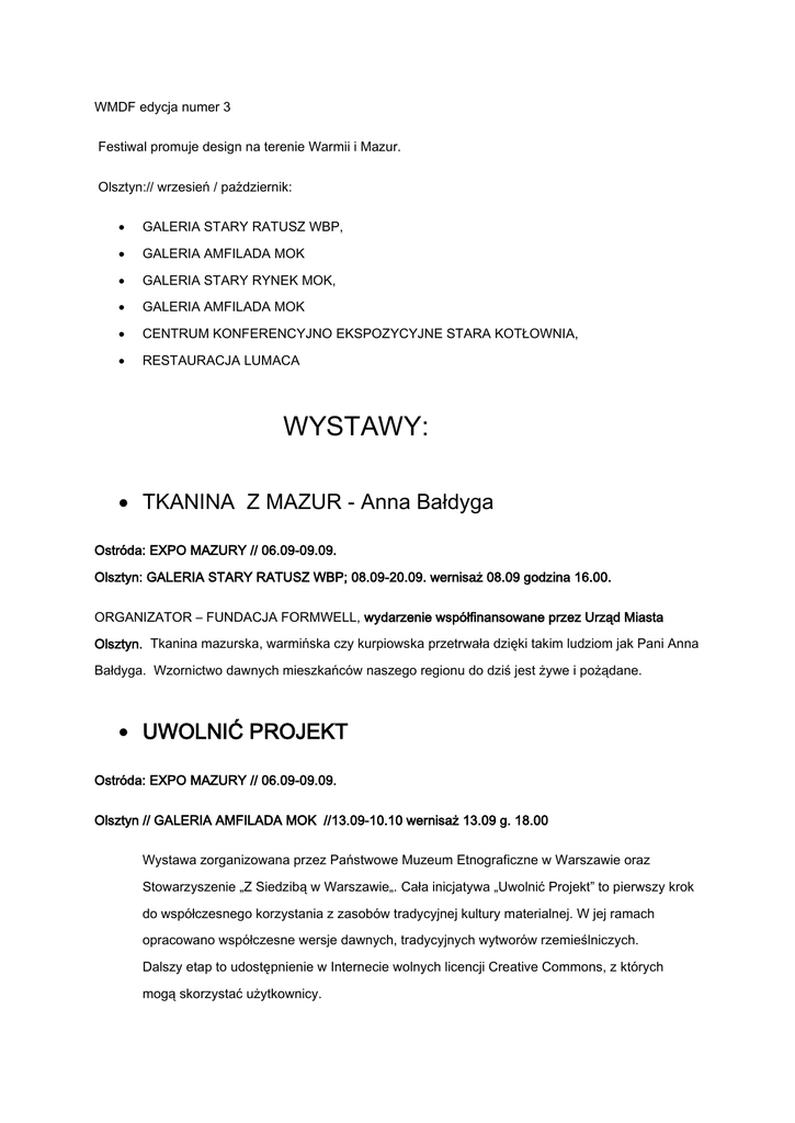 WMDF edycja numer 3 Festiwal promuje design na terenie Warmii i Mazur. Olsztyn:// wrzesień / październik: GALERIA STARY RATUSZ WBP, GALERIA AMFILADA MOK GALERIA STARY RYNEK MOK, GALERIA AMFILADA MOK CENTRUM KONFERENCYJNO EKSPOZYCYJNE STARA KOTŁOWNIA, RESTAURACJA LUMACA WYSTAWY: TKANINA Z MAZUR - Anna Bałdyga Ostróda: EXPO MAZURY // 06.09-09.09. Olsztyn: GALERIA STARY RATUSZ WBP; 08.09-20.09. wernisaż 08.09 godzina 16.00. ORGANIZATOR – FUNDACJA FORMWELL, wydarzenie współfinansowane przez Urząd Miasta Olsztyn. Tkanina mazurska, warmińska czy kurpiowska przetrwała dzięki takim ludziom jak Pani Anna Bałdyga. Wzornictwo dawnych mieszkańców naszego regionu do dziś jest żywe i pożądane. UWOLNIĆ PROJEKT Ostróda: EXPO MAZURY // 06.09-09.09. Olsztyn // GALERIA AMFILADA MOK //13.09-10.10 wernisaż 13.09 g. 18.00 Wystawa zorganizowana przez Państwowe Muzeum Etnograficzne w Warszawie oraz Stowarzyszenie „Z Siedzibą w Warszawie„. Cała inicjatywa „Uwolnić Projekt” to pierwszy krok do współczesnego korzystania z zasobów tradycyjnej kultury materialnej. W jej ramach opracowano współczesne wersje dawnych, tradycyjnych wytworów rzemieślniczych. Dalszy etap to udostępnienie w Internecie wolnych licencji Creative Commons, z których mogą skorzystać użytkownicy. DIZAJN U ŹRÓDEŁ Ostróda: EXPO MAZURY // 06.09-09.09. Olsztyn: GALERIA AMFILADA MOK //13.09-10.10 wernisaż 13.09 g. 18.00 Ekspozycja jest wstępem do rozmowy o wartościach, jakie daje tradycyjne rzemiosło w szczególności dla współczesnego projektanta. Punktem wyjścia do powstania wystawy stały się spotkania na styku tradycji i dizajnu z udziałem rzemieślników i projektantów zainicjowane przez Zamek Cieszyn. Projektanci, „wędrując do źródeł”, odkrywali tradycyjne techniki i naturalne materiały, by opowiedzieć o nich na nowo, językiem współczesnych odbiorców. DIZAJN Z WARMII – JACEK WOJCIECH SUSZEK Ostróda: EXPO MAZURY // 06.09-09.09. Olsztyn: GALERIA STARY RYNEK MOK; 13.09.-10.10 WERNISAŻ 13.09 godz. 17.00 ORGANIZATOR – FUNDACJA FORMWELL, wydarzenie współfinansowane przez Urząd Miasta Olsztyn. Naturalne meble inspirowane dawnymi i dzisiejszymi potrzebami człowieka, posiadają proste, oczywiste funkcje i charakteryzują się oryginalną formą wynikającą z współczesnej architektury Warmii. Potrzeby ludzi nie zmieniają się. Doszliśmy do takiego momentu w rozwoju cywilizacyjnym, że chcemy dziś żyć podobnie jak 100, 500 lat temu : blisko natury, otaczać się rzeczami ekologicznymi, chcemy odżywiać się zdrowo, a odpoczywać najchętniej na łonie natury. Nowoczesna forma przedmiotów odzwierciedla istotę potrzeb dawnych i dzisiejszych Warmiaków. OBSERWATORIUM Ostróda: EXPO MAZURY // 06.09-09.09. Olsztyn // CENTRUM KONFERENCYJNO EKSPOZYCYJNE STARA KOTŁOWNIA; 14.09 -30.09, wernisaż 30.09 g. 17.00 OBSERWATORIUM to wystawa, na której przedstawione są efekty warsztatów dla studentów kierunków projektowych z Ukrainy. Zadaniem uczestników pod okiem wybitnych projektantów ze studia MALAFOR było stworzenie obiektów użytkowych dedykowanych miejscu, w którym odbywały się warsztaty – z dala od miasta, blisko natury, na granicy dwóch krain Kociewia i Kaszub. Podczas warsztatów zainicjowanych przez Culture.pl a poprowadzonych przez Malafor powstały obiekty, które w sposób dosłowny odpowiadały na temat „Obserwatorium”, zainspirowane są naturą. ASP KRAKÓW - dwie wystawy Ostróda: EXPO MAZURY // 06.09-09.09. Olsztyn // CENTRUM KONFERENCYJNO EKSPOZYCYJNE STARA KOTŁOWNIA; 14.09 - 30.09, wernisaż 30.09 g. 17.00 1/ DYPLOMY WYBRANYCH REALIZACJI Z TRZECH PRACOWNI PROJEKTOWYCH KATEDRY PROJEKTOWANIA MEBLI I ELEMENTÓW WYPOSAŻENIA WNĘTRZ WAW ASP KRAKÓW 2/ IV BIENNALE ARCHITEKTURY WNĘTRZ INAW 2016 - WYSTAWA PREZENTUJĄCA PRACE KONKURSOWE Międzynarodowe Biennale Architektury Wnętrz INAW 2016 to impreza cykliczna organizowana przez Akademię Sztuk Pięknych im. Jana Matejki w Krakowie, pod patronatem Ministerstwa Nauki i Szkolnictwa Wyższego oraz Rektora ASP w Krakowie. Do udziału zaproszeni są projektanci, pedagodzy i studenci wyższych uczelni artystycznych i projektowych w kraju i za granicą. LICEUM PLASTYCZNE W OLSZTYNIE Ostróda: EXPO MAZURY // 06.09-09.09. Olsztyn // CENTRUM KONFERENCYJNO EKSPOZYCYJNE STARA KOTŁOWNIA; 14.09 -30.09, wernisaż 30.09 g. 17.00 MEBEL MARZEŃ – WYSTAWA POKONKURSOWA Ostróda: EXPO MAZURY // 06.09-09.09. CENTRUM KONFERENCYJNO EKSPOZYCYJNE STARA KOTŁOWNIA 14.09 - 30.09. wernisaż 30.09 g. 17.00 KONKURS I WYSTAWA POKONKURSOWA ZORGANIZOWANA PRZEZ WYDAWNICTWO BIZNES MEBLE.PL WYSTAWY INDYWIDUALNE: Ostróda: EXPO MAZURY // 06.09-09.09. CENTRUM KONFERENCYJNO EKSPOZYCYJNE STARA KOTŁOWNIA 14.09 -30.09, wernisaż 30.09 g. 17.00 WARMIŃSKA ZABAWKA PLAŻOWA KONKURS I WYSTAWA POKONKURSOWA WYPRODUKOWANYCH PROJEKTOW ZABAWEK ORGANIZATOR – FUNDACJA FORMWELL, wydarzenie współfinansowane przez Urząd Miasta Olsztyn. Olsztyn: RESTAURACJA LUMACA NAD JEZIOREM UKIEL, 12.10 wernisaż 12.10, g. 18