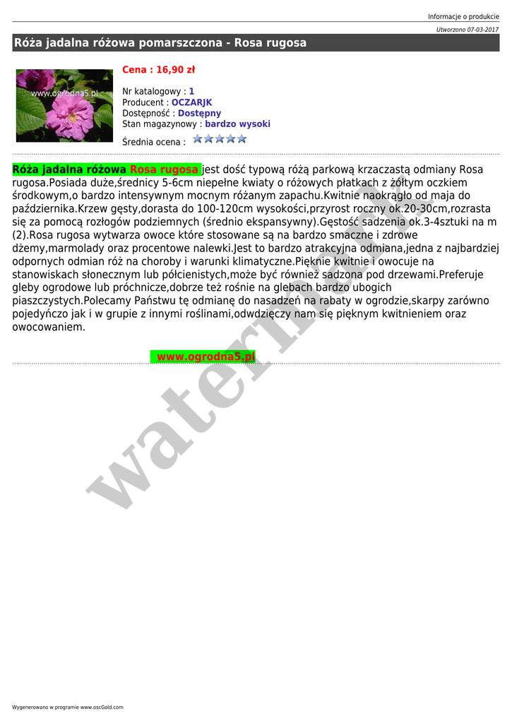 Informacje o produkcie Utworzono 07-03-2017 Róża jadalna różowa pomarszczona - Rosa rugosa Cena : 16,90 zł Nr katalogowy : 1 Producent : OCZARJK Dostępność : Dostępny Stan magazynowy : bardzo wysoki Średnia ocena : er m ar k Róża jadalna różowa Rosa rugosa jest dość typową różą parkową krzaczastą odmiany Rosa rugosa.Posiada duże,średnicy 5-6cm niepełne kwiaty o różowych płatkach z żółtym oczkiem środkowym,o bardzo intensywnym mocnym różanym zapachu.Kwitnie naokrągło od maja do października.Krzew gęsty,dorasta do 100-120cm wysokości,przyrost roczny ok.20-30cm,rozrasta się za pomocą rozłogów podziemnych (średnio ekspansywny).Gęstość sadzenia ok.3-4sztuki na m (2).Rosa rugosa wytwarza owoce które stosowane są na bardzo smaczne i zdrowe dżemy,marmolady oraz procentowe nalewki.Jest to bardzo atrakcyjna odmiana,jedna z najbardziej odpornych odmian róż na choroby i warunki klimatyczne.Pięknie kwitnie i owocuje na stanowiskach słonecznym lub półcienistych,może być również sadzona pod drzewami.Preferuje gleby ogrodowe lub próchnicze,dobrze też rośnie na glebach bardzo ubogich piaszczystych.Polecamy Państwu tę odmianę do nasadzeń na rabaty w ogrodzie,skarpy zarówno pojedyńczo jak i w grupie z innymi roślinami,odwdzięczy nam się pięknym kwitnieniem oraz owocowaniem. w at www.ogrodna5.pl Wygenerowano w programie www.oscGold.com