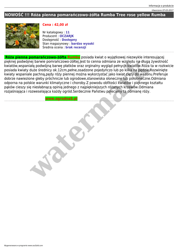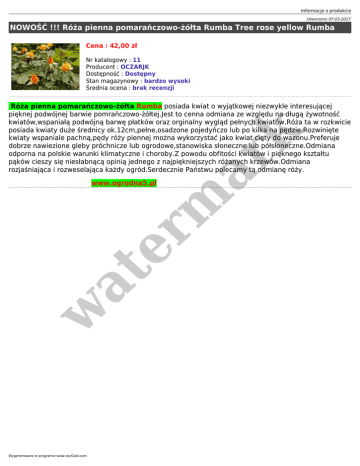 Informacje o produkcie Utworzono 07-03-2017 NOWOŚĆ !!! Róża pienna pomarańczowo-żółta Rumba Tree rose yellow Rumba Cena : 42,00 zł Nr katalogowy : 11 Producent : OCZARJK Dostępność : Dostępny Stan magazynowy : bardzo wysoki Średnia ocena : brak recenzji er m ar k Róża pienna pomarańczowo-żółta Rumba posiada kwiat o wyjątkowej niezwykle interesującej pięknej podwójnej barwie pomrańczowo-żółtej.Jest to cenna odmiana ze względu na długą żywotność kwiatów,wspaniałą podwójną barwę płatków oraz orginalny wygląd pełnych kwiatów.Róża ta w rozkwicie posiada kwiaty duże średnicy ok.12cm,pełne,osadzone pojedyńczo lub po kilka na pędzie.Rozwinięte kwiaty wspaniale pachną,pędy róży piennej można wykorzystać jako kwiat cięty do wazonu.Preferuje dobrze nawiezione gleby próchnicze lub ogrodowe,stanowiska słoneczne lub półsłoneczne.Odmiana odporna na polskie warunki klimatyczne i choroby.Z powodu obfitości kwiatów i pięknego kształtu pąków cieszy się niesłabnącą opinią jednego z najpiękniejszych różanych krzewów.Odmiana rozjaśniająca i rozweselająca każdy ogród.Serdecznie Państwu polecamy tą odmianę róży. w at www.ogrodna5.pl Wygenerowano w programie www.oscGold.com