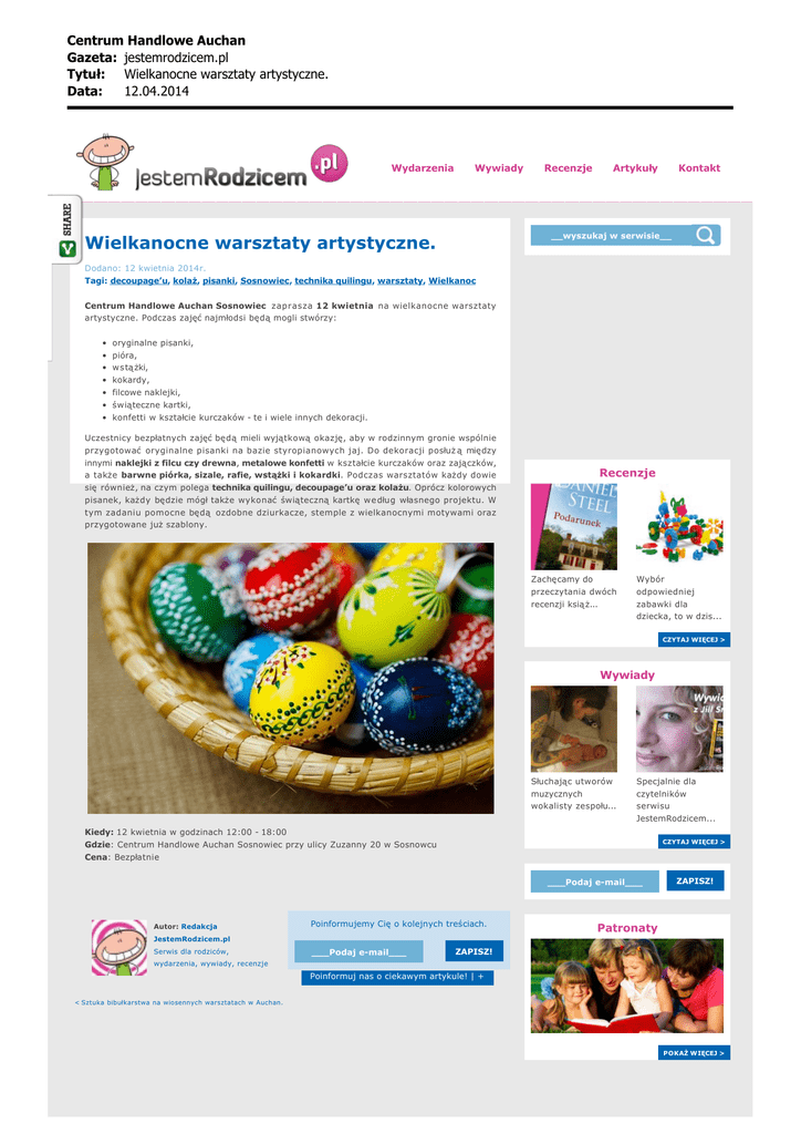 Centrum Handlowe Auchan Gazeta: jestemrodzicem.pl Tytu³: Wielkanocne warsztaty artystyczne. Data: 12.04.2014 Wydarzenia Wywiady Recenzje Artykuły Kontakt __wyszukaj w serwisie__ Wielkanocne warsztaty artystyczne. Dodano: 12 kwietnia 2014r. Tagi: decoupage’u, kolaż, pisanki, Sosnowiec, technika quilingu, warsztaty, Wielkanoc Centrum Handlowe Auchan Sosnowiec zaprasza 12 kwietnia na wielkanocne warsztaty artystyczne. Podczas zajęć najmłodsi będą mogli stwórzy: • oryginalne pisanki, • pióra, • wstą żki, • kokardy, • filcowe naklejki, • świąteczne kartki, • konfetti w kształcie kurczaków - te i wiele innych dekoracji. Uczestnicy bezpłatnych zajęć będą mieli wyjątkową okazję, aby w rodzinnym gronie wspólnie przygotować oryginalne pisanki na bazie styropianowych jaj. Do dekoracji posłuż ą między innymi naklejki z filcu czy drewna, metalowe konfetti w kształcie kurczaków oraz zajączków, a także barwne piórka, sizale, rafie, wstążki i kokardki. Podczas warsztatów każdy dowie Recenzje się również, na czym polega technika quilingu, decoupage’u oraz kolażu. Oprócz kolorowych pisanek, każdy będzie mógł także wykonać świąteczną kartkę w e dług własnego projektu. W tym zadaniu pomocne będą ozdobne dziurkacze, stemple z wielkanocnymi motywami oraz przygotowane już szablony. Zachęcamy do przeczytania dwóch recenzji ksią ż... Wybór odpowiedniej zabawki dla dziecka, to w dzis... CZYTAJ WIĘCEJ > Wywiady Słuchając utworów muzycznych Specjalnie dla czytelników wokalisty zespołu... serwisu JestemRodzicem... Kiedy: 12 kwietnia w godzinach 12:00 - 18:00 CZYTAJ WIĘCEJ > Gdzie: Centrum Handlowe Auchan Sosnowiec przy ulicy Zuzanny 20 w Sosnowcu Cena: Bezpłatnie ___Podaj e-mail___ Autor: Redakcja Poinformujemy Cię o kolejnych treściach. ZAPISZ! Patronaty JestemRodzicem.pl Serwis dla rodziców, ___Podaj e-mail___ ZAPISZ! wydarzenia, wywiady, recenzje Poinformuj nas o ciekawym artykule! | + < Sztuka bibułkarstwa na wiosennych warsztatach w Auchan. POKAŻ W IĘCEJ > Centrum Handlowe Auchan Gazeta: jestemrodzicem.pl Tytu³: Wielkanocne warsztaty artystyczne. Data: 12.04.2014 Partnerzy serwisu: