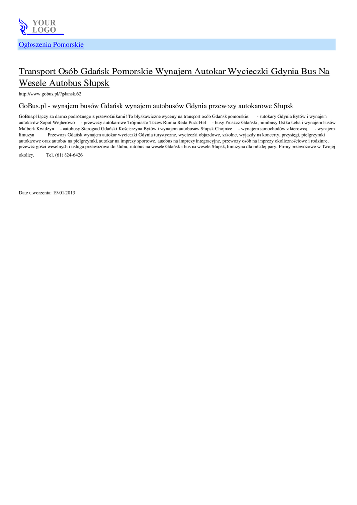 Ogłoszenia Pomorskie Transport Osób Gdańsk Pomorskie Wynajem Autokar Wycieczki Gdynia Bus Na Wesele Autobus Słupsk http://www.gobus.pl/?gdansk,62 GoBus.pl - wynajem busów Gdańsk wynajem autobusów Gdynia przewozy autokarowe Słupsk GoBus.pl łączy za darmo podróżnego z przewoźnikami! To błyskawiczne wyceny na transport osób Gdańsk pomorskie: - autokary Gdynia Bytów i wynajem autokarów Sopot Wejherowo - przewozy autokarowe Trójmiasto Tczew Rumia Reda Puck Hel - busy Pruszcz Gdański, minibusy Ustka Łeba i wynajem busów Malbork Kwidzyn - autobusy Starogard Gdański Kościerzyna Bytów i wynajem autobusów Słupsk Chojnice - wynajem samochodów z kierowcą - wynajem limuzyn Przewozy Gdańsk wynajem autokar wycieczki Gdynia turystyczne, wycieczki objazdowe, szkolne, wyjazdy na koncerty, przysięgi, pielgrzymki autokarowe oraz autobus na pielgrzymki, autokar na imprezy sportowe, autobus na imprezy integracyjne, przewozy osób na imprezy okolicznościowe i rodzinne, przewóz gości weselnych i usługa przewozowa do ślubu, autobus na wesele Gdańsk i bus na wesele Słupsk, limuzyna dla młodej pary. Firmy przewozowe w Twojej okolicy. Tel. (61) 624-6426 Date utworzenia: 19-01-2013