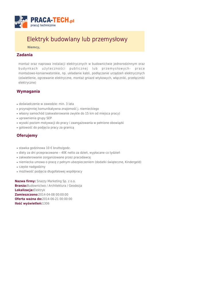 Elektryk budowlany lub przemysłowy Niemcy, Zadania montaż oraz naprawa instalacji elektrycznych w budownictwie jednorodzinnym oraz budynkach użyteczności publicznej lub przemysłowych- prace montażowo-konserwatorskie, np. układanie kabli, podłączanie urządzeń elektrycznych (oświetlenie, ogrzewanie elektryczne, montaż gniazd wtykowych, włączniki, przełączniki elektryczne) Wymagania ● ● ● ● ● ● doświadczenie w zawodzie: min. 3 lata przynajmniej komunikatywna znajomość j. niemieckiego własny samochód (zakwaterowanie zwykle do 15 km od miejsca pracy) uprawnienia grupy SEP wysoki poziom motywacji do pracy i zaangażowania w pełnione obowiązki gotowość do podjęcia pracy za granicą Oferujemy ● ● ● ● ● ● stawka godzinowa 10 € brutto/godz. diety za dni przepracowane – 40€ netto za dzień, wypłacane co tydzień zakwaterowanie zorganizowane przez pracodawcę niemiecka umowa o pracę z pełnym ubezpieczeniem (dodatki świąteczne, Kindergeld) częste nadgodziny możliwość podjęcia długofalowej współpracy Nazwa firmy: Snazzy Marketing Sp. z o.o. Branża:Budownictwo / Architektura / Geodezja Lokalizacja:Elektryk Zamieszczono:2014-04-08 00:00:00 Oferta ważna do:2014-06-21 00:00:00 Ilość wyświetleń:1306