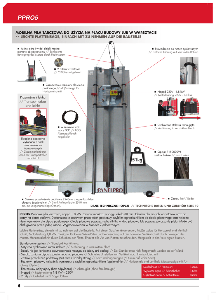 PPRO5 MOBILNA PIŁA TARCZOWA DO UŻYCIA NA PLACU BUDOWY LUB W WARSZTACIE // LEICHTE PLATTENSÄGE, EINFACH MIT ZU NEHMEN AUF DIE BAUSTELLE � Ruchw górę i w dół dzięki mecha- � Prowadzenie po rurach cynkowanych // Einfache Führung auf verzinkten Rohren nizmowi sprężynowemu // Senkrechte Bewegung des Motors durch Federsystem � 2 ostrza w zestawie // 2 Blätter mitgeliefert � Zaznaczanie rozmiaru dla cięcia poziomego // Maβanzeige für Horizontalschnitt � Napęd 220V - 1.8 kW // Motorleistung 220V - 1,8 kW Przenośna i lekka // Transportierbar und leicht � Cynkowana stalowa rama gięta � w zestawie wąż Składana podstawka wykonana z rurek oraz zestaw kół transportowych // Zusammenfaltbarer Stand mit Transportrollensehr leicht // Ausführung in verzinktem Blech ssący ECO // ECO Absaugschlouch mitgeliefert � Opcja: 715009094 51kg � Stalowe przedłużenie podstawy 2540mm z ogranicznikiem długości (opcjonalnie) // Stahl Auflagefläche 2540 mm ext. mit Längenanschlag (Option). zestaw haków // Satz Haken � Zestaw kół// Räder DANE TECHNICZNE I OPCJE // TECHNISCHE DATEN UND ZUBEHÖR SEITE 10 PPRO5 Pionowa piła tarczowa, napęd 1.8 kW. Łatwaw montażu w ciągu około 30 min. Idealna dla małych warsztatów oraz do pracy na placu budowy. Dostarczana z zestawem przedłużeń podstawy, szybkim ogranicznikiem do cięcia pionowego oraz wskazaniem wymiarów dla cięcia poziomego. Cięcie pionowe poprzez ruchu silnika w dół, pionowo lub poprzez poruszanie płytą. Może być obsługiwana przez jedną osobę. Wyprodukowana w Stanach Zjednoczonych. Leichte Plattensäge, einfach mit zu nehmen auf die Baustelle. Mit einem Satz Verlängerungen, Maβanzeige für Horizontal- und Vertikalschnitt, Motorleistung 1,8 kW. Geeignet für kleine Werkstätten und Verwendung auf der Baustelle. Vertikalschnitt durch Bewegen des Motors, Horizontalschnitt durch Schieben der Platte. Erlaubt alle Art von Platten zu schneiden. Hergestellt in den Vereinigten Staaten. Standardowy zestaw // Standard Ausführung: - Sztywna cynkowana rama stalowa // Ausführung in verzinktem Blech - Stojak, nie jest konieczne przymocowanie maszyny do ściany ani podłogi // Der Ständer muss nicht festgemacht werden an der Wand - Szybka zmiana cięcia z poziomego na pionowe // Schnelles Umstellen von Vertikal- nach Horizontalschnitt - Zestaw przedłużeń podstawy (500mm z każdej strony) // Satz Verlängerungen (500mm auf jeder Seite) - Poziomy i pionowy wskaźnik wymiarów z szybkim ogranicznikiem (opcjonalnie) // Horizontale und vertikale Massanzeige mit Anschlag (Option) Dokładność // Präzision: 1,0mm - Eco zestaw odpylający (bez odpylacza) // Absaugkit (ohne Staubsauger) Wysokość cięcia // Schnitthöhe: 1,62m - Napęd // Motorleistung 1,8 kW – 220V Głębokość cięcia // Schnitttiefe: 45mm - 2 piły // Geliefert mit 2 Sägeblättern. 4