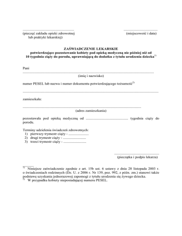 ........................................................ (pieczęć zakładu opieki zdrowotnej lub praktyki lekarskiej) ..................................... (miejscowość i data) ZAŚWIADCZENIE LEKARSKIE potwierdzające pozostawanie kobiety pod opieką medyczną nie później niŜ od 10 tygodnia ciąŜy do porodu, uprawniającą do dodatku z tytułu urodzenia dziecka1) Pani ............................................................................................................................................... (imię i nazwisko) numer PESEL lub nazwa i numer dokumentu potwierdzającego toŜsamość2) .................................................................................................................................................... zamieszkała: ................................................................................................................................. (adres zamieszkania) pozostawała pod opieką medyczną od .............................................. tygodnia ciąŜy do porodu. Terminy udzielenia świadczeń zdrowotnych: 1) pierwszy trymestr ciąŜy - ...................... 2) drugi trymestr ciąŜy - ......................... 3) trzeci trymestr ciąŜy - ......................... ................................................. (pieczątka i podpis lekarza) ______ 1) Niniejsze zaświadczenie zgodnie z art. 15b ust. 6 ustawy z dnia 28 listopada 2003 r. o świadczeniach rodzinnych (Dz. U. z 2006 r. Nr 139, poz. 992, z późn. zm.) stanowi takŜe podstawę uzyskania jednorazowej zapomogi z tytułu urodzenia się Ŝywego dziecka. 2) W przypadku kobiety nieposiadającej numeru PESEL.