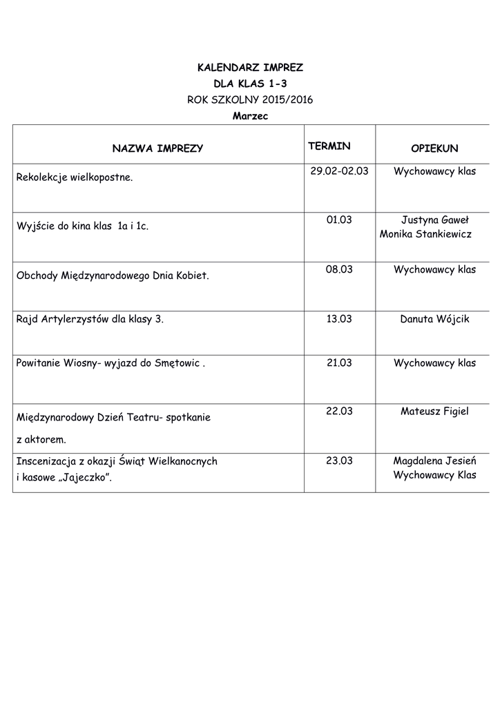 KALENDARZ IMPREZ DLA KLAS 1-3 ROK SZKOLNY 2015/2016