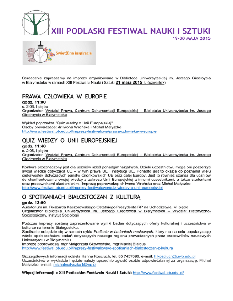 XIII PODLASKI FESTIWAL NAUKI I SZTUKI 19-30 MAJA 2015 Serdecznie zapraszamy na imprezy organizowane w Bibliotece Uniwersyteckiej im. Jerzego Giedroycia w Białymstoku w ramach XIII Festiwalu Nauki i Sztuki 21 maja 2015 r. (czwartek) PRAWA CZŁOWIEKA W EUROPIE godz. 11:00 s. 2.06, I piętro Organizator: Wydział Prawa, Centrum Dokumentacji Europejskiej – Biblioteka Uniwersytecka im. Jerzego Giedroycia w Białymstoku Wykład poprzedza "Quiz wiedzy o Unii Europejskiej". Osoby prowadzące: dr Iwona Wrońska i Michał Małyszko http://www.festiwal.pb.edu.pl/imprezy-festiwalowe/prawa-czlowieka-w-europie QUIZ WIEDZY O UNII EUROPEJSKIEJ godz. 11:40 s. 2.06, I piętro Organizator: Wydział Prawa, Centrum Dokumentacji Europejskiej – Biblioteka Uniwersytecka im. Jerzego Giedroycia w Białymstoku Konkurs przeznaczony jest dla uczniów szkół ponadgimnazjalnych. Dzięki uczestnictwu mogą oni poszerzyć swoją wiedzę dotyczącą UE – w tym prawa UE i instytucji UE. Ponadto jest to okazja do poznania wielu ciekawostek dotyczących państw członkowskich UE oraz całej Europy. Jest to również szansa dla uczniów do skonfrontowania swojej wiedzy z zakresu Unii Europejskiej z innymi uczestnikami, a także studentami oraz pracownikami akademickimi. Imprezę poprowadzą: dr Iwona Wrońska oraz Michał Małyszko http://www.festiwal.pb.edu.pl/imprezy-festiwalowe/quiz-wiedzy-o-unii-europejskiej O SPOTKANIACH BIAŁOSTOCZAN Z KULTURĄ godz. 13:00 Audytorium im. Ryszarda Kaczorowskiego Ostatniego Prezydenta RP na Uchodźstwie, VI piętro Organizator: Biblioteka Uniwersytecka im. Jerzego Giedroycia w Białymstoku – Wydział HistorycznoSocjologiczny, Instytut Socjologii Podczas imprezy zostaną zaprezentowane wyniki badań dotyczących oferty kulturalnej i uczestnictwa w kulturze na terenie Białegostoku. Spotkanie odbędzie się w ramach cyklu Podlasie w badaniach naukowych, który ma na celu popularyzację wśród społeczeństwa badań dotyczących naszego regionu prowadzonych przez pracowników naukowych Uniwersytetu w Białymstoku Imprezę poprowadzą: mgr Małgorzata Skowrońska, mgr Maciej Białous http://www.festiwal.pb.edu.pl/imprezy-festiwalowe/o-spotkaniach-bialostoczan-z-kultura Szczegółowych informacji udziela Hanna Kościuch, tel. 85 7457696, e-mail: [email protected] Uczestnictwo w wykładzie i quizie należy uprzednio zgłosić osobie odpowiedzialnej za organizację: Michał Małyszko, e-mail: [email protected] Więcej informacji o XIII Podlaskim Festiwalu Nauki i Sztuki: http://www.festiwal.pb.edu.pl/